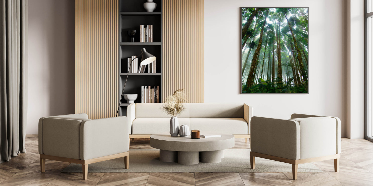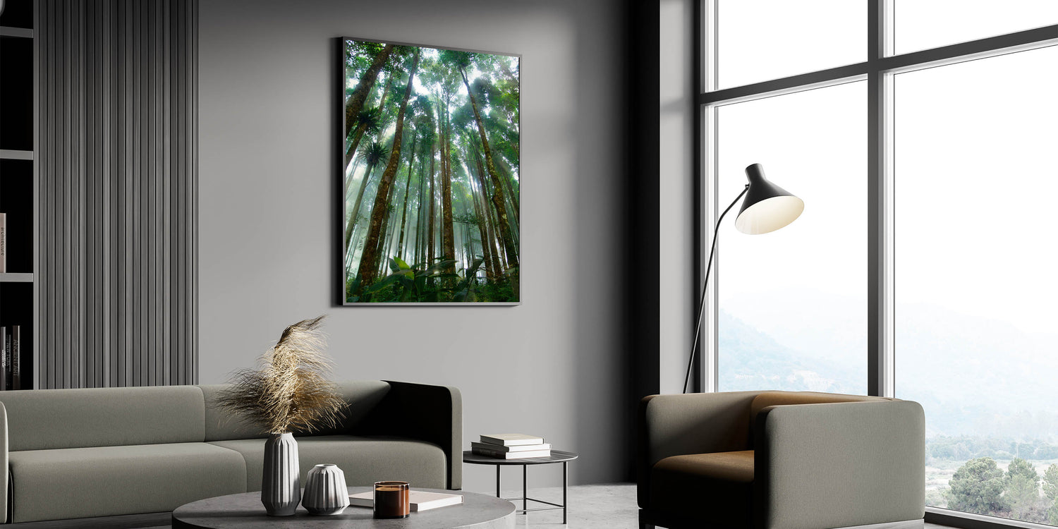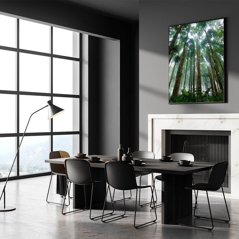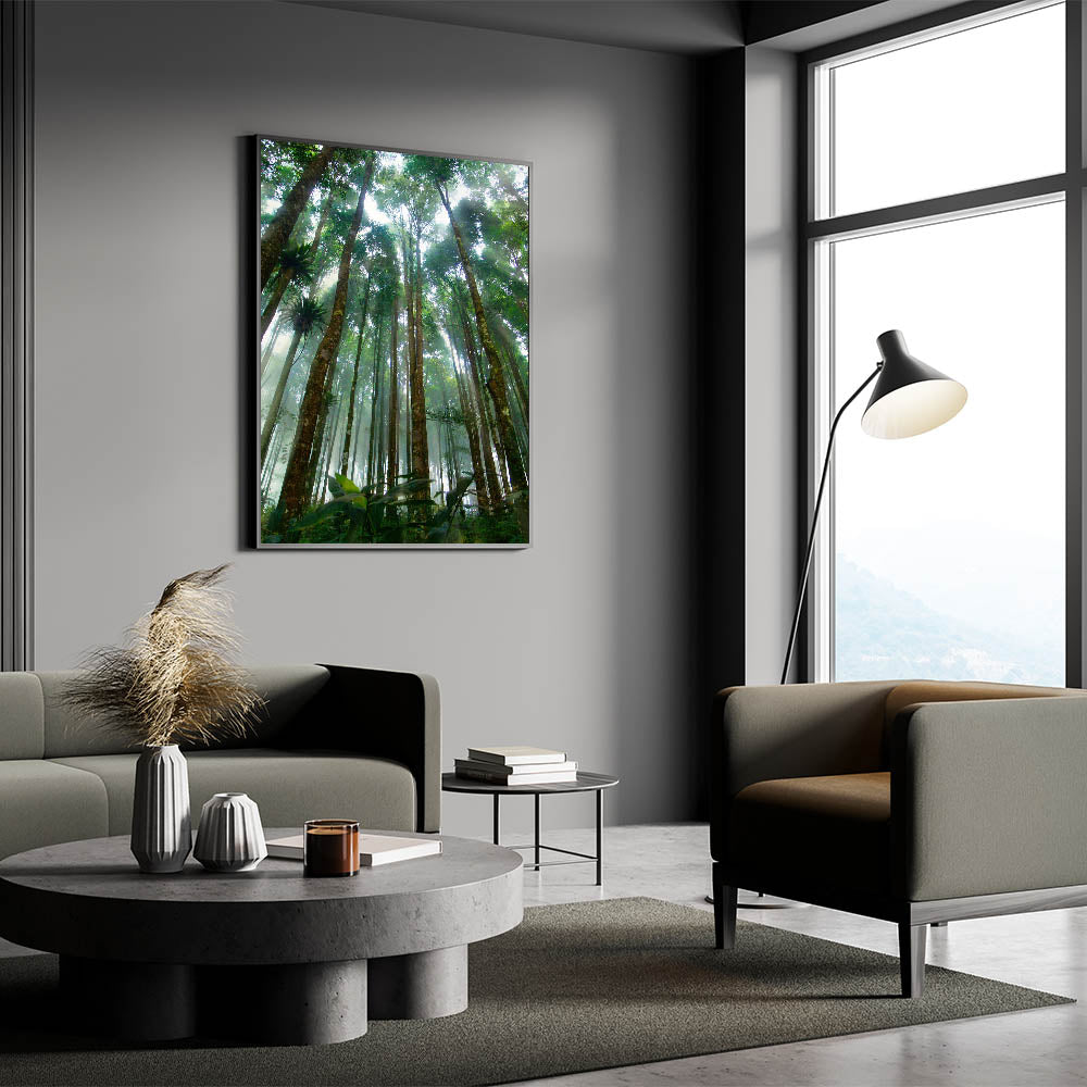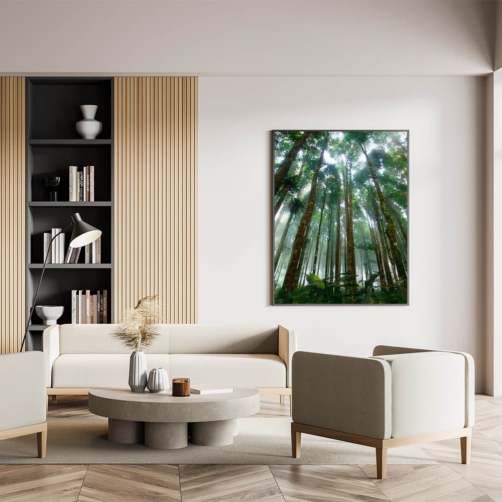 Immerse yourself in the awe-inspiring beauty of nature with our Towering Rainforest Trees Art. This stunning print captures the majesty of towering trees reaching towards the sky, bathed in soft, diffused light. The lush green foliage and the vertical lines of the trunks create a sense of grandeur and tranquility, making this artwork a perfect addition to any nature lover's home.