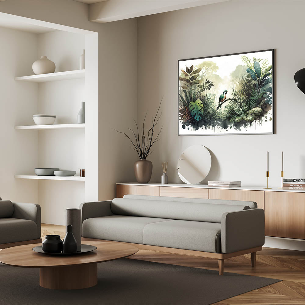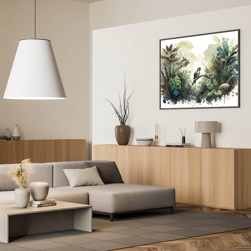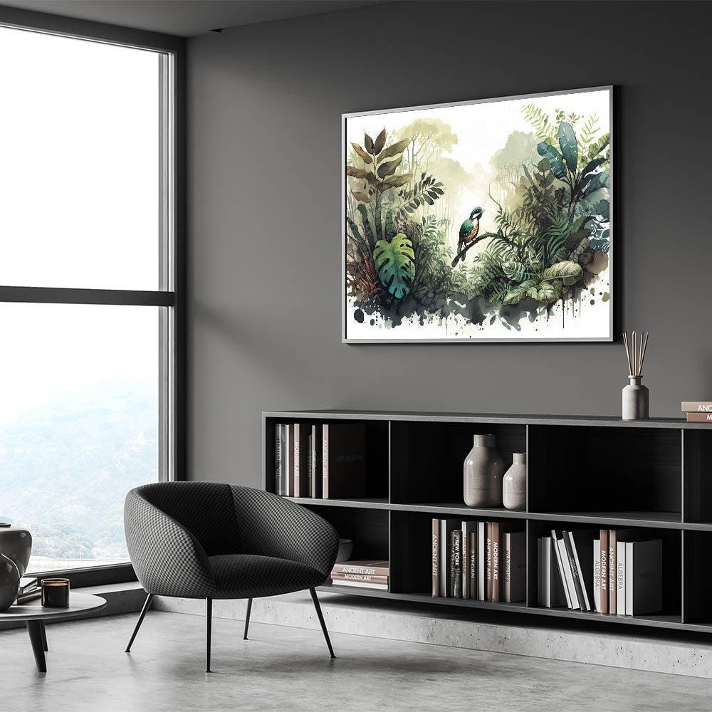 - High-quality canvas print showcasing a vibrant rainforest scene with a tropical bird.