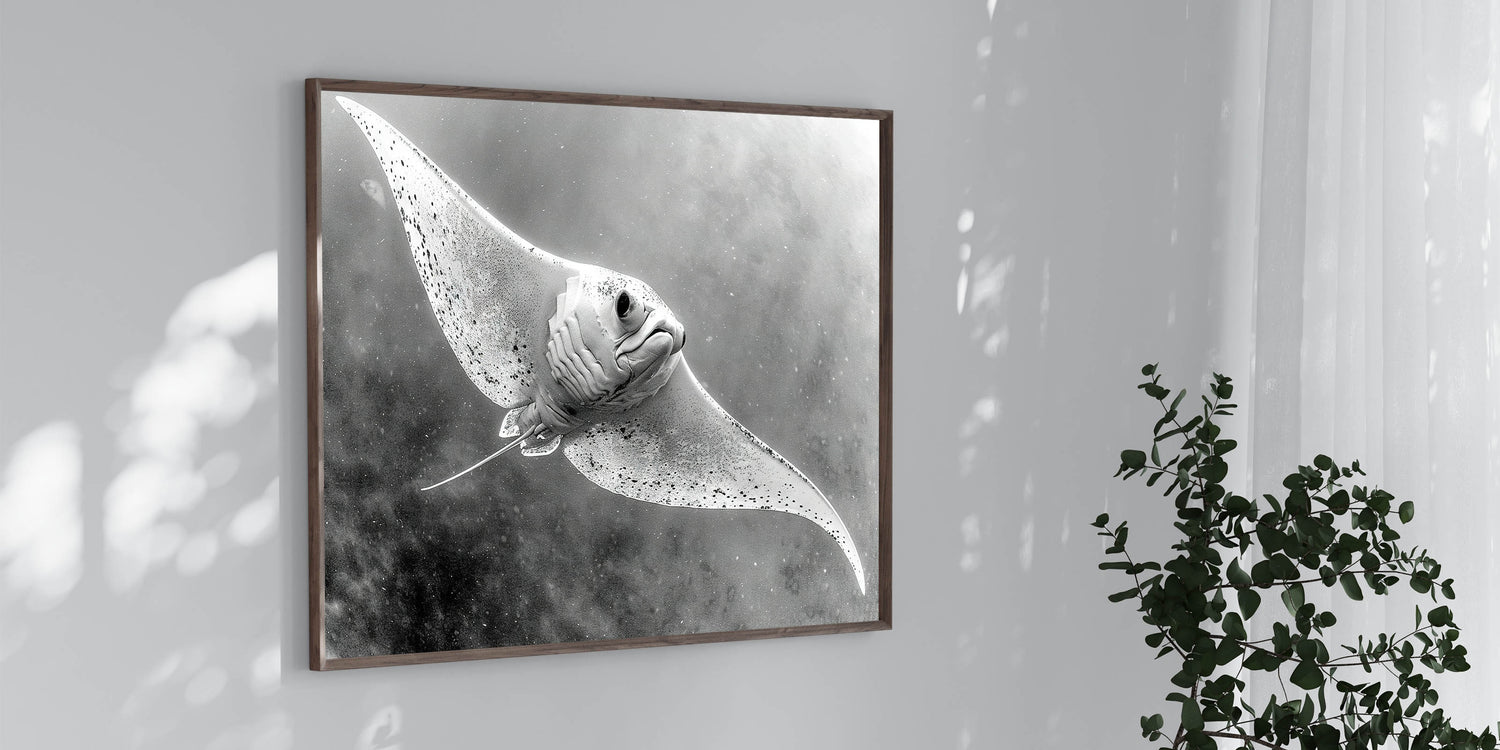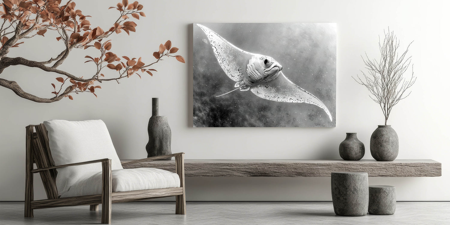 - Monochrome Masterpiece: Available in multiple formats, including stretched canvas, framed canvas, and acrylic glass, this piece is meticulously printed to highlight the subtle details of the ray’s form against a soft, blurred background.
