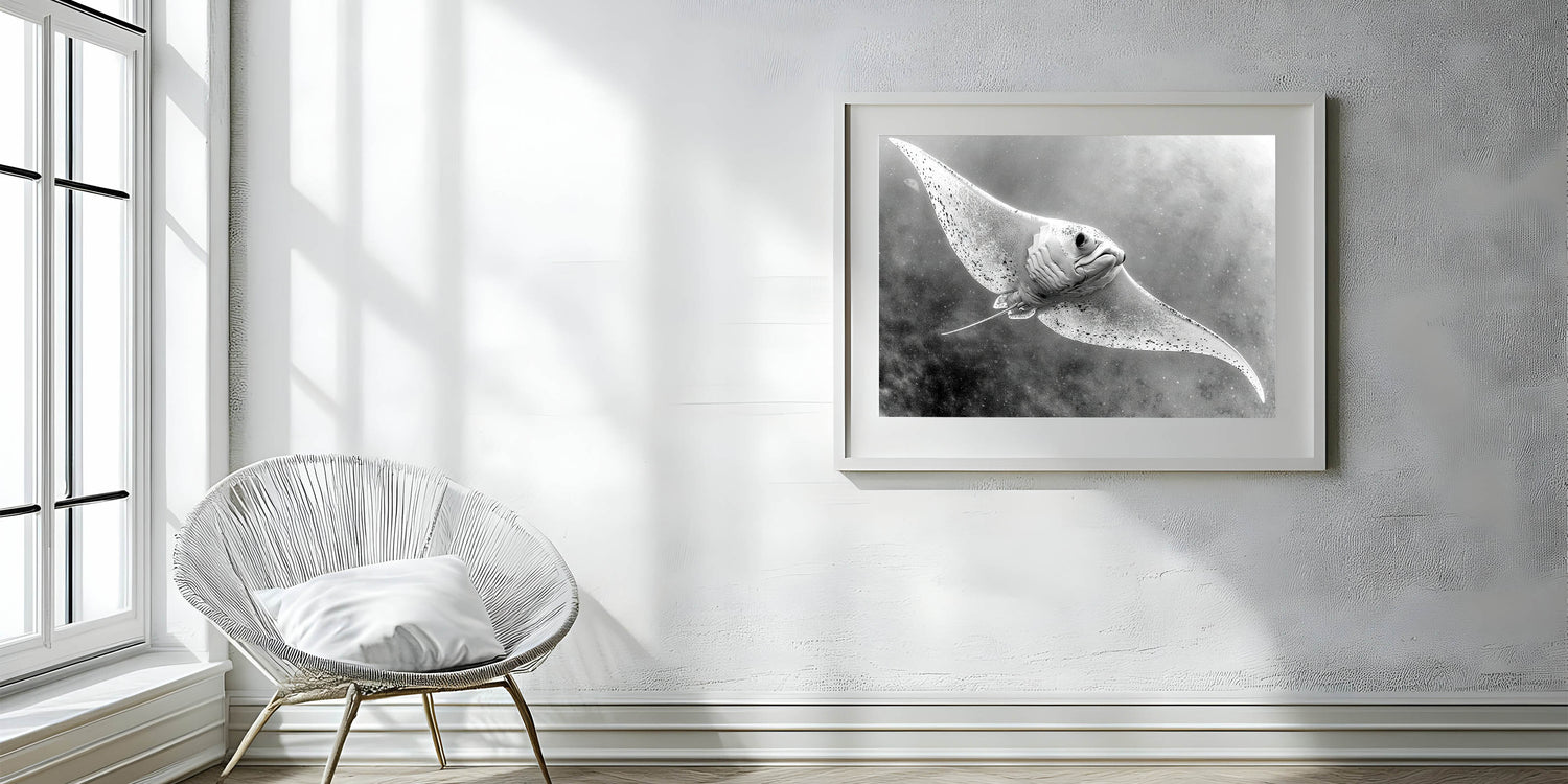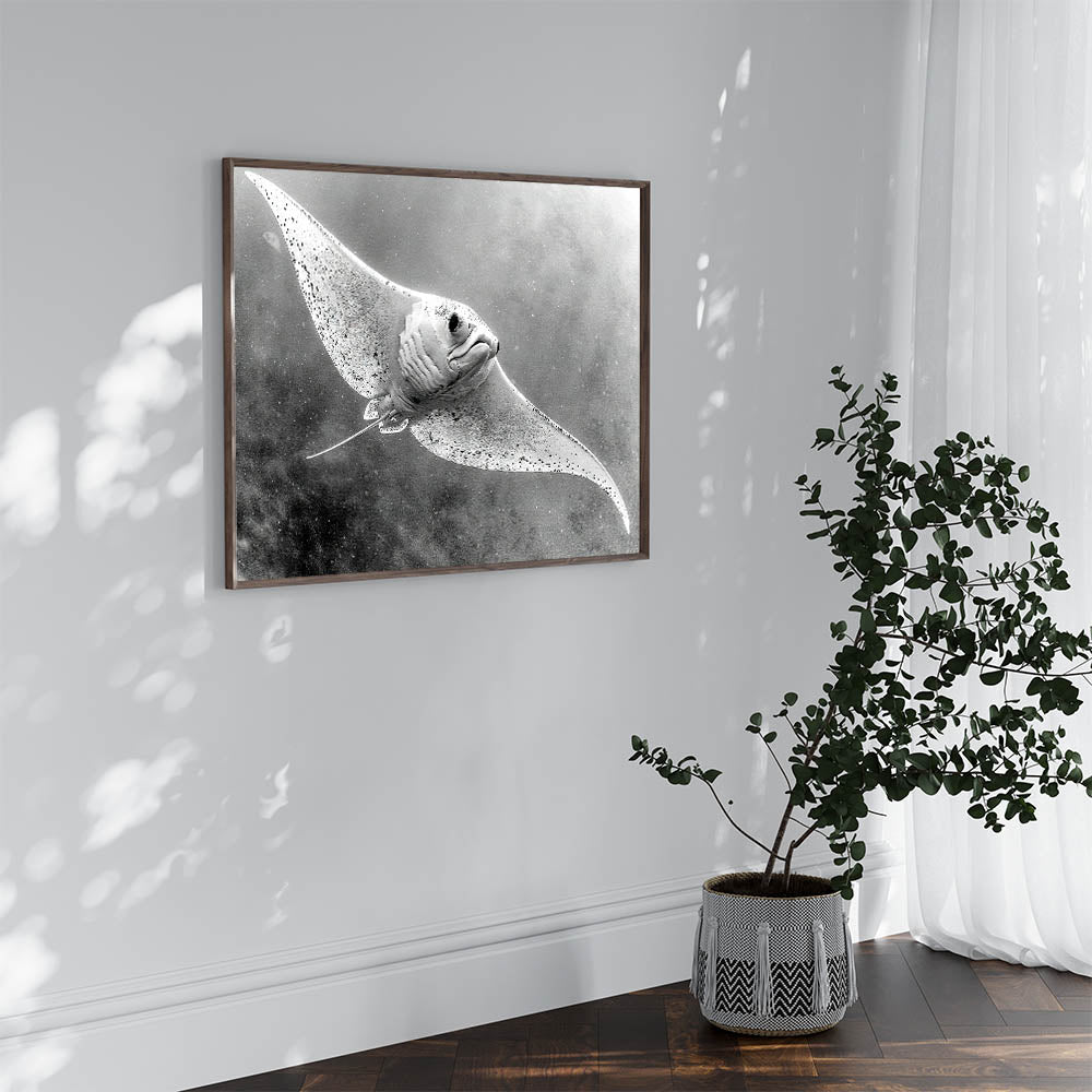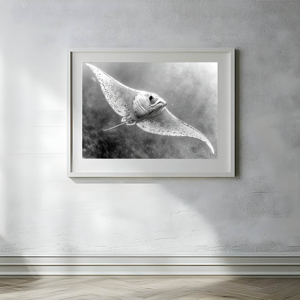 Experience the serene beauty of the ocean with this elegant ray wall art, rendered in stunning monochrome. This artwork captures the ethereal grace of a ray gliding through the water, making it a striking addition to any space.