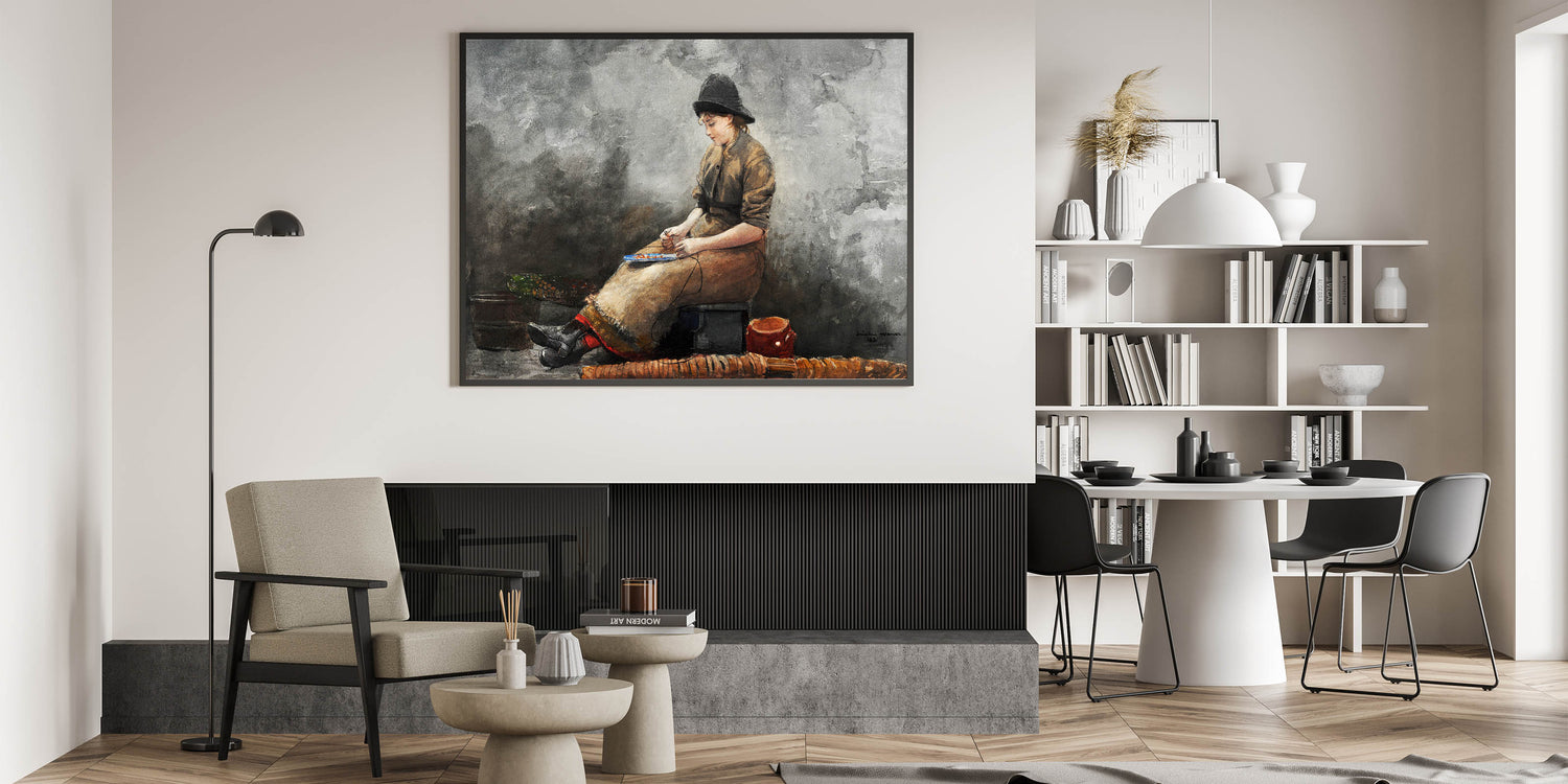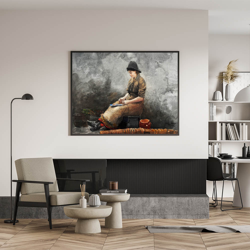 Experience the quiet determination of a working coastal life with "A Fishergirl Baiting Lines" by Winslow Homer. This realism artwork from 1881 captures a young fisherwoman preparing bait, her thoughtful expression and simple attire reflecting the resilience of life by the sea. Ideal for those who appreciate Realism Art Prints for Home Decor, this piece brings a serene yet powerful sense of livelihood and tradition to any space.
