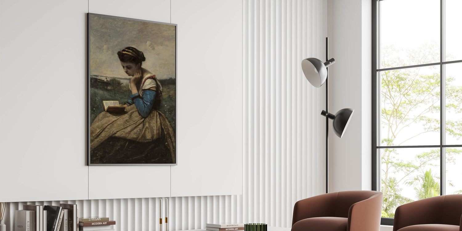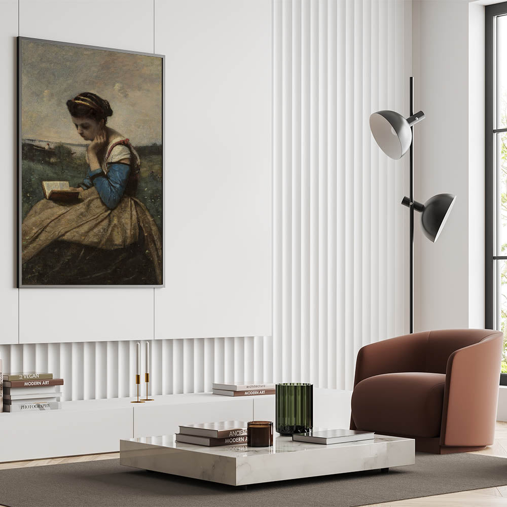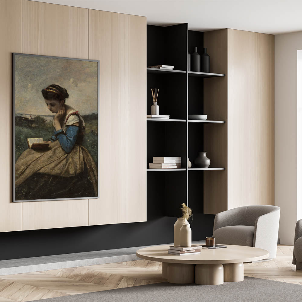 Add a touch of quiet elegance to your home with "A Woman Reading" Realism Art Print by Camille Corot. This captivating piece portrays a young woman engrossed in a book, seated outdoors in a tranquil, natural setting. Painted with the soft, refined brushwork characteristic of Corot’s style, the artwork exudes a sense of peace and contemplation. Perfect for lovers of classical realism and intimate portraits, this print brings depth and a contemplative atmosphere to any room.