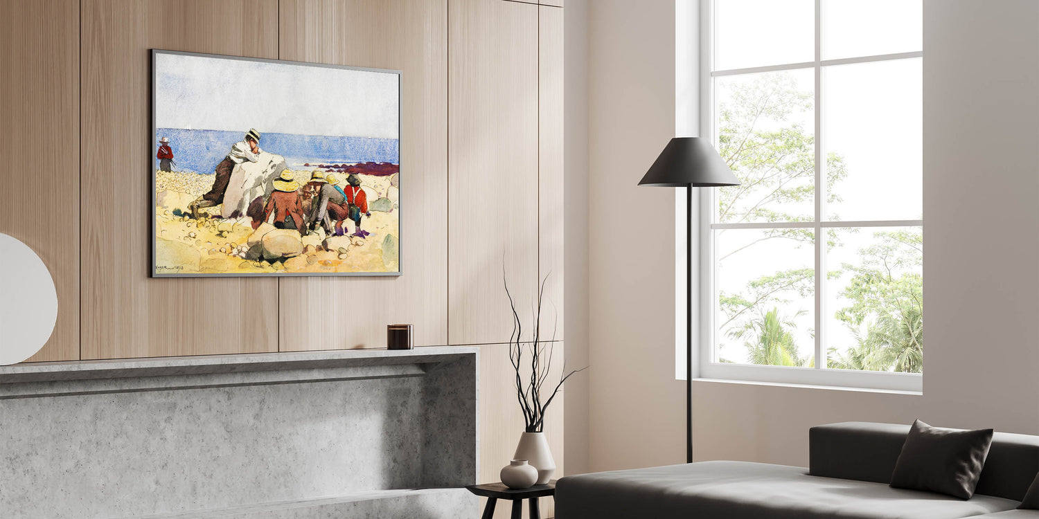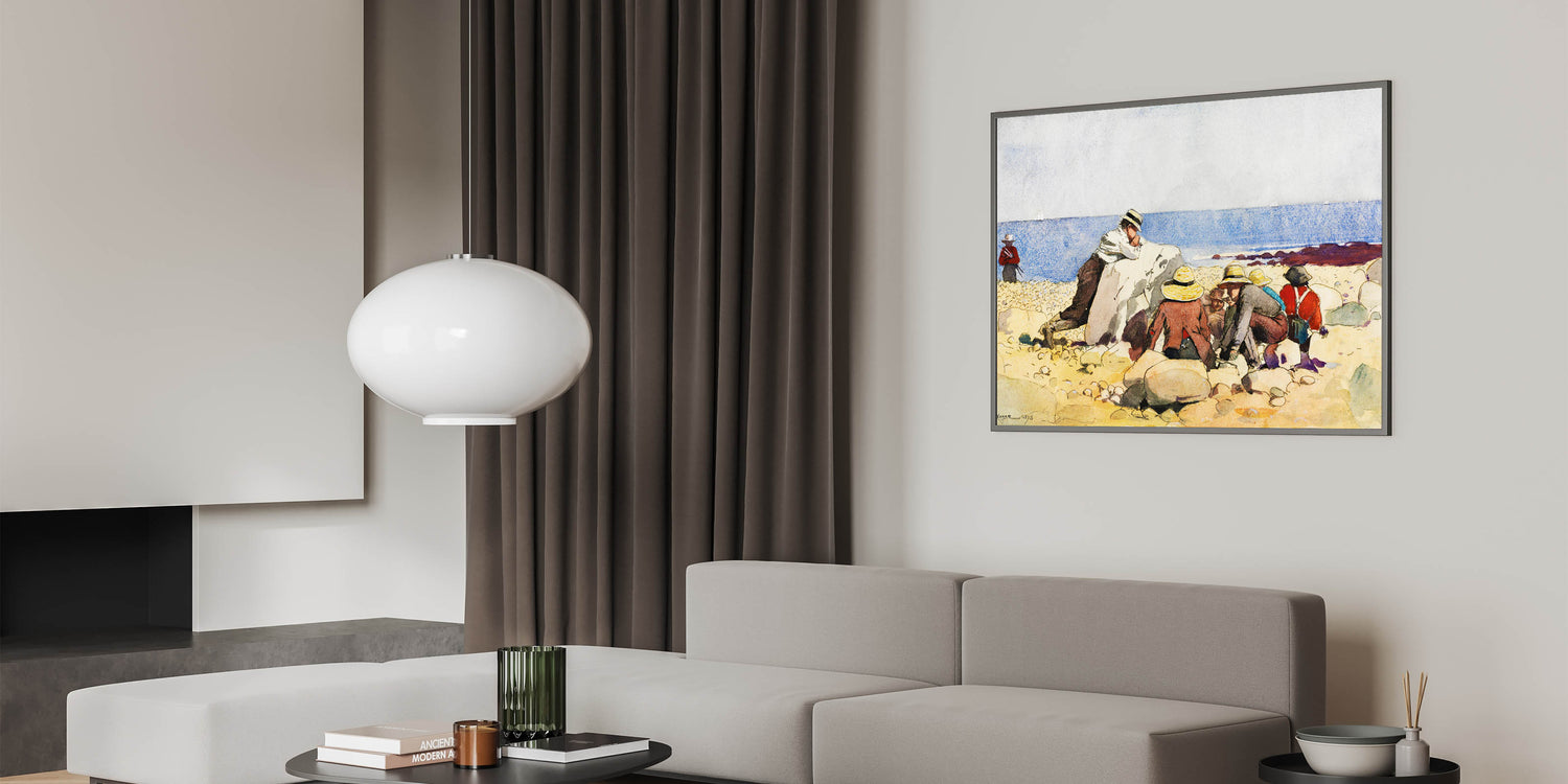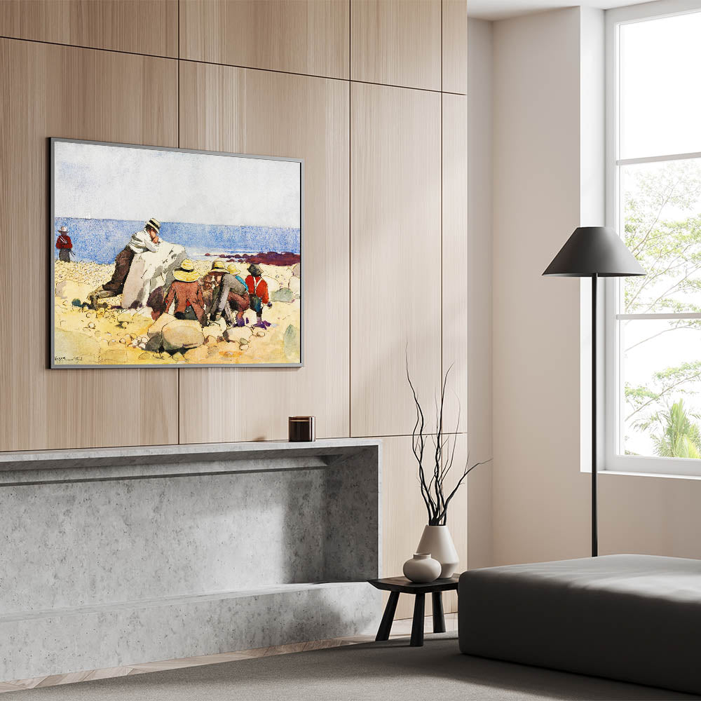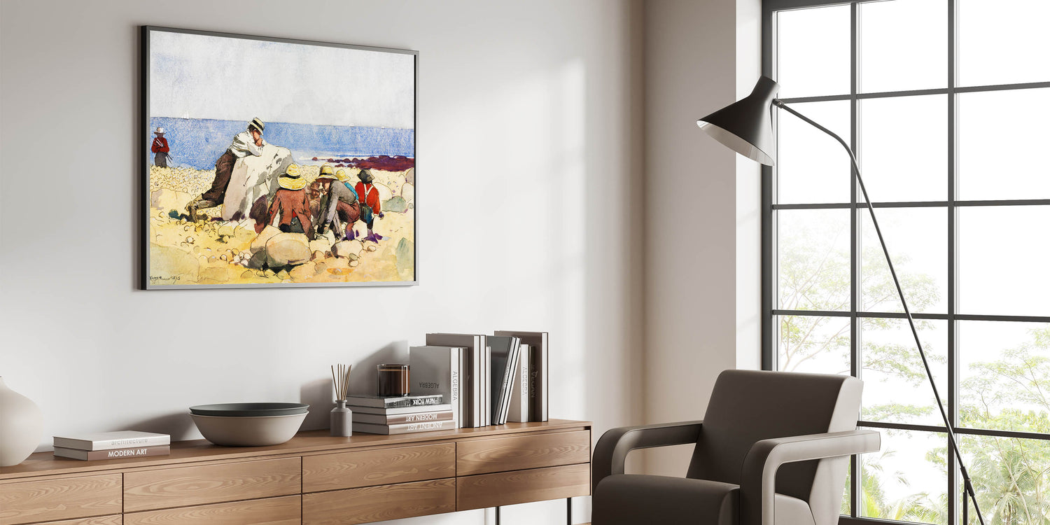 Step back in time with A Clam Bake (1873) by Winslow Homer, capturing a lively beach scene filled with figures engaged in the timeless tradition of a clam bake. This watercolor painting beautifully portrays a relaxed day by the sea, with Homer’s signature attention to light and detail that brings the scene to life. It’s an excellent piece for anyone looking to add a historical yet casual vibe to their space.
