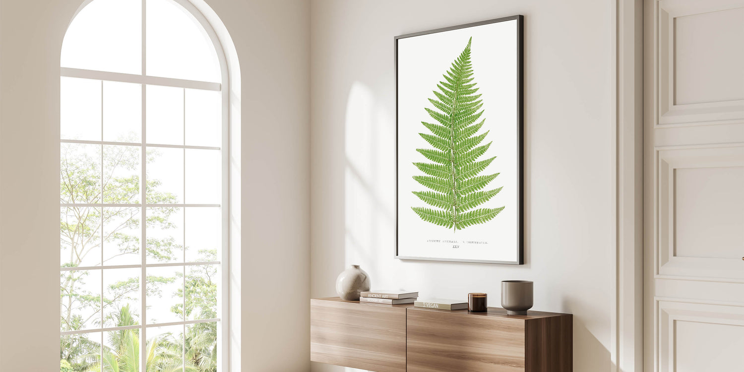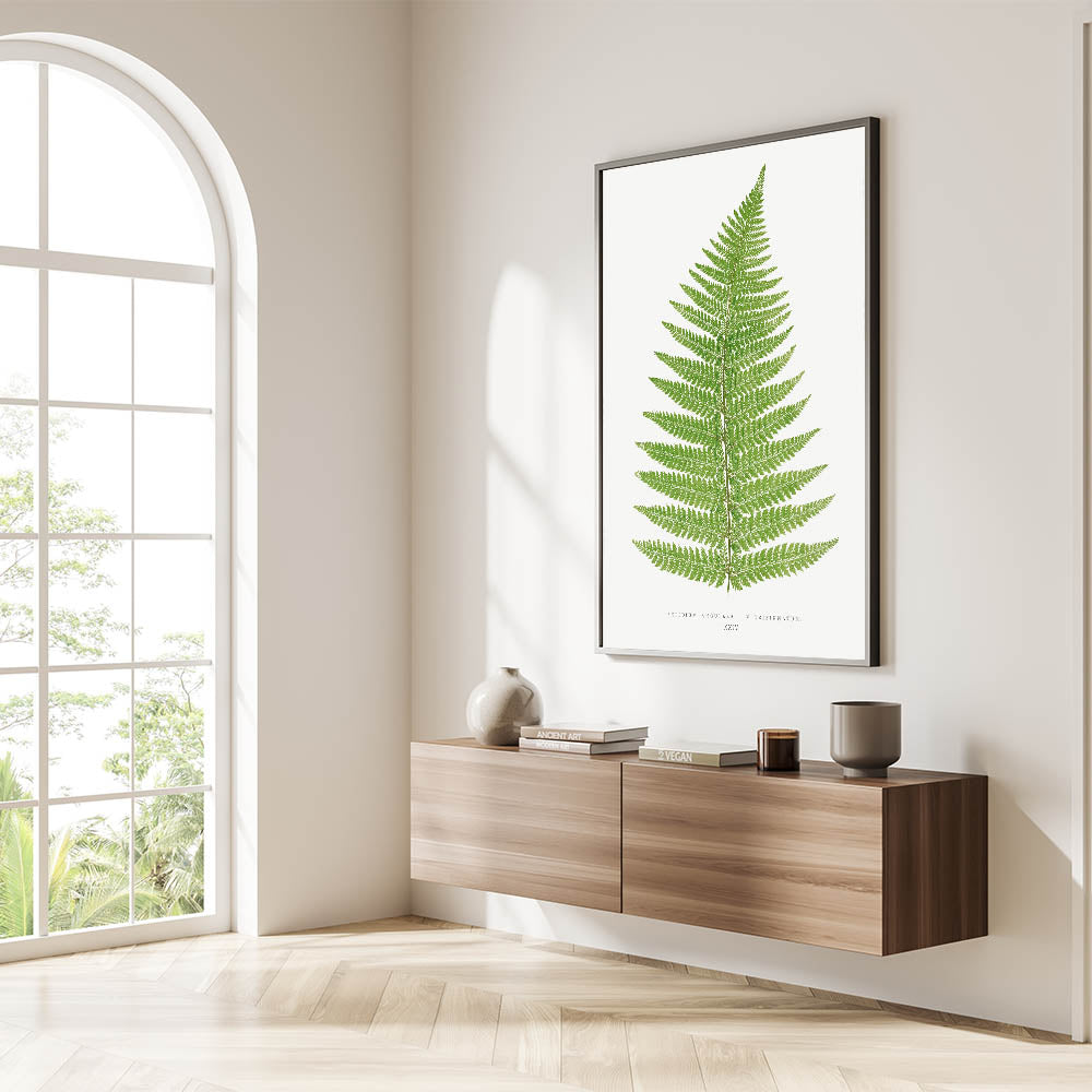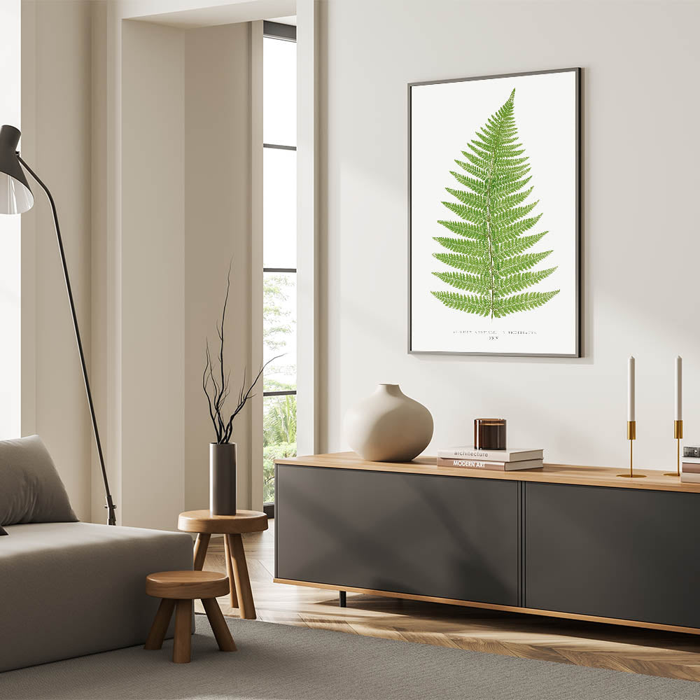 Add a touch of natural elegance to your space with this botanical Realism print, "Aspidium Angulare V. Tripinnatum," by Edward Joseph Lowe. This detailed illustration from Lowe's 1856-1860 collection captures the intricate beauty of a fern leaf in rich green tones, highlighting each delicate frond with scientific precision. Ideal for those who appreciate the beauty of nature and botanical art, this print brings a calming, verdant presence to any room.