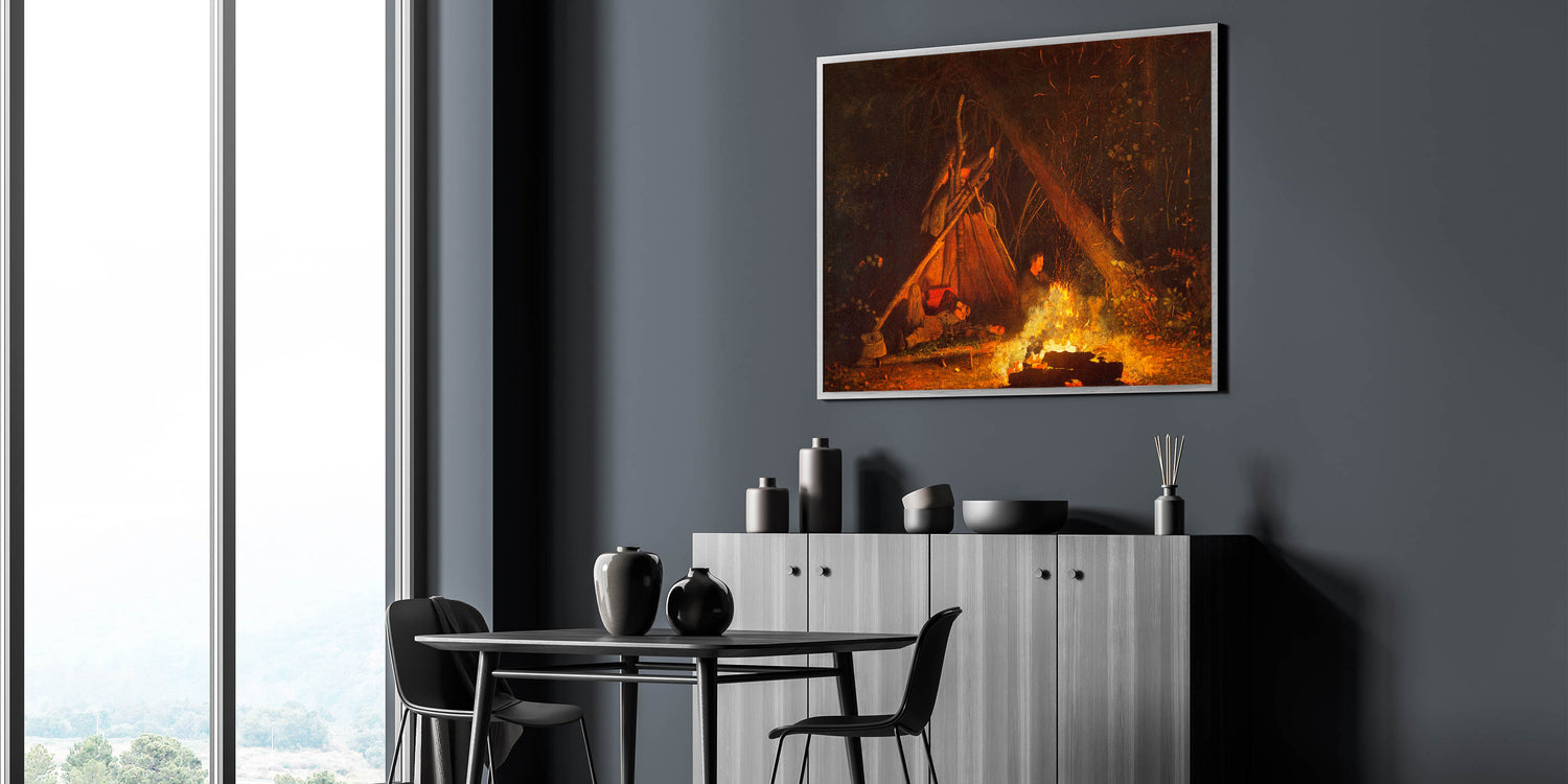 Capture the warmth and mystery of the wilderness with "Camp Fire" by Winslow Homer. This atmospheric realism artwork from 1880 depicts a nighttime camping scene, where the glow of a campfire illuminates two figures against a backdrop of dense forest. Ideal for lovers of Realism Art Prints for Home Decor, this piece brings a captivating sense of adventure and rustic charm to any space.