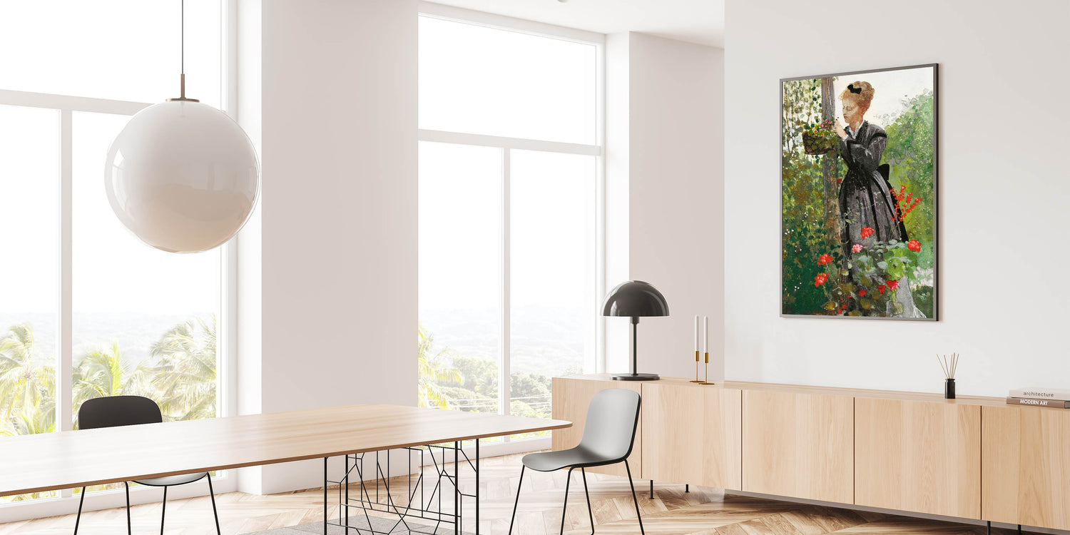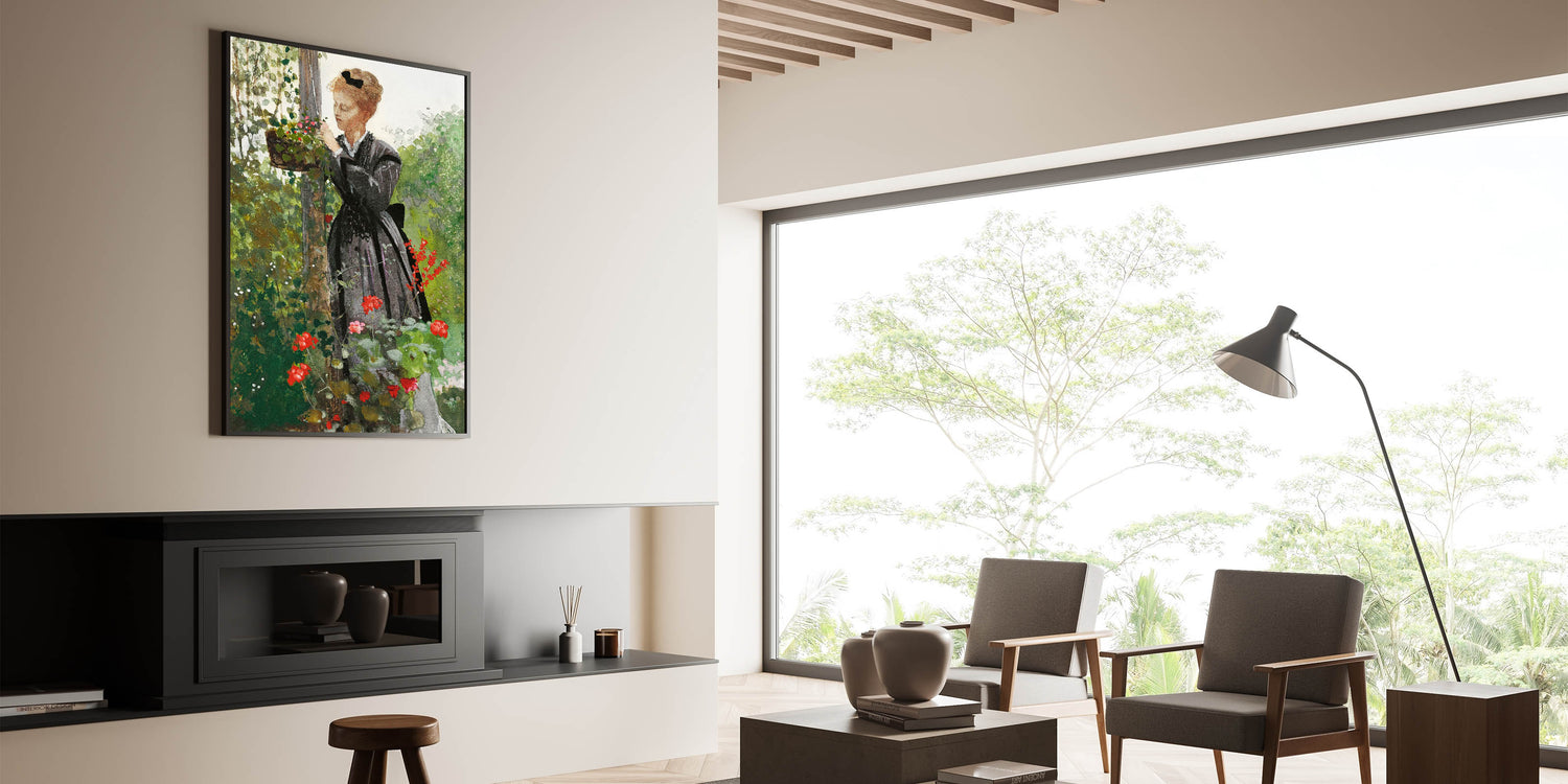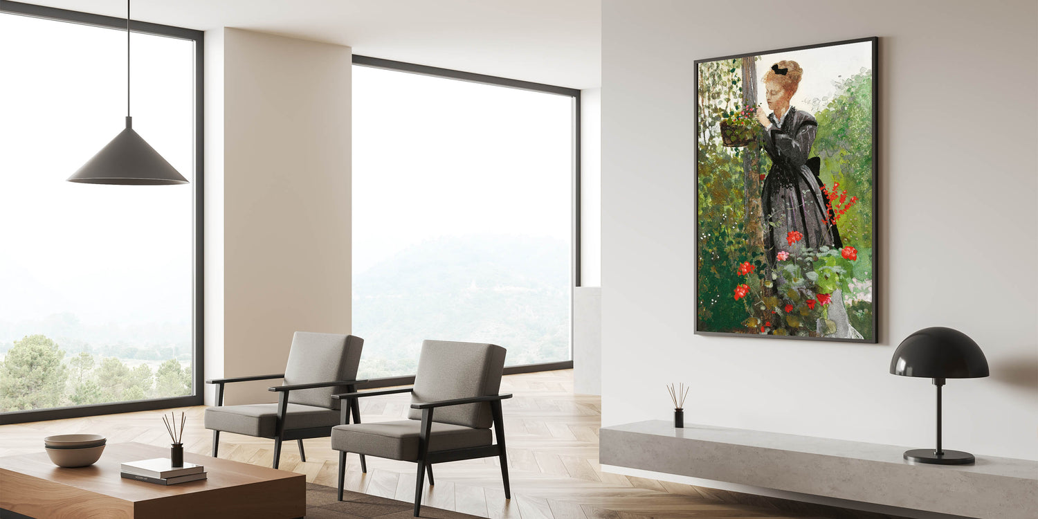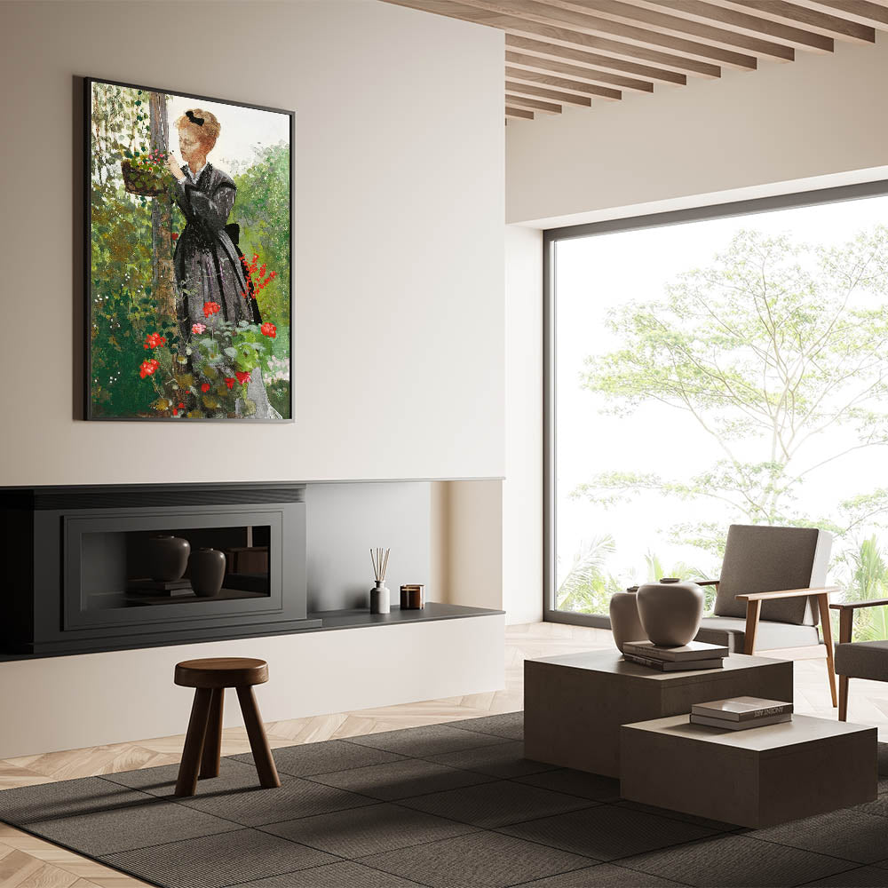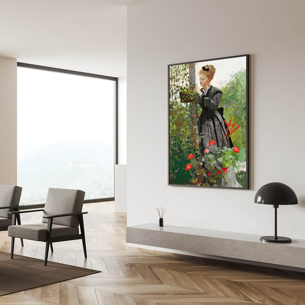 Enhance your decor with this beautiful "Summer" artwork by Winslow Homer, a captivating piece of Realism Art Prints for Home Decor. This classical scene features a woman standing among blooming red and pink flowers in a lush green garden, exuding timeless beauty and tranquility. Perfect for nature lovers and admirers of realistic art, this piece adds a touch of elegance to any room.