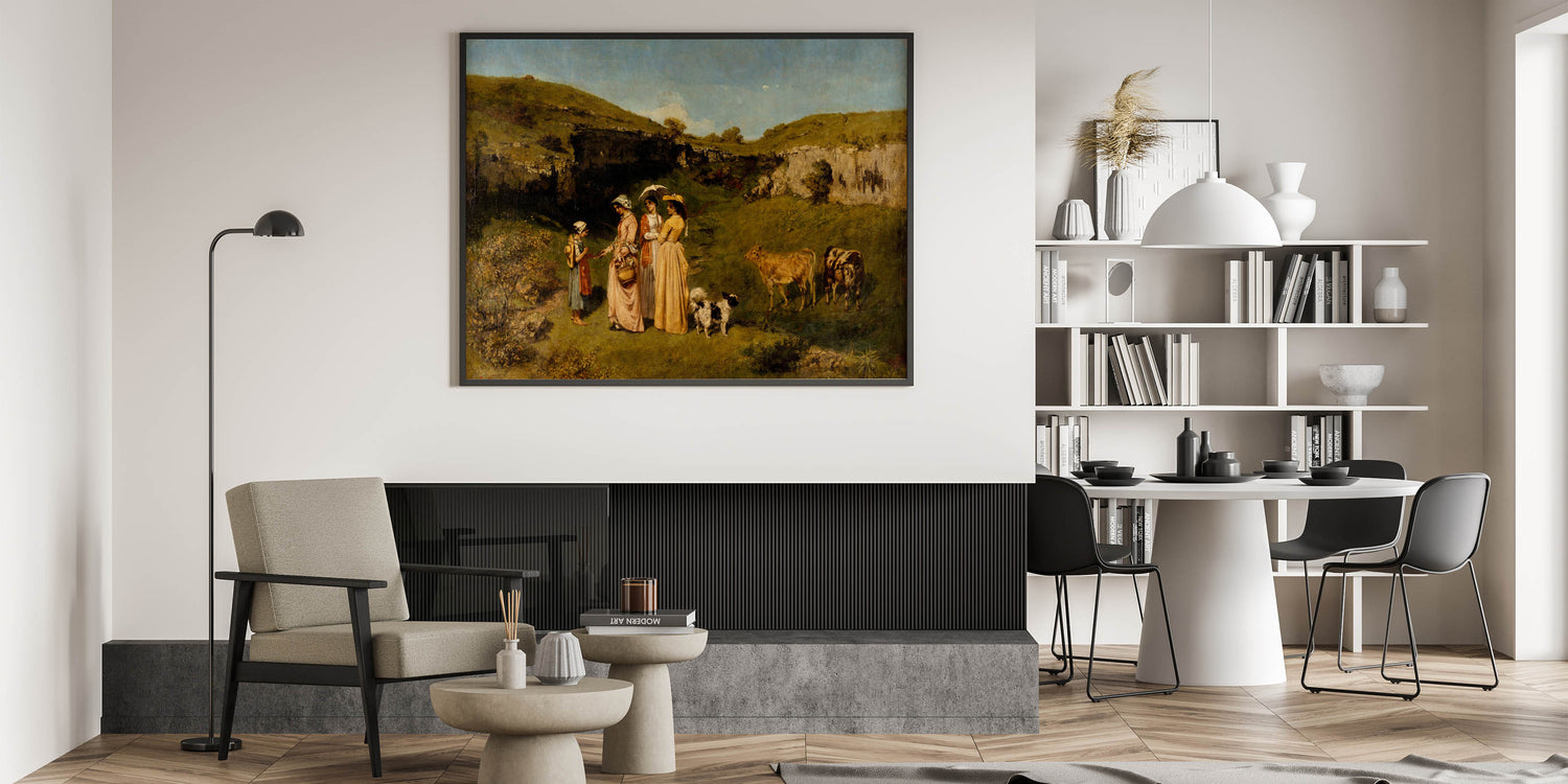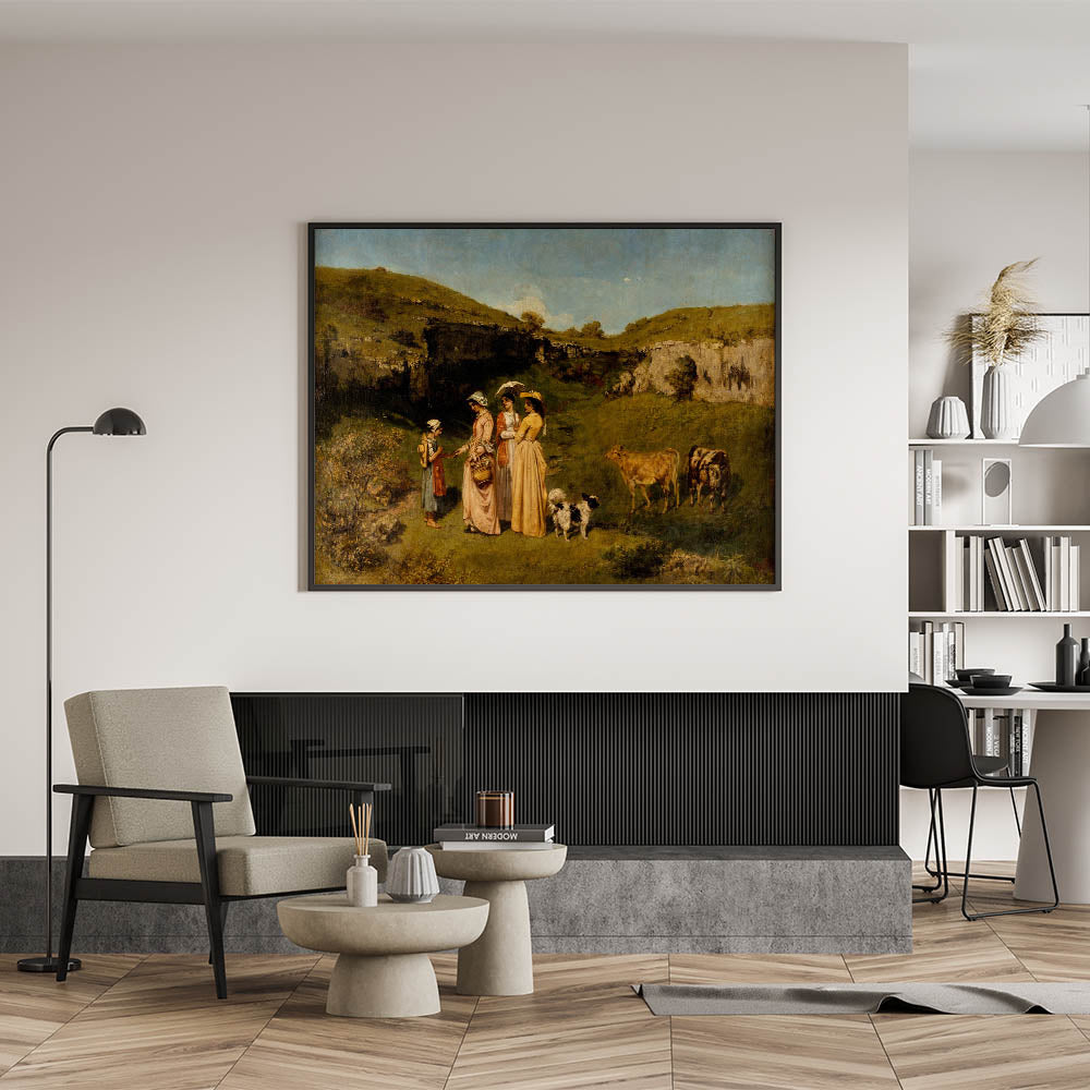 Experience the charm of rural life with "Young Ladies of the Village" by Gustave Courbet. This masterpiece of Realism Art Prints for Home Decor captures an idyllic scene of young ladies in graceful dresses interacting with a young girl in a picturesque countryside setting, complete with cows and rolling green hills. Perfect for lovers of classical art and nature-inspired interiors, this artwork brings a peaceful, pastoral beauty into your home.