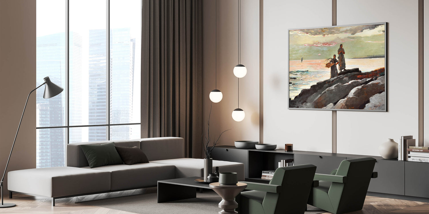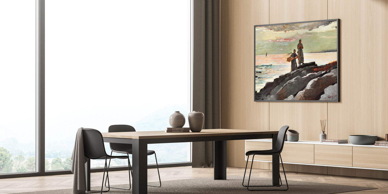 Immerse yourself in the serene beauty of Saco Bay (1896) by Winslow Homer, a compelling coastal scene that captures the quiet moments of life by the sea. This artwork depicts two figures against a backdrop of a soft sunset, highlighting Homer’s mastery in portraying natural light and human interaction with the environment.