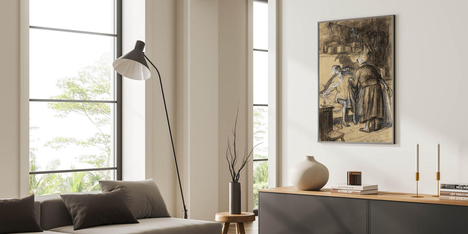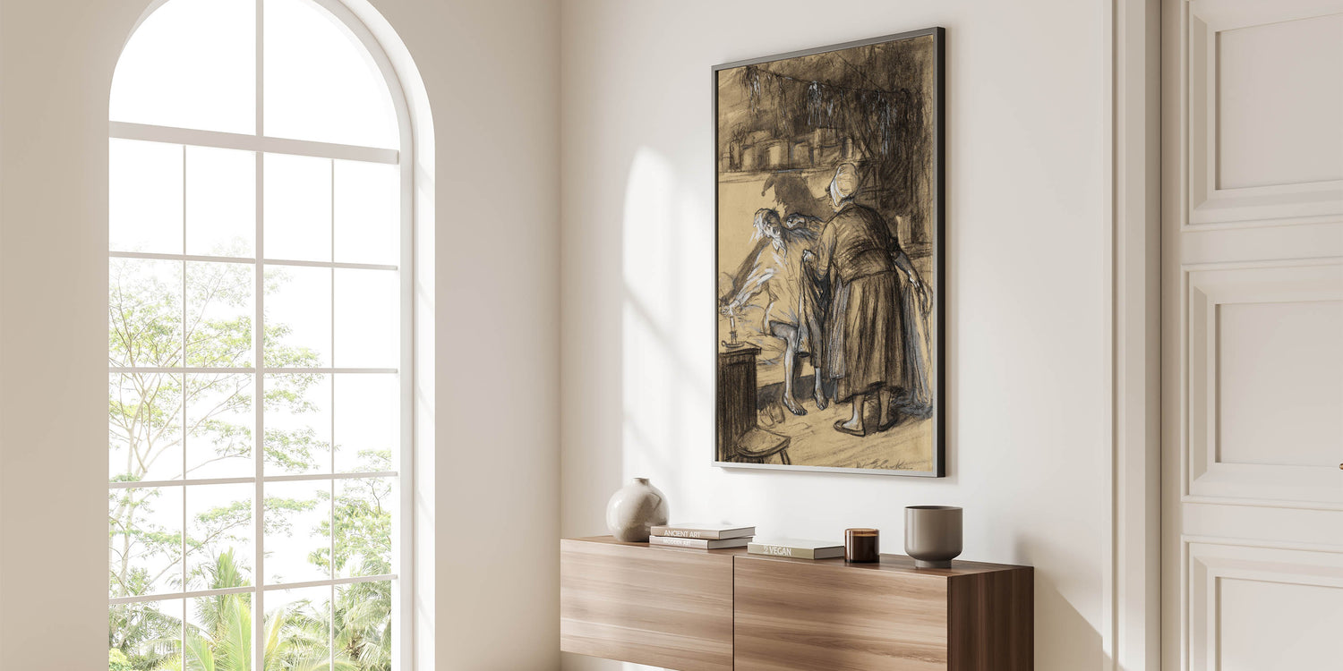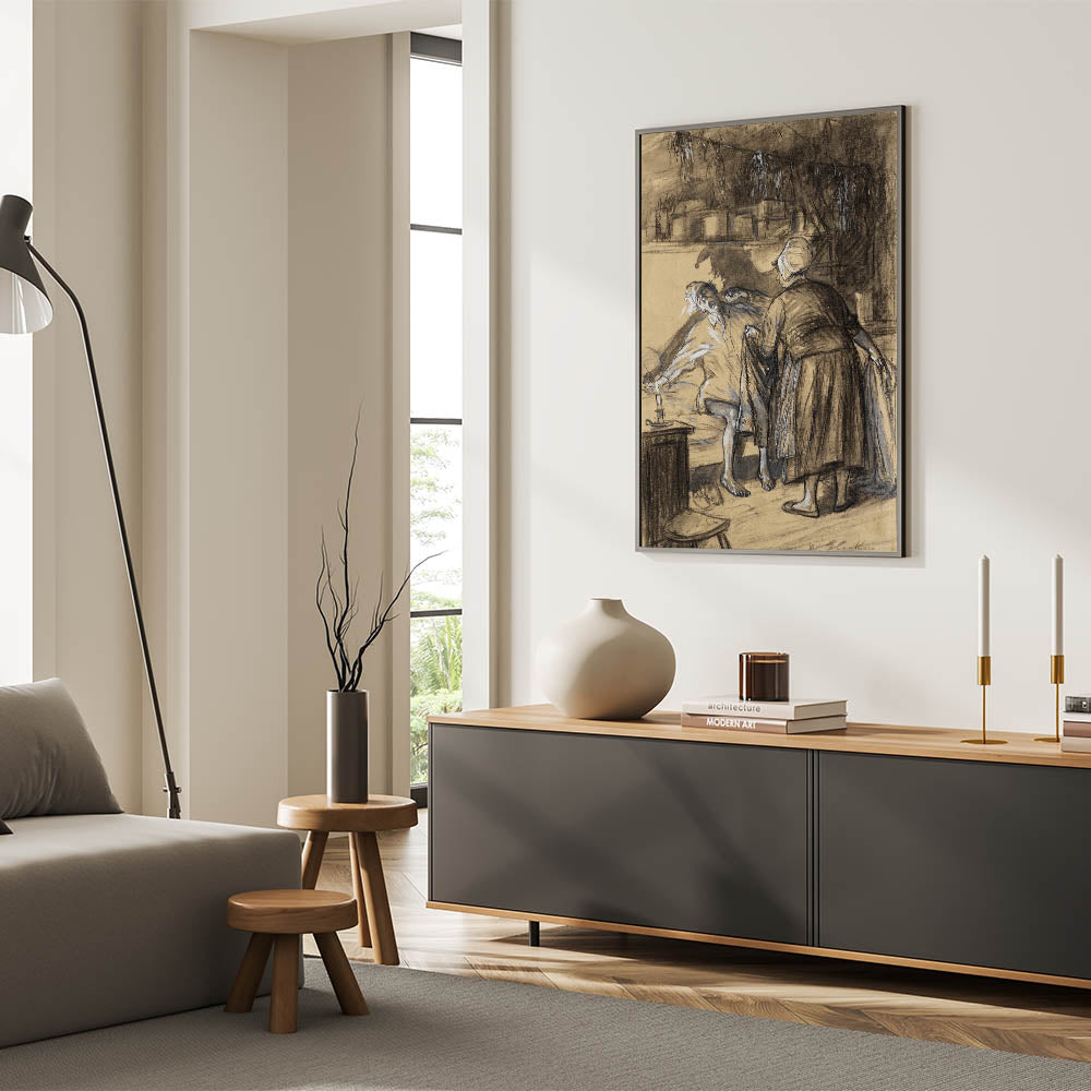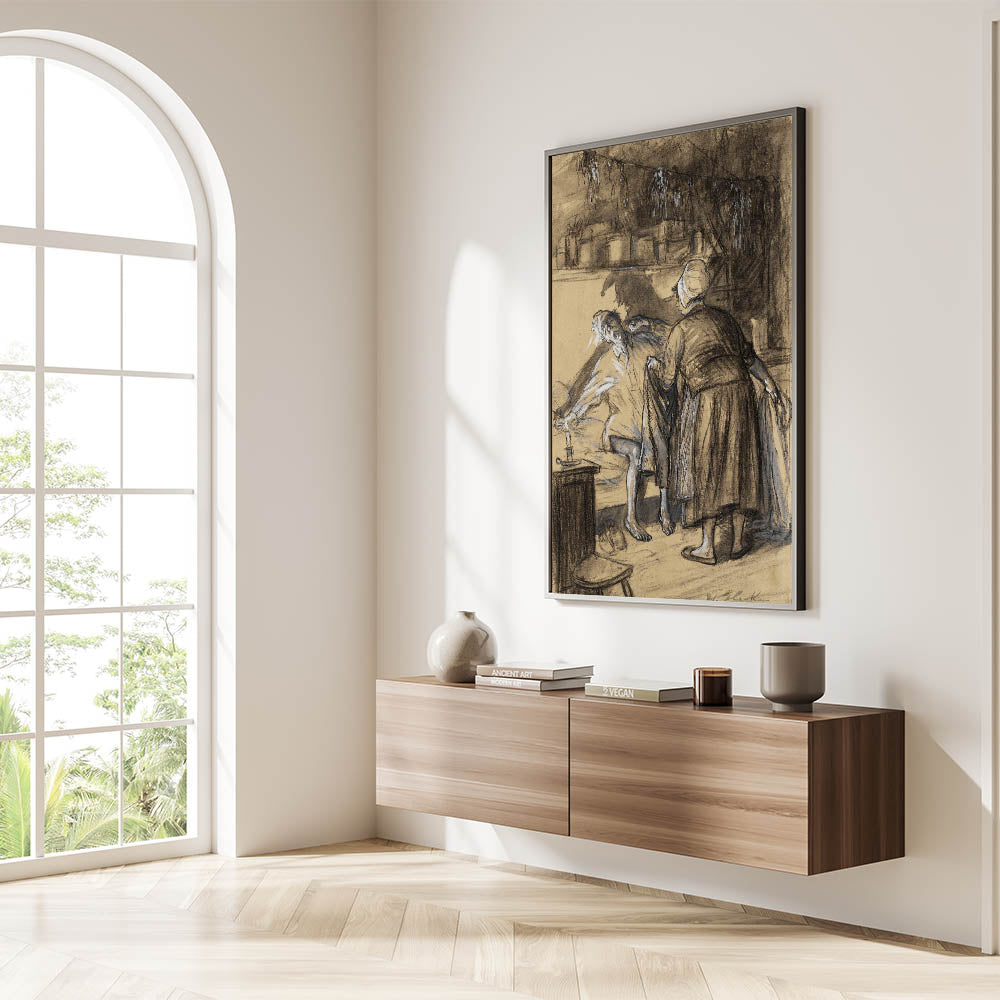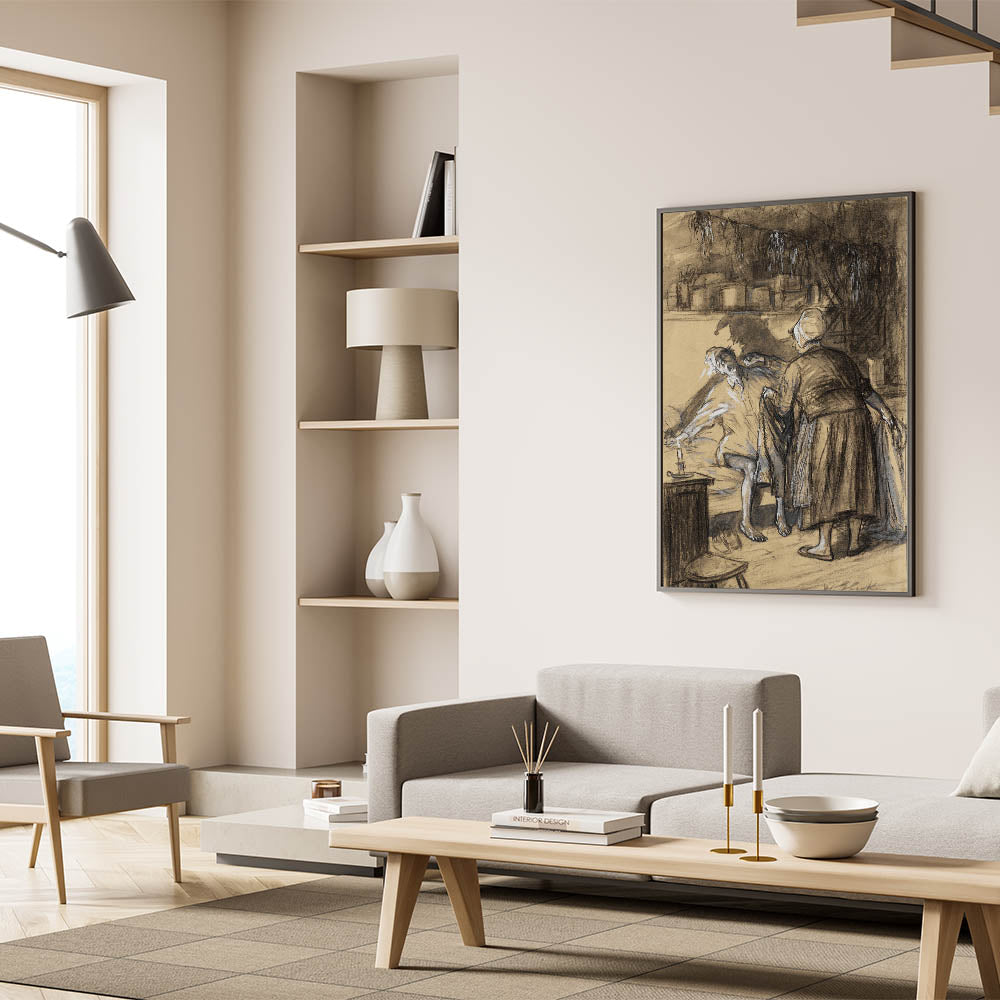 Bring a moment of humor and warmth to your decor with "Here Are Your Trousers" by William James Glackens, a unique piece from our Realism Art Prints collection. This expressive scene captures a humorous domestic moment as a woman hands a man his trousers in a rustic interior setting. Rendered in charcoal and sepia tones, the artwork’s detailed shading and character expressions evoke a sense of charm and nostalgia, making it a perfect addition to any space that values personality and timeless stories.