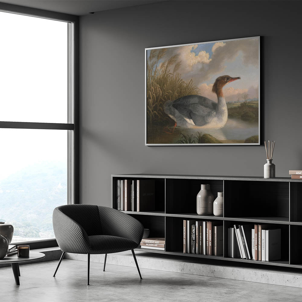 Bring the beauty of wildlife into your home with "A Dun Diver (Goosander)" by Robert Wilkinson Padley. This captivating Realism art print captures a tranquil scene of a Goosander at the water’s edge, surrounded by reeds under a sky filled with soft clouds. Padley’s detailed brushwork and subtle color palette bring a lifelike quality to the bird’s feathers and the lush environment, making this artwork a perfect choice for nature lovers and art collectors alike.