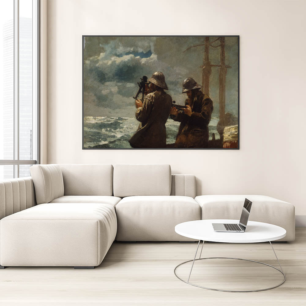 Experience the gritty realism of life at sea with Eight Bells (1886) by Winslow Homer, a powerful depiction of two sailors navigating through a rough sea. This artwork, celebrated for its stark realism and attention to the nuances of maritime life, captures the intense focus and determination of sailors as they work against the elements. The dynamic composition and moody atmosphere reflect Homer's skill in portraying the challenges faced by those who live their lives at sea.
