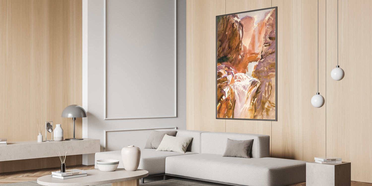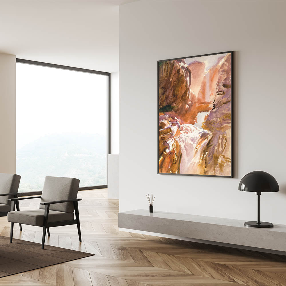 Immerse yourself in the raw beauty of nature with "Mountain Torrent" by John Singer Sargent. This Realism art print captures the powerful flow of a mountain waterfall, surrounded by rugged cliffs in warm, earthy tones. Sargent’s expressive brushwork and masterful use of watercolor convey both the strength and elegance of the rushing water, making this piece perfect for nature lovers and art enthusiasts.