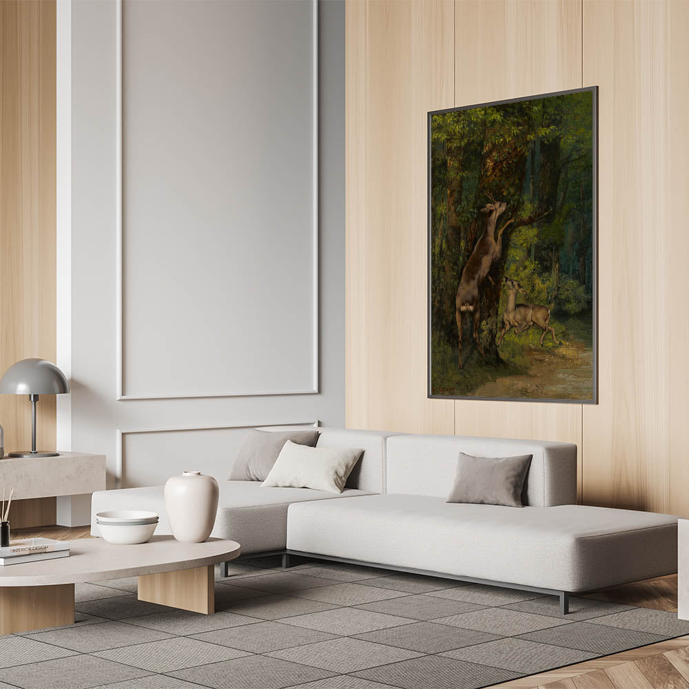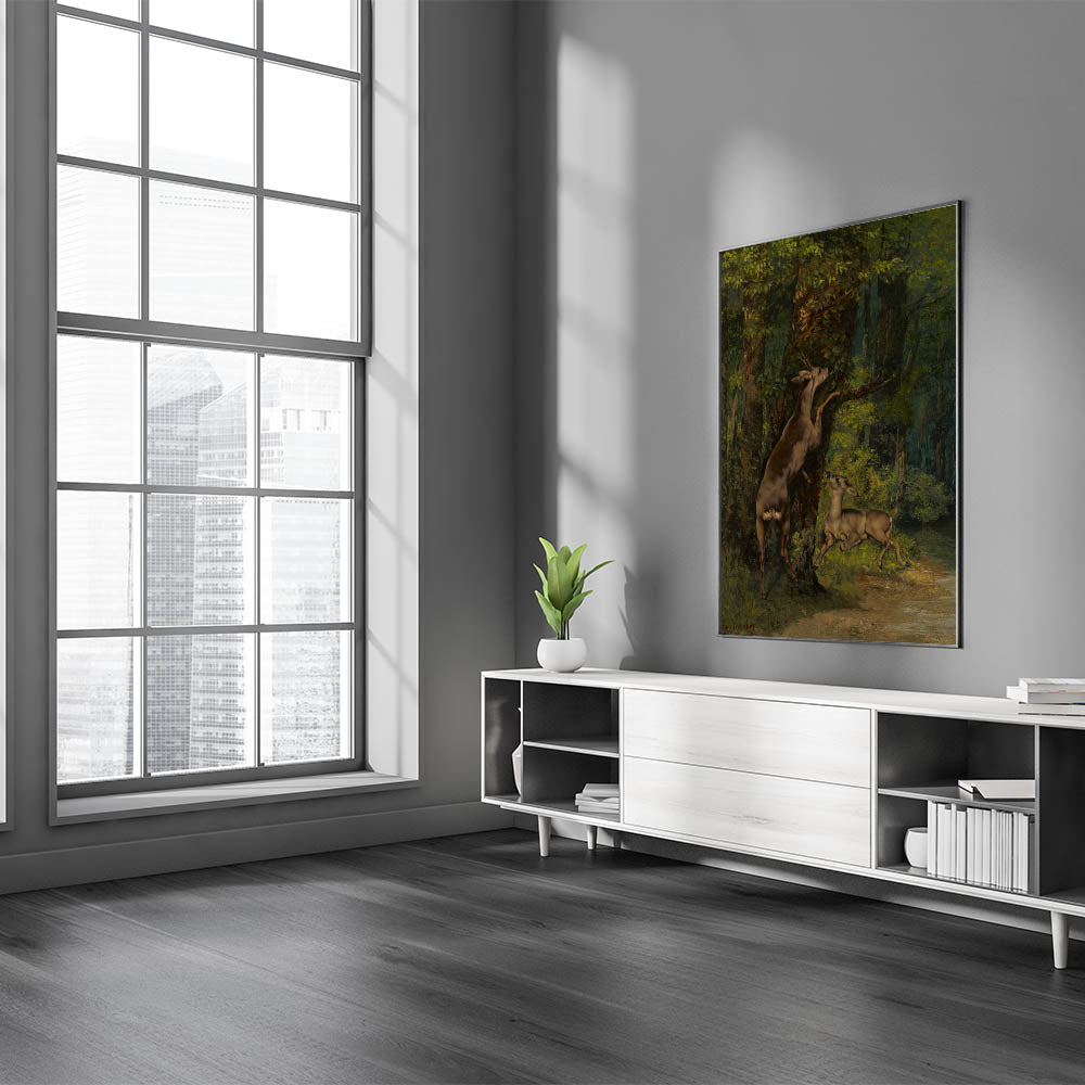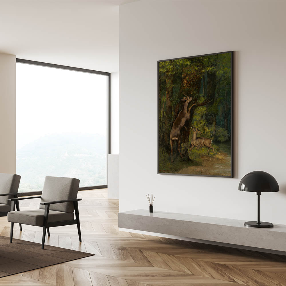 Step into the beauty of nature with this realism art print featuring deer gracefully foraging in a dense, vibrant forest. Perfect for those who appreciate classical realism paintings and the quiet elegance of wildlife scenes, this piece brings the serenity of the forest into your home decor.