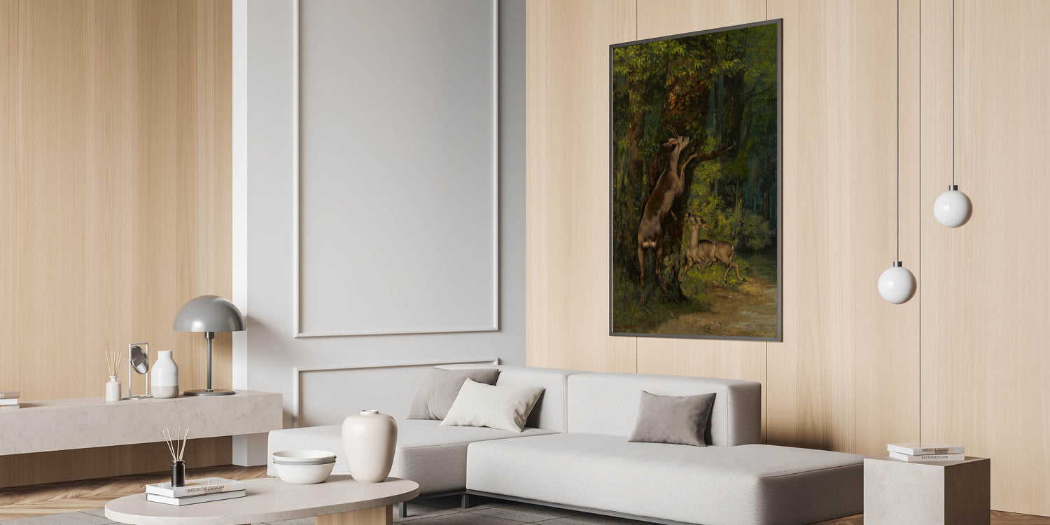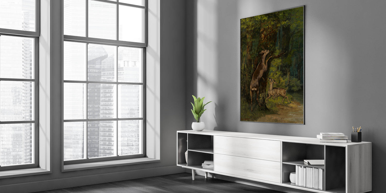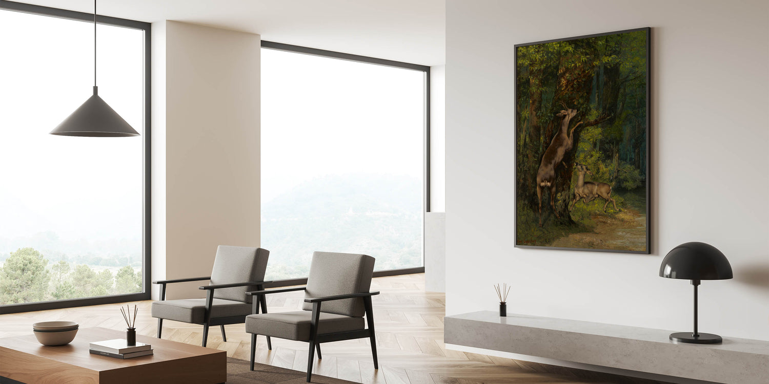 Step into the beauty of nature with this realism art print featuring deer gracefully foraging in a dense, vibrant forest. Perfect for those who appreciate classical realism paintings and the quiet elegance of wildlife scenes, this piece brings the serenity of the forest into your home decor.