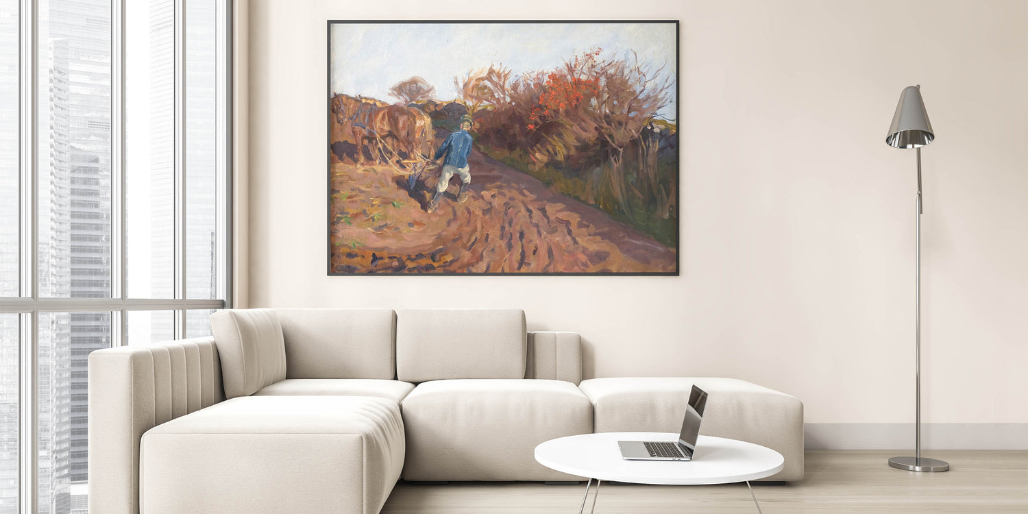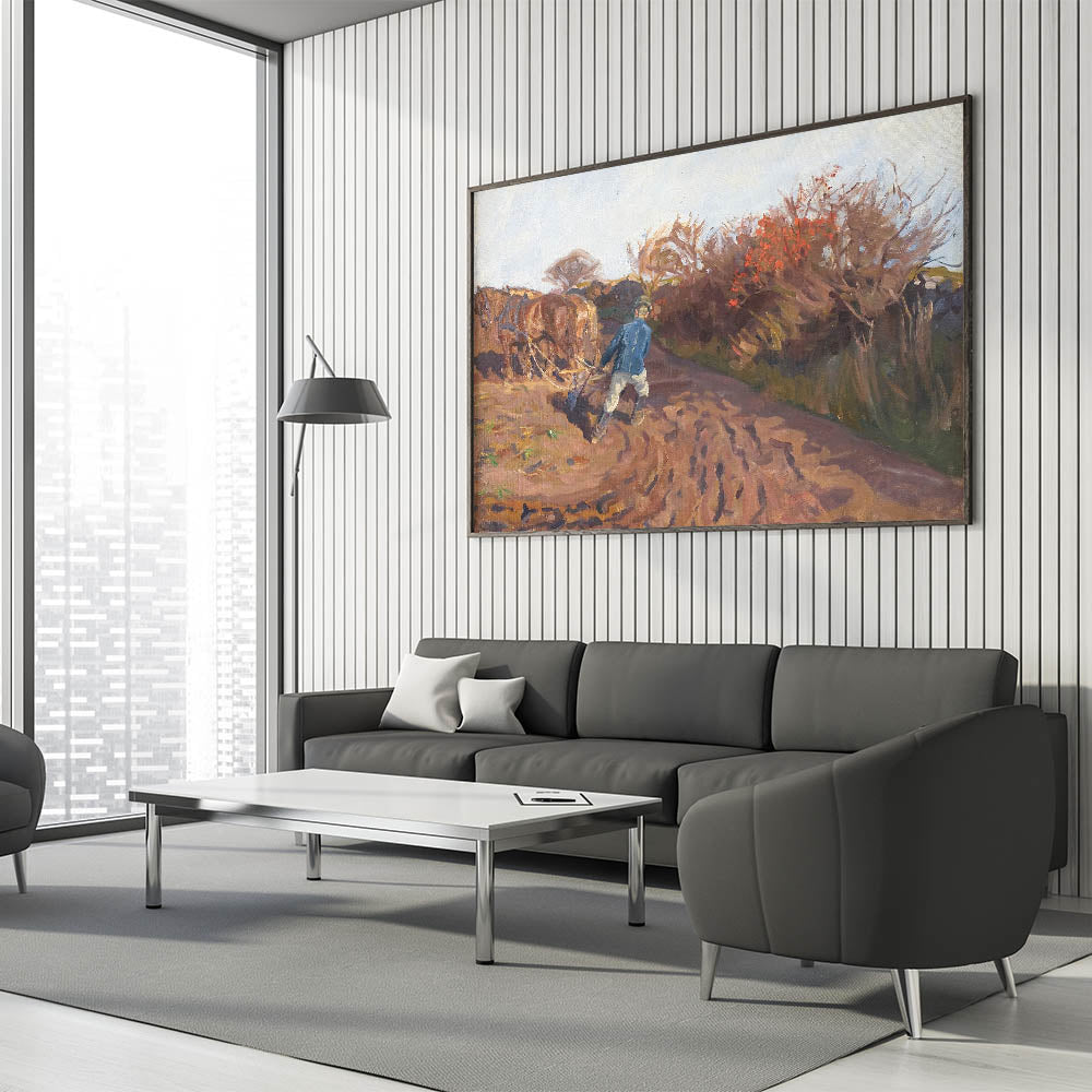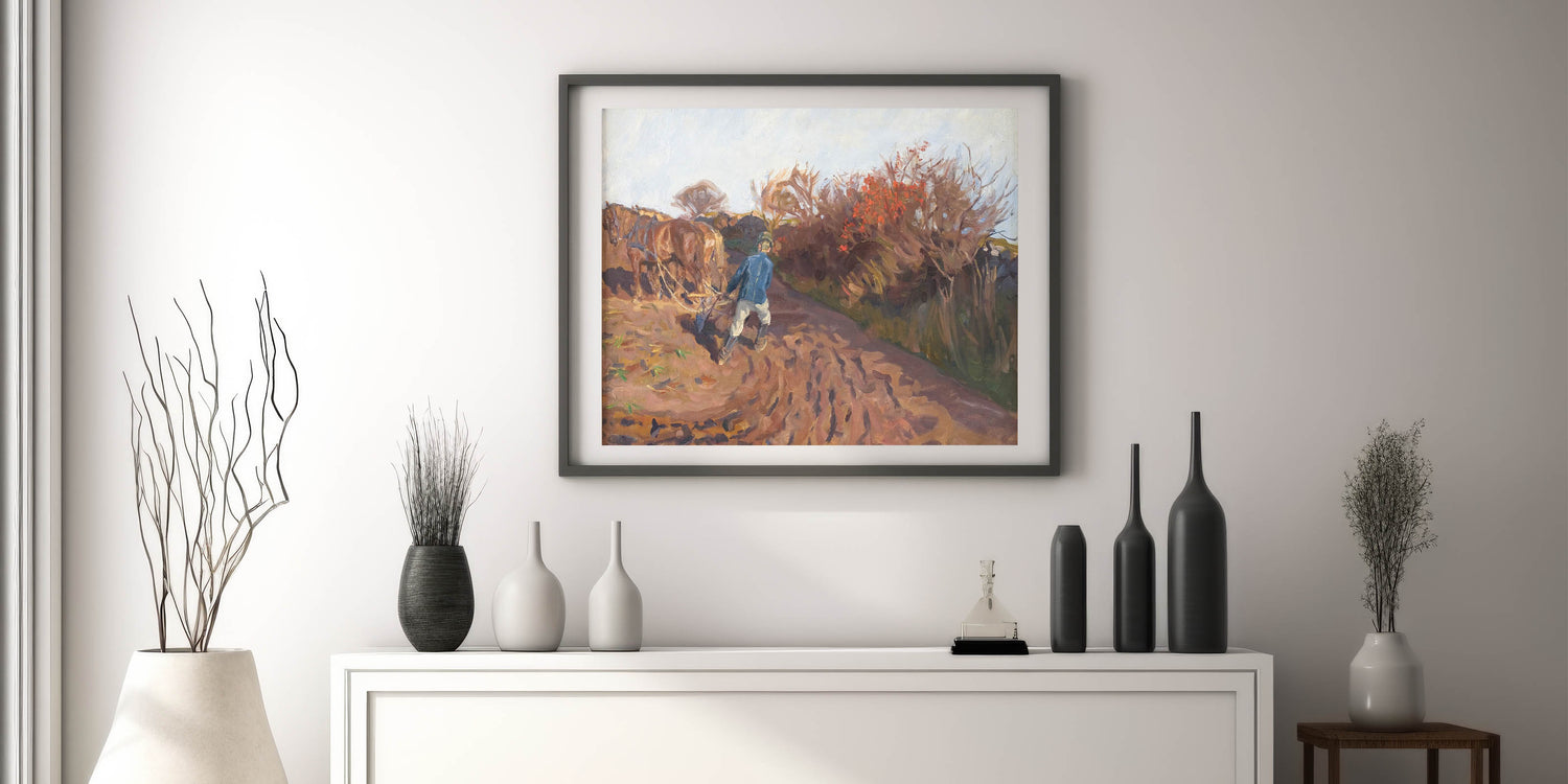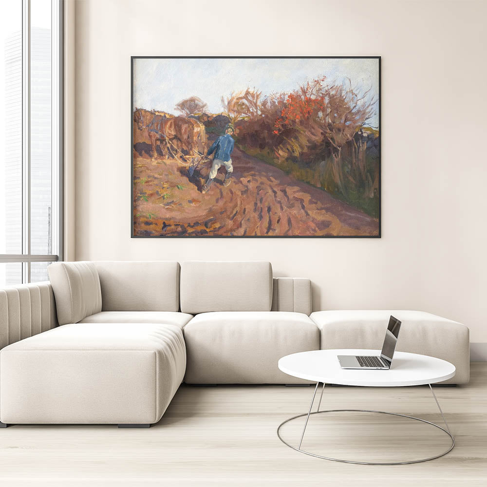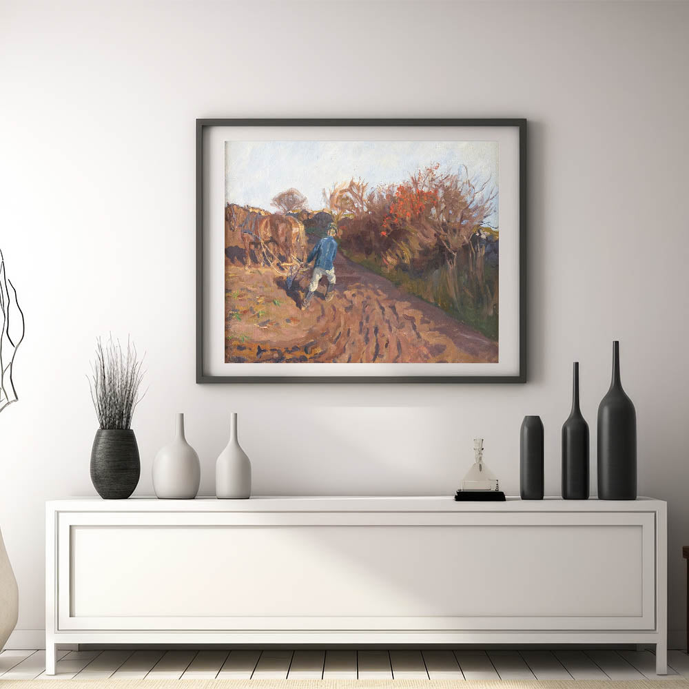 This captivating realism art print, "The Plowman Turns" by Peter Hansen, beautifully portrays the hard work and rhythm of rural life. The artwork features a farmer guiding his plow, drawn by strong horses, across the earthy, sunlit field. The warm tones of the soil, the subtle textures of the field, and the vibrant splashes of color in the bushes create a scene filled with life and movement. This piece celebrates the timeless beauty of agriculture and human connection to the land, making it an ideal addition for any space that embraces rustic charm or natural themes.
