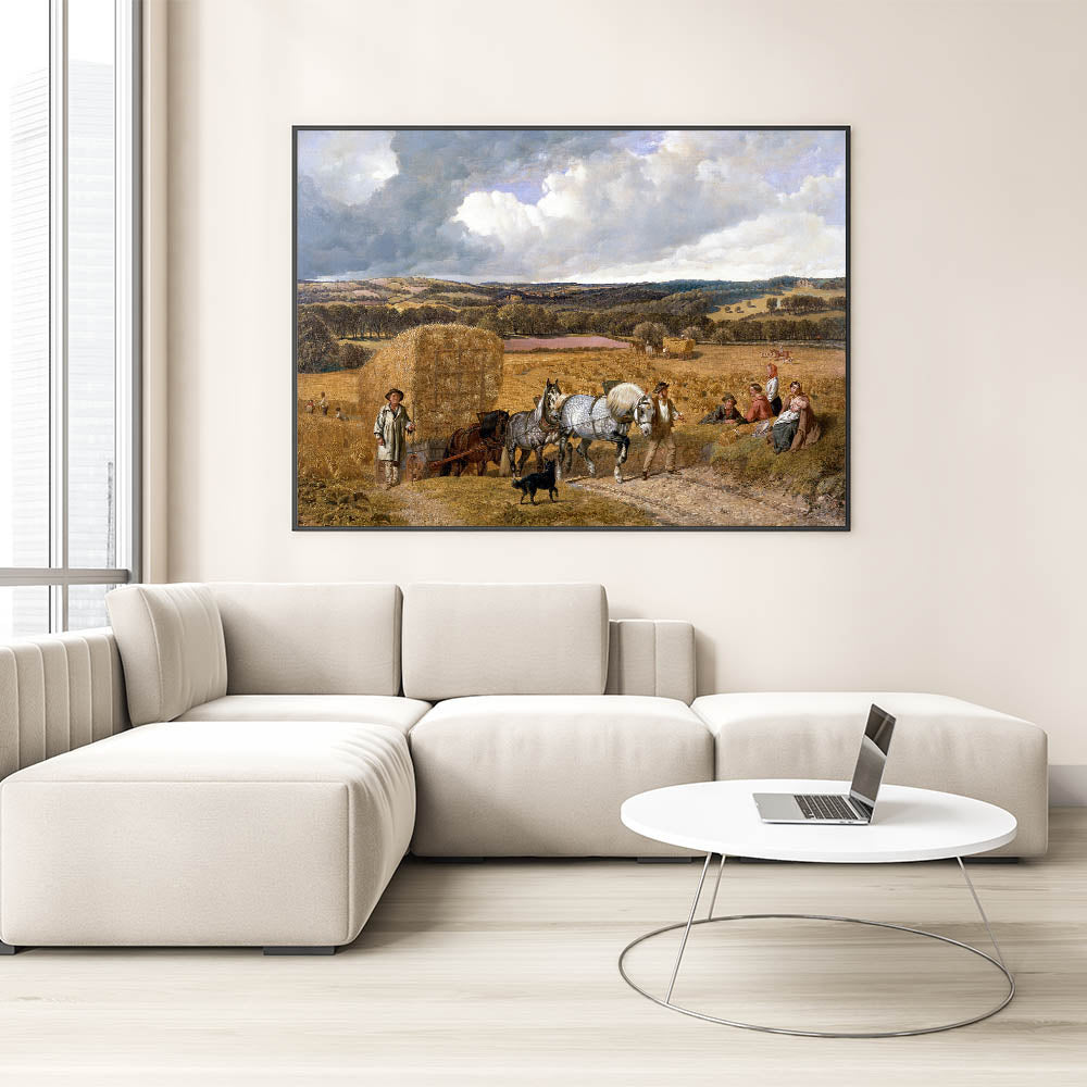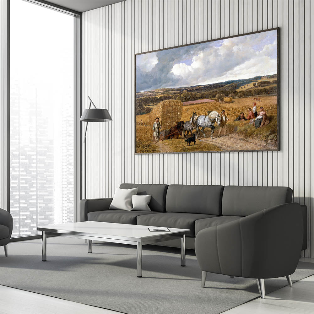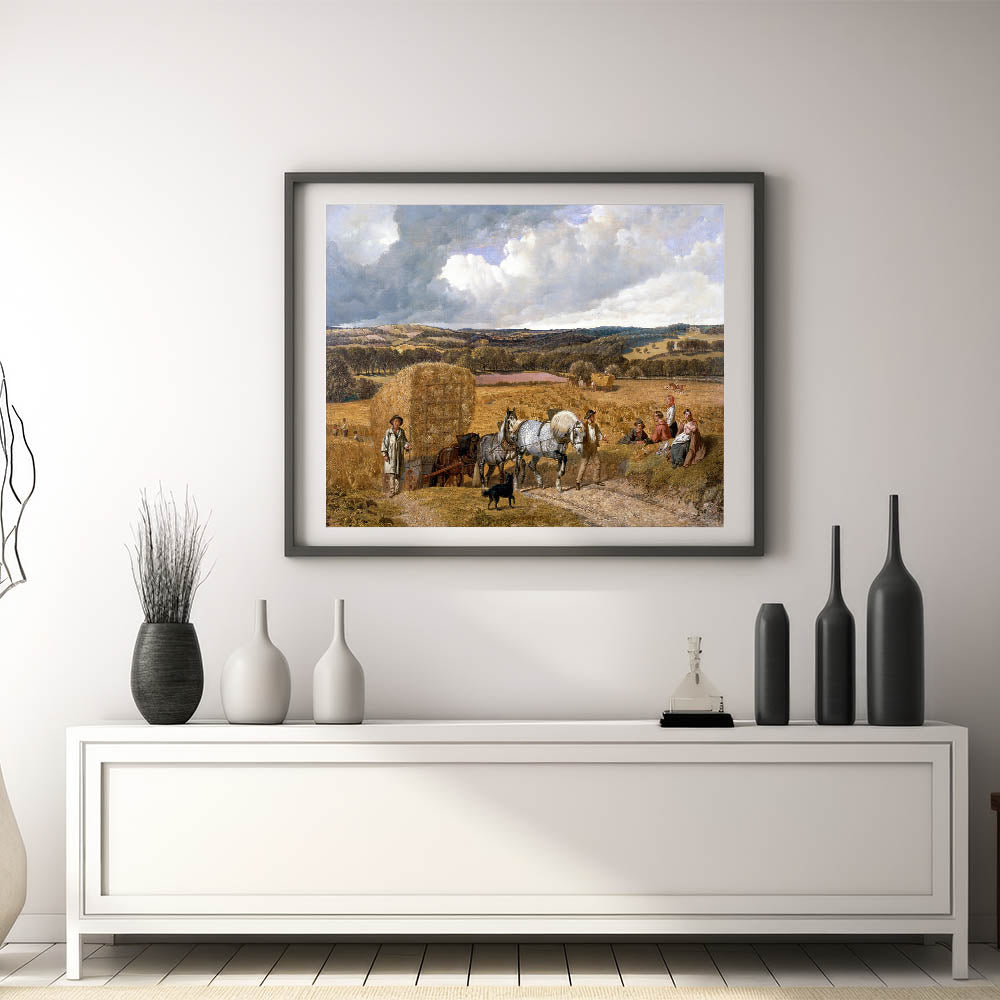This detailed realism art print, "Harvest" by John Frederick Herring, beautifully captures a classic rural scene during harvest time. The artwork features hardworking farmers, majestic horses pulling a hay wagon, and a tranquil countryside landscape that stretches into the distance. The colors are rich and warm, evoking the essence of autumn and the enduring connection between people and nature. This print is perfect for bringing a sense of pastoral beauty and nostalgia to any space, making it an excellent addition to living rooms, studies, or dining areas.