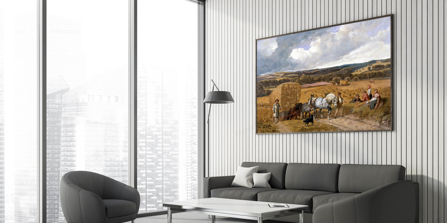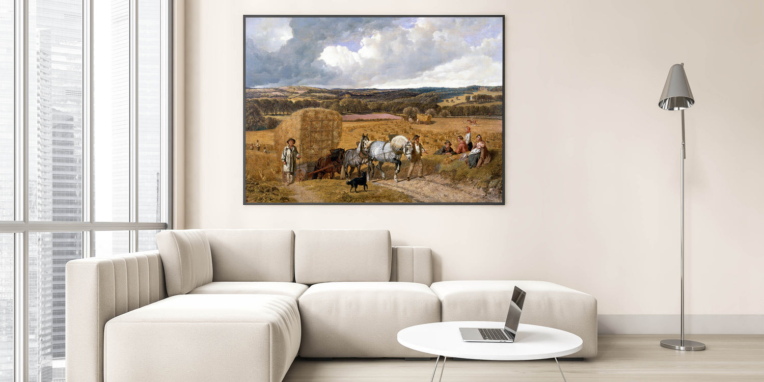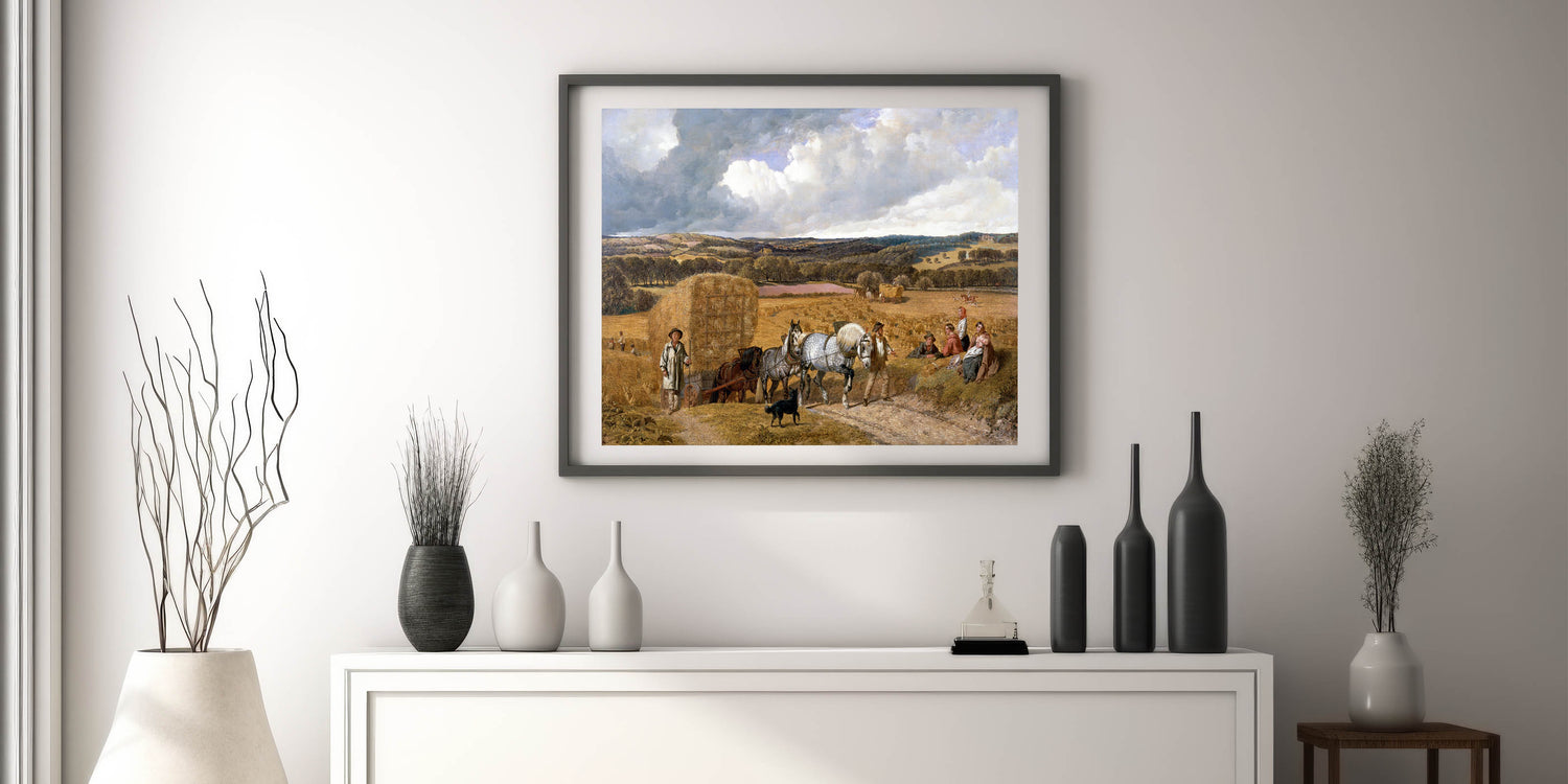 This detailed realism art print, "Harvest" by John Frederick Herring, beautifully captures a classic rural scene during harvest time. The artwork features hardworking farmers, majestic horses pulling a hay wagon, and a tranquil countryside landscape that stretches into the distance. The colors are rich and warm, evoking the essence of autumn and the enduring connection between people and nature. This print is perfect for bringing a sense of pastoral beauty and nostalgia to any space, making it an excellent addition to living rooms, studies, or dining areas.