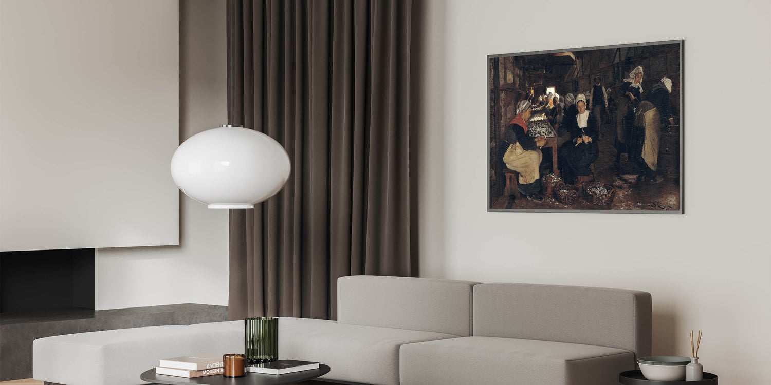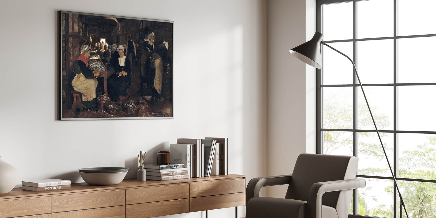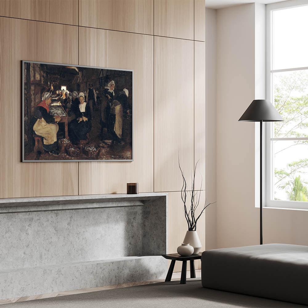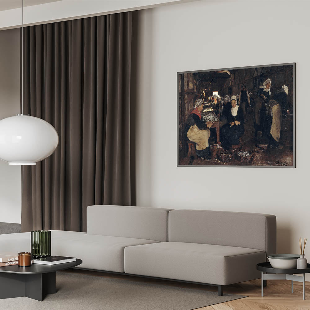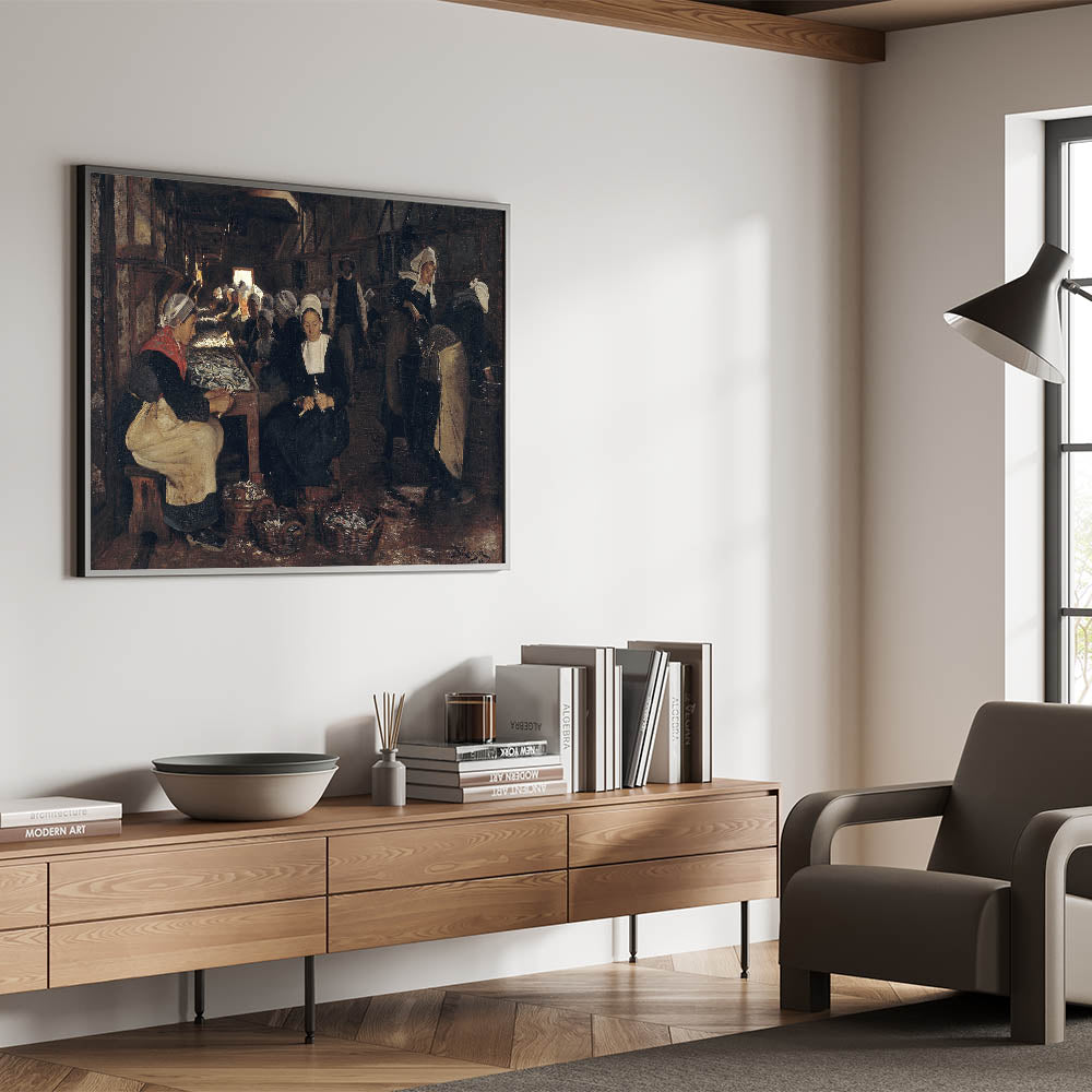 This Realism art print captures an authentic scene of fisherwomen working diligently in a dimly lit workspace. The detailed portrayal of their expressions and movements emphasizes the labor-intensive nature of their work, providing a glimpse into a bygone era. Perfect for enthusiasts of classical realism and those who appreciate art with historical depth, this piece can enhance the aesthetic of any home or office space.