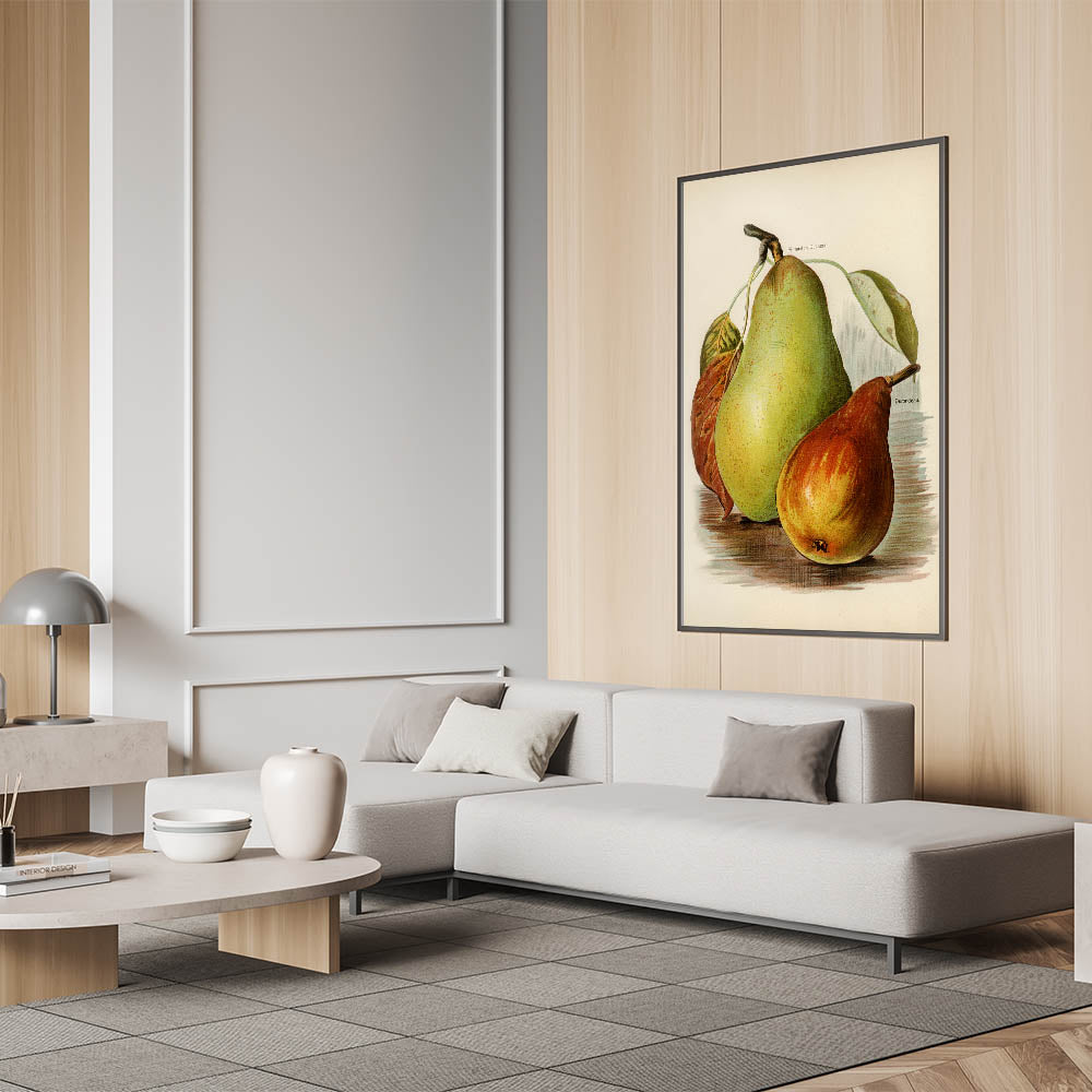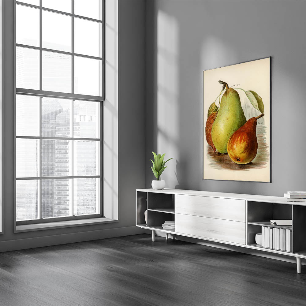 This charming realism art print, a vintage pear illustration from The Fruit Grower's Guide (1891) by John Wright, showcases the beauty of nature through a detailed, lifelike depiction of two pear varieties: Pitmaston Duchess and Durondeau. The illustration captures the rich colors and textures of the fruit, with lush greens, warm yellows, and hints of red that give it a timeless appeal. This classic fruit study is perfect for kitchens, dining rooms, or any space that celebrates vintage elegance and natural beauty. It adds a touch of old-world charm to modern or traditional decor alike.