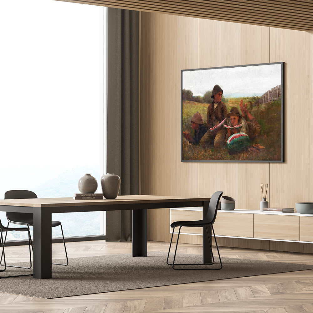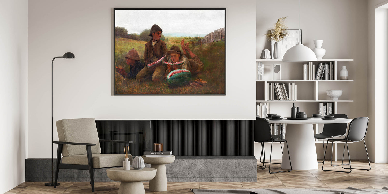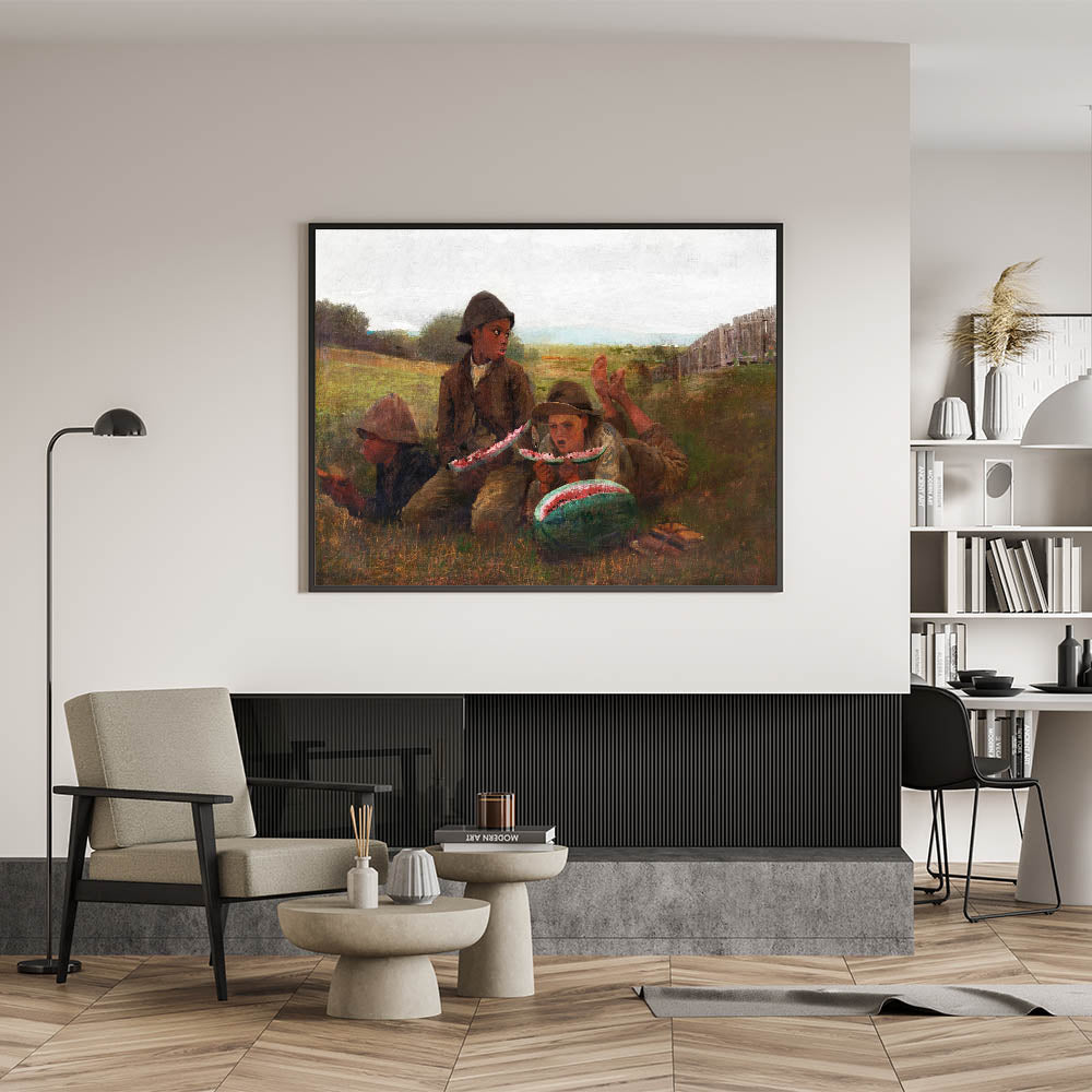 Add a slice of nostalgia to your decor with "The Watermelon Boys" by Winslow Homer, a captivating piece from our Realism Art Prints collection. This charming artwork captures three boys savoring fresh watermelon on a warm day, set against a peaceful rural landscape. Homer's skilled use of color and expression brings this simple yet joyful moment to life, making it a delightful addition to spaces that celebrate country life and timeless, carefree moments.