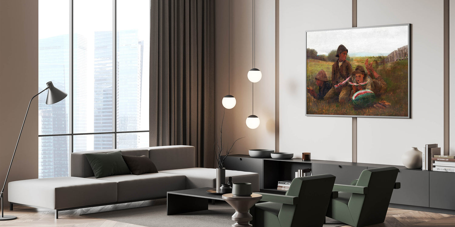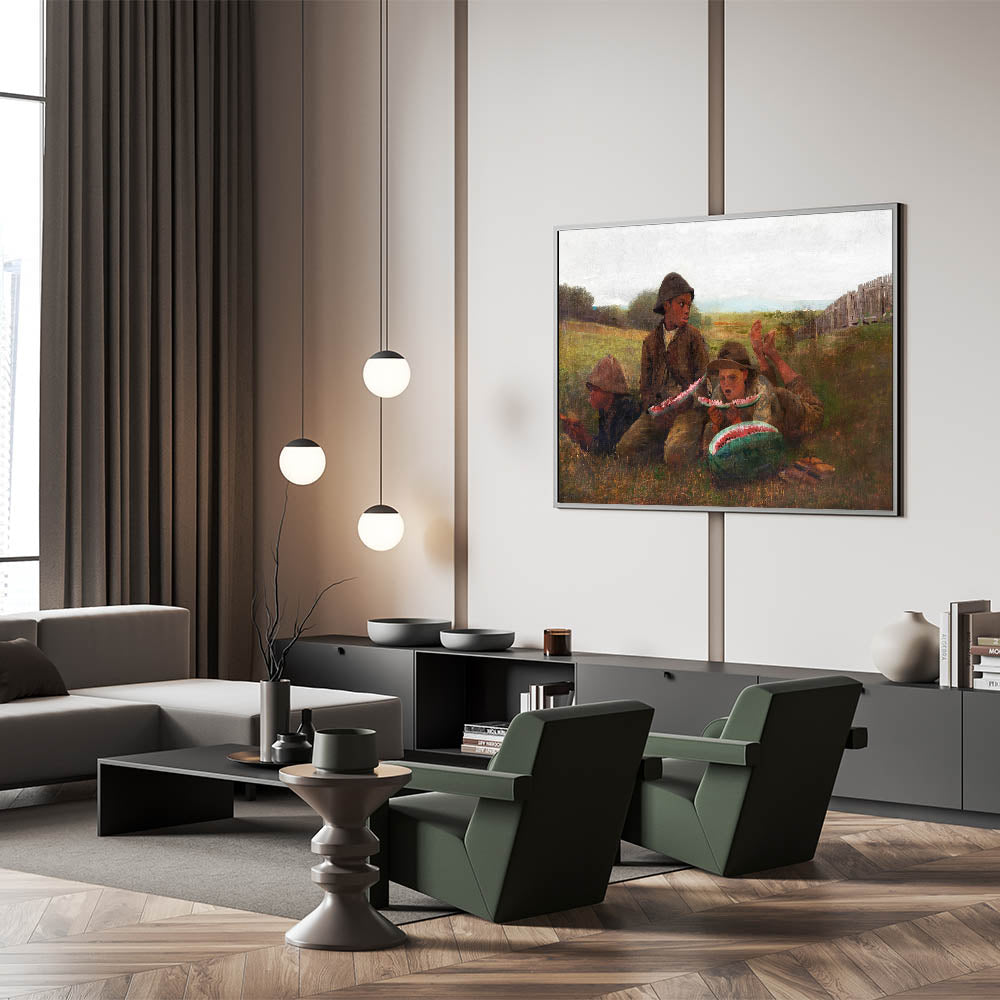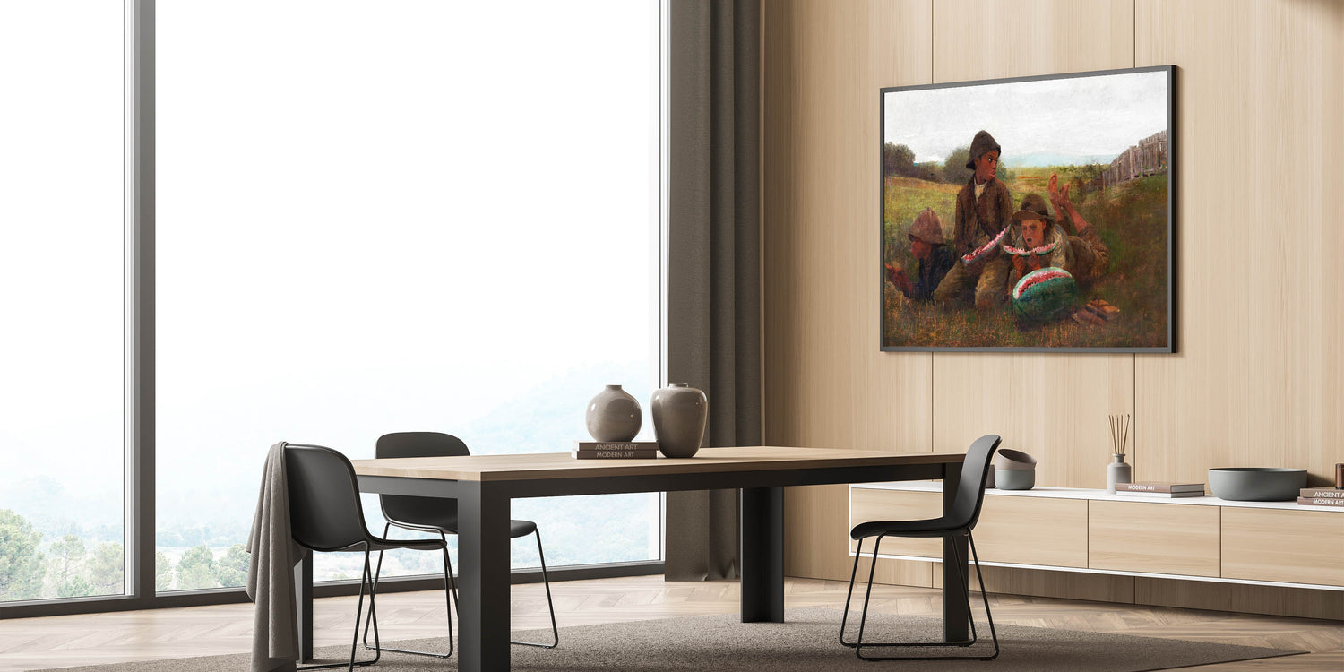 Add a slice of nostalgia to your decor with "The Watermelon Boys" by Winslow Homer, a captivating piece from our Realism Art Prints collection. This charming artwork captures three boys savoring fresh watermelon on a warm day, set against a peaceful rural landscape. Homer's skilled use of color and expression brings this simple yet joyful moment to life, making it a delightful addition to spaces that celebrate country life and timeless, carefree moments.