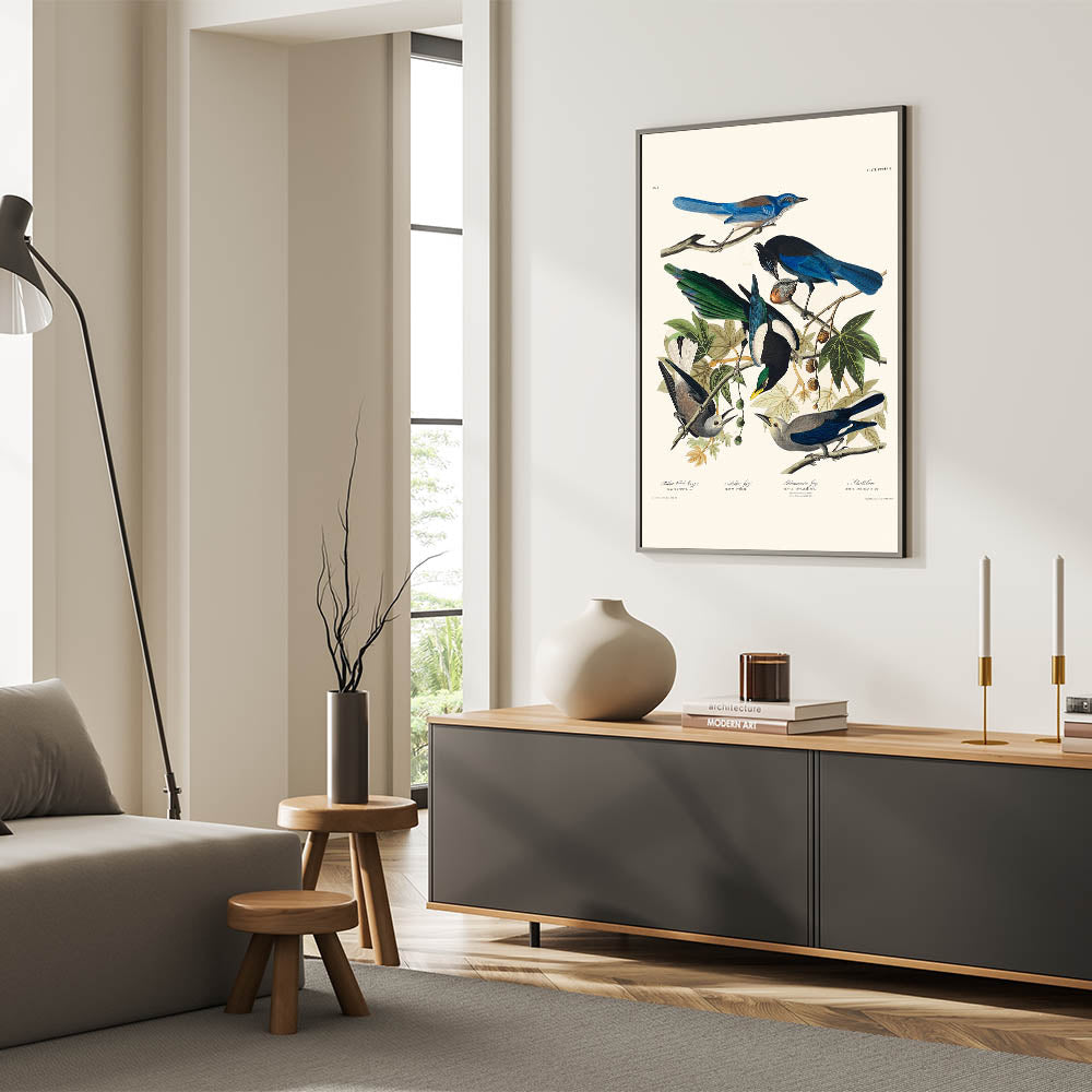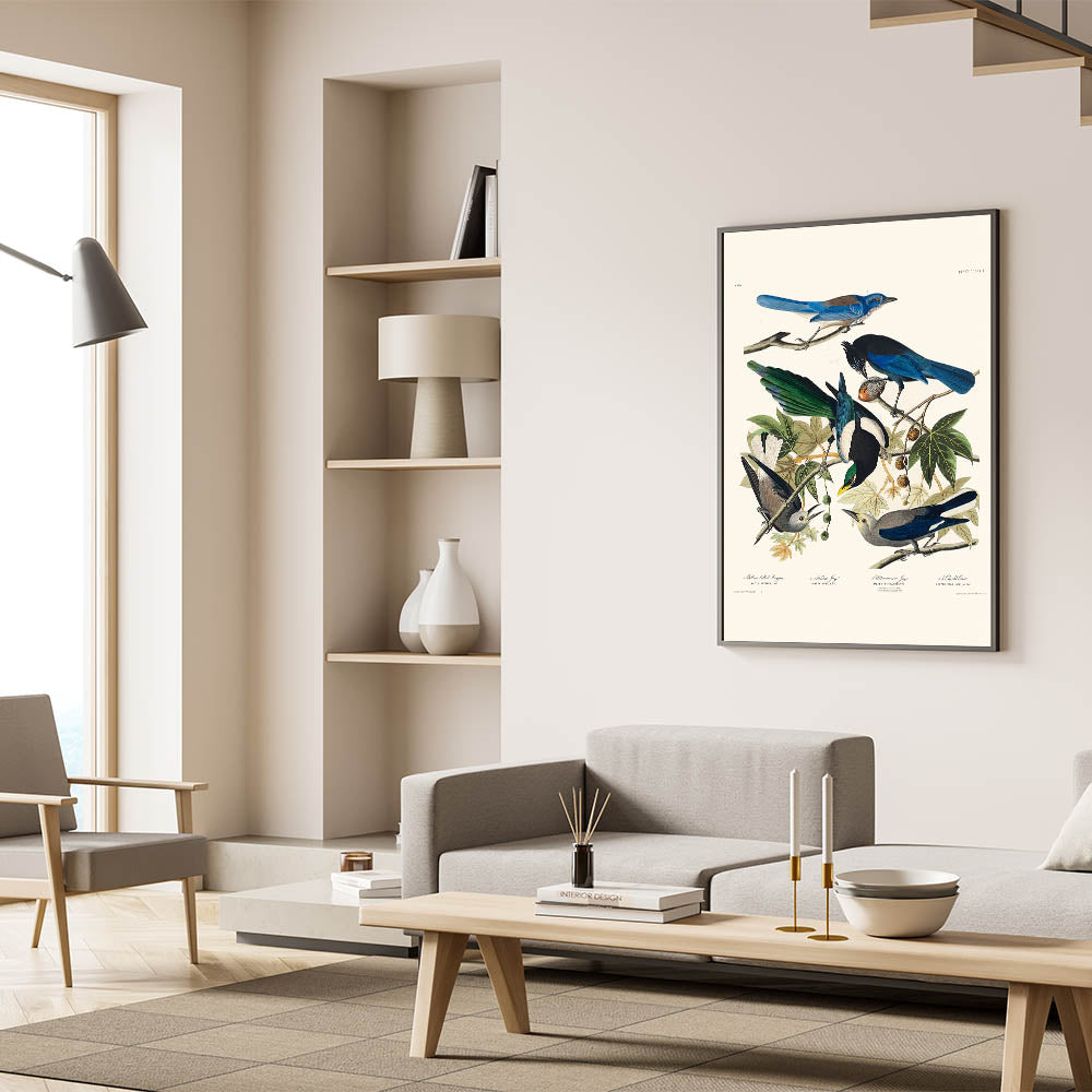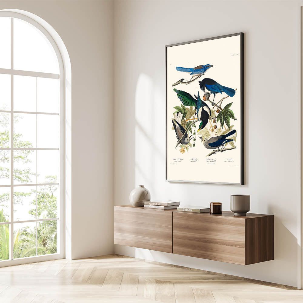 Bring the beauty of avian wildlife into your home with this stunning realism art print from John James Audubon’s "Birds of America." This illustration features four distinct bird species: the Yellow-billed Magpie, Steller’s Jay, Ultramarine Jay, and Clark’s Crow, each depicted in incredible detail. Audubon’s masterful depiction of birds in their natural environment, complete with lush foliage, makes this piece perfect for those who appreciate vintage botanical and wildlife illustrations.