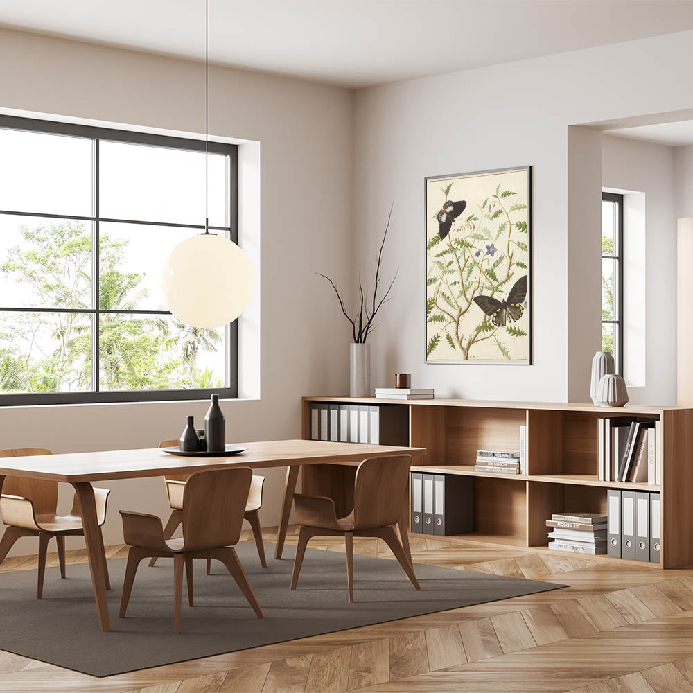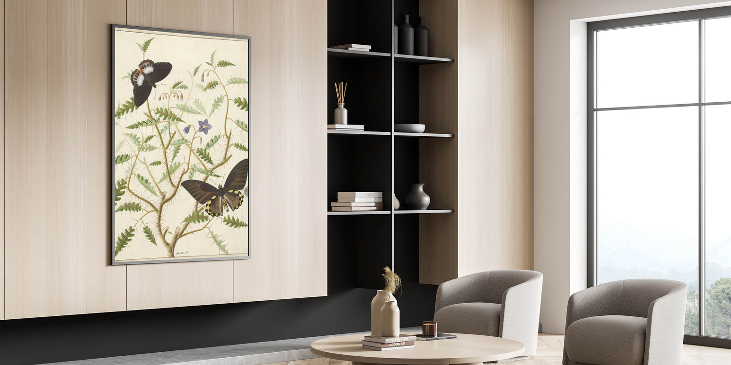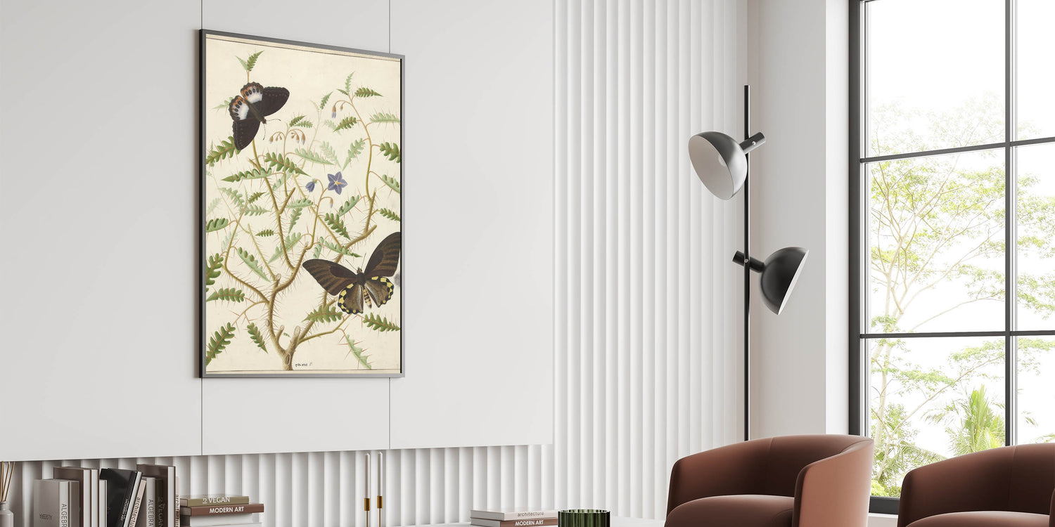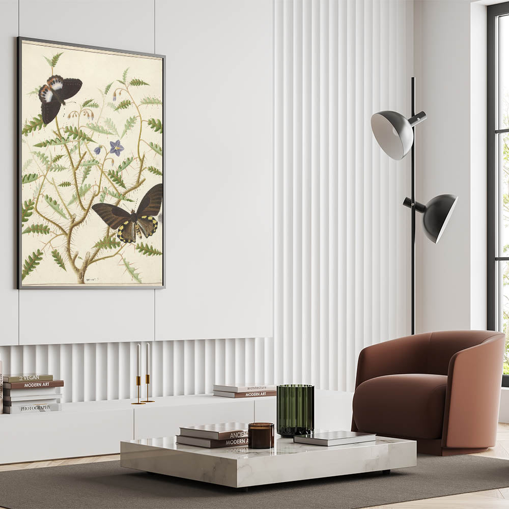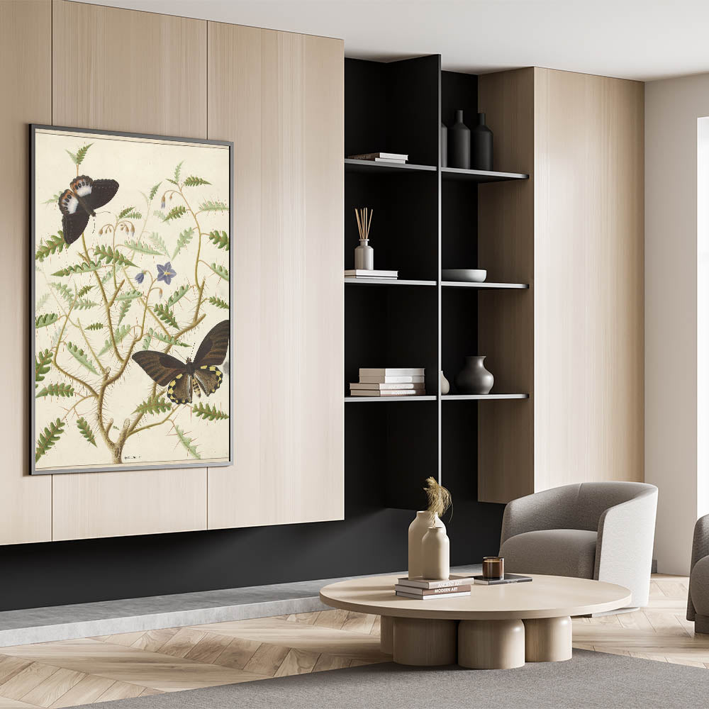 Bring the charm of botanical art and exotic butterflies into your home with this timeless piece, a tribute to the intricate beauty of nature.
