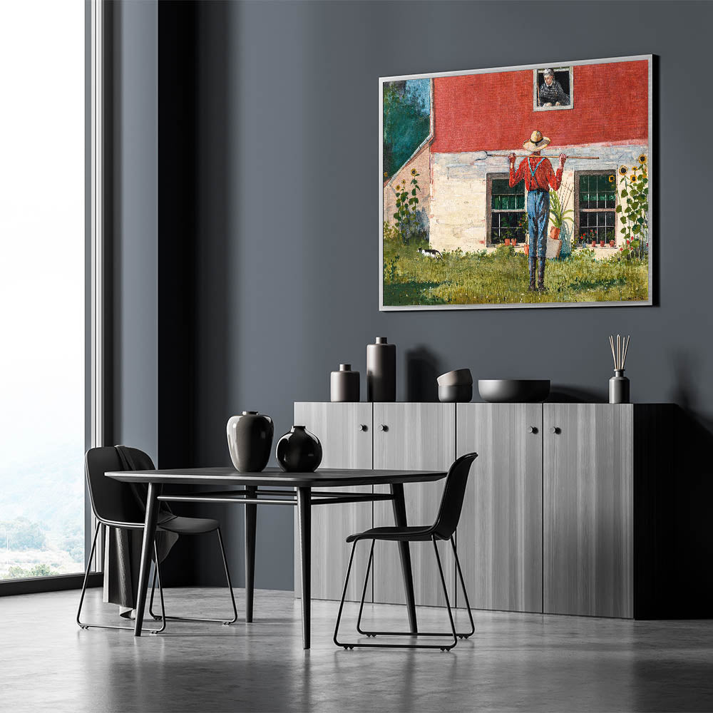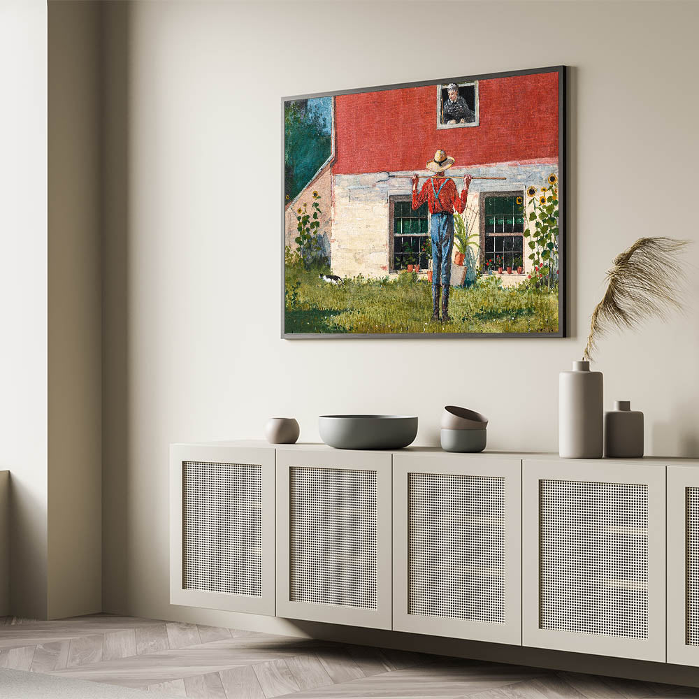 Add a touch of rustic charm to your decor with this delightful Realism art print. Depicting a lively garden scene, this artwork shows a man standing near a red brick house, with a woman looking out from an upstairs window. Surrounded by blooming sunflowers and lush greenery, this piece captures a warm, nostalgic moment of rural life. Available in various formats, it brings a slice of the countryside into your home.