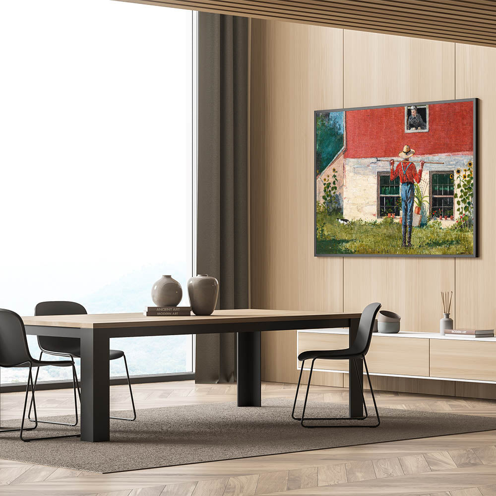 Realism Art Prints - Garden Scene with Farmer and Red House on Canvas