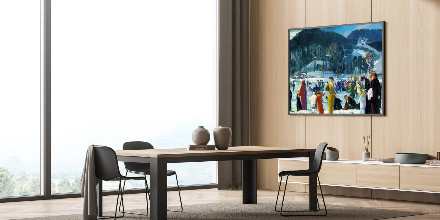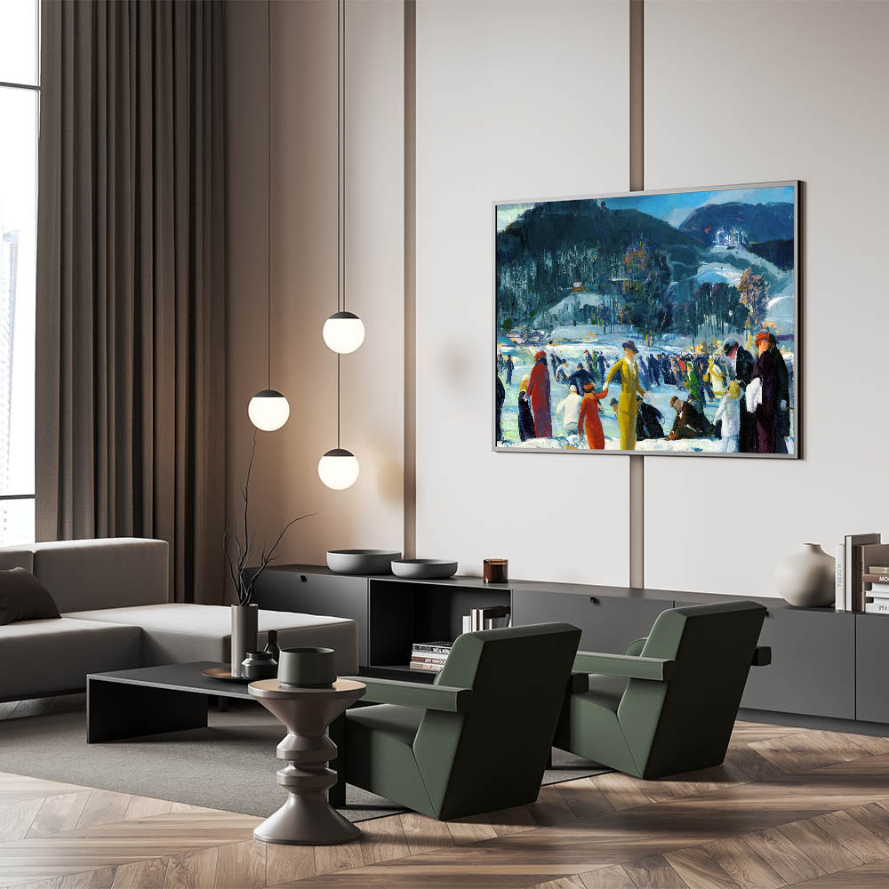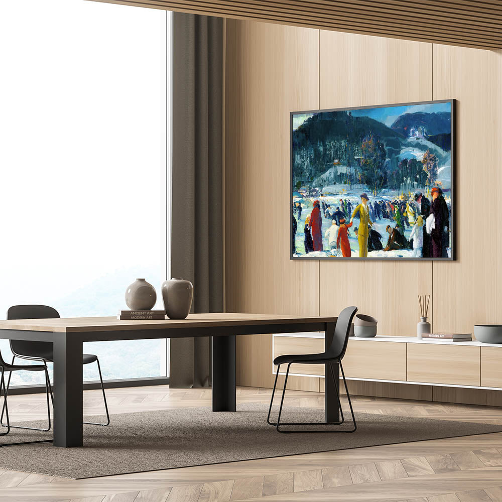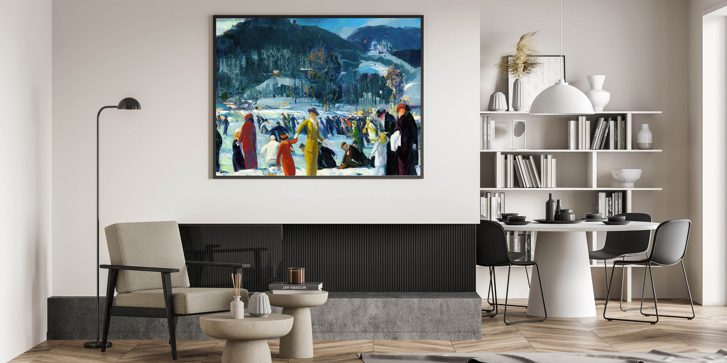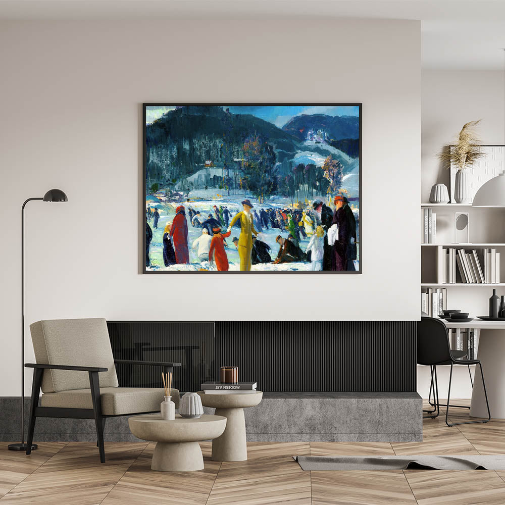 Celebrate the serene beauty of winter with "Love of Winter" by George Bellows. This stunning realism art print captures a lively outdoor winter scene with breathtaking detail. The snow-covered landscape, vibrant figures, and subtle play of light bring a sense of nostalgia and joy to your living space. A timeless depiction of nature's tranquility and human interaction, this artwork adds depth and elegance to any decor.