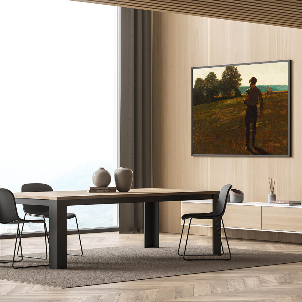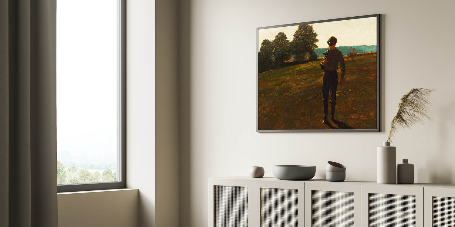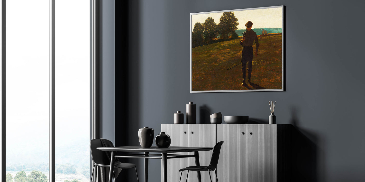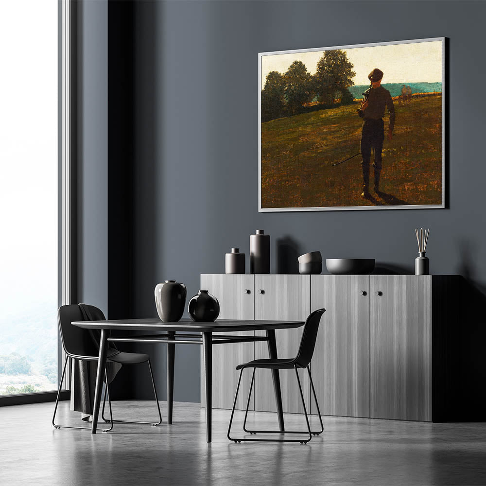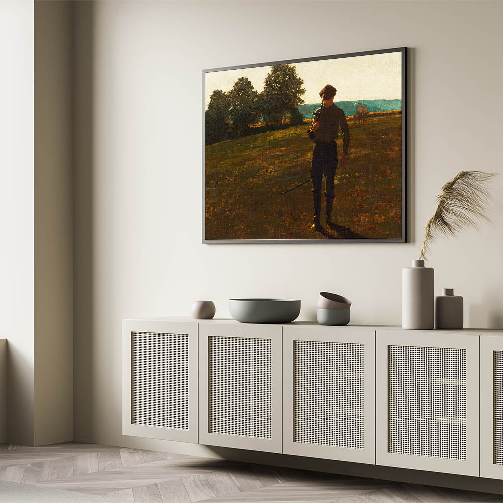 Bring a touch of timeless elegance to your home with this detailed Realism artwork, Man with a Scythe, by Winslow Homer. This piece, with its striking portrayal of a farmer silhouetted against a rustic landscape, captures the simplicity and strength of rural life. Perfect for creating a warm and inviting atmosphere, it complements classic, country, and rustic decor styles.