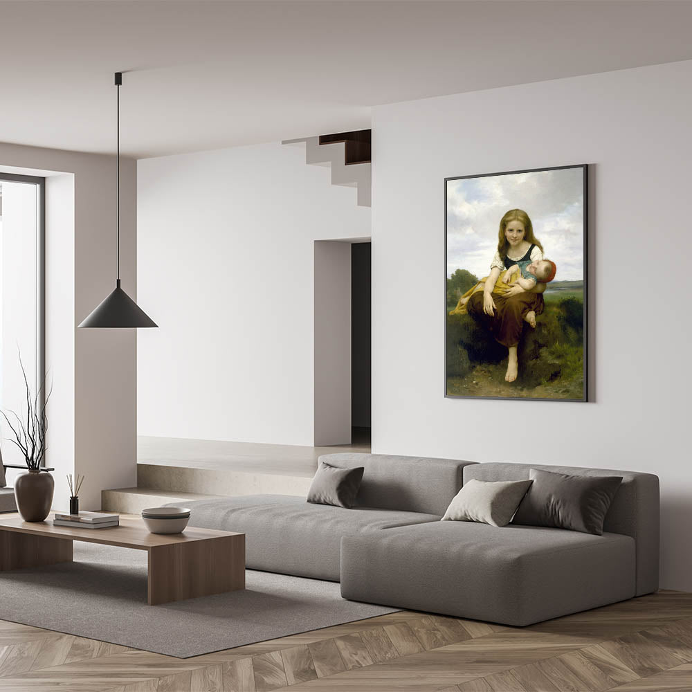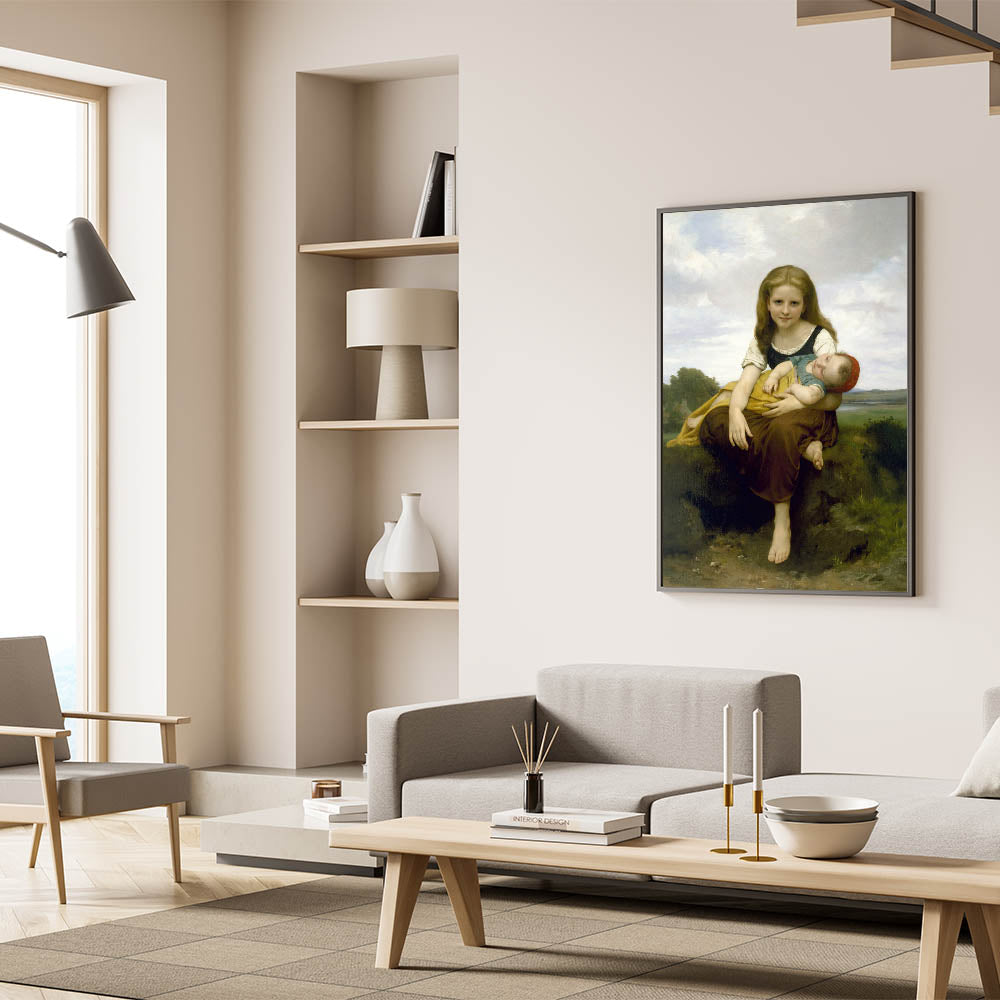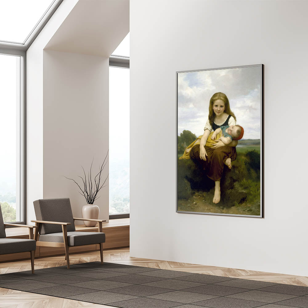 Add a touch of warmth and innocence to your decor with this realism art print by William Bouguereau, featuring a gentle portrait of a young girl holding her baby brother. This artwork beautifully captures the loving bond between siblings, with soft colors and delicate details that evoke a sense of tenderness and familial love. Bouguereau’s skilled brushwork brings life to this serene scene, making it an ideal piece for those who appreciate classical art and timeless beauty.