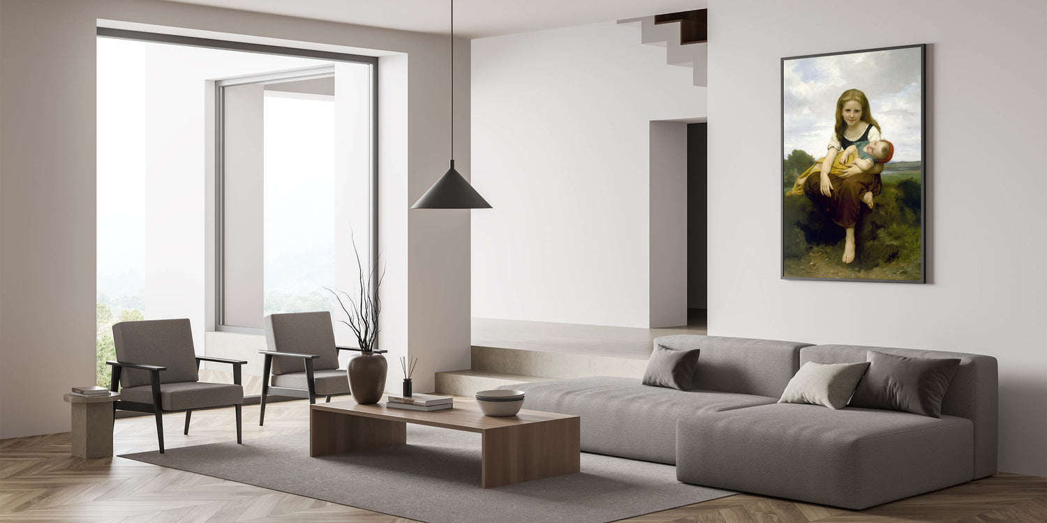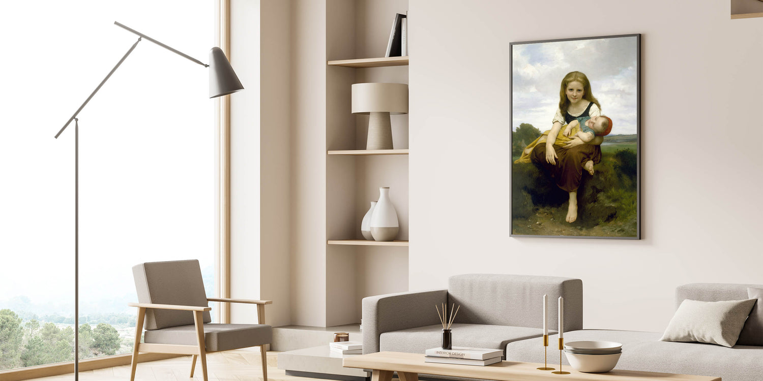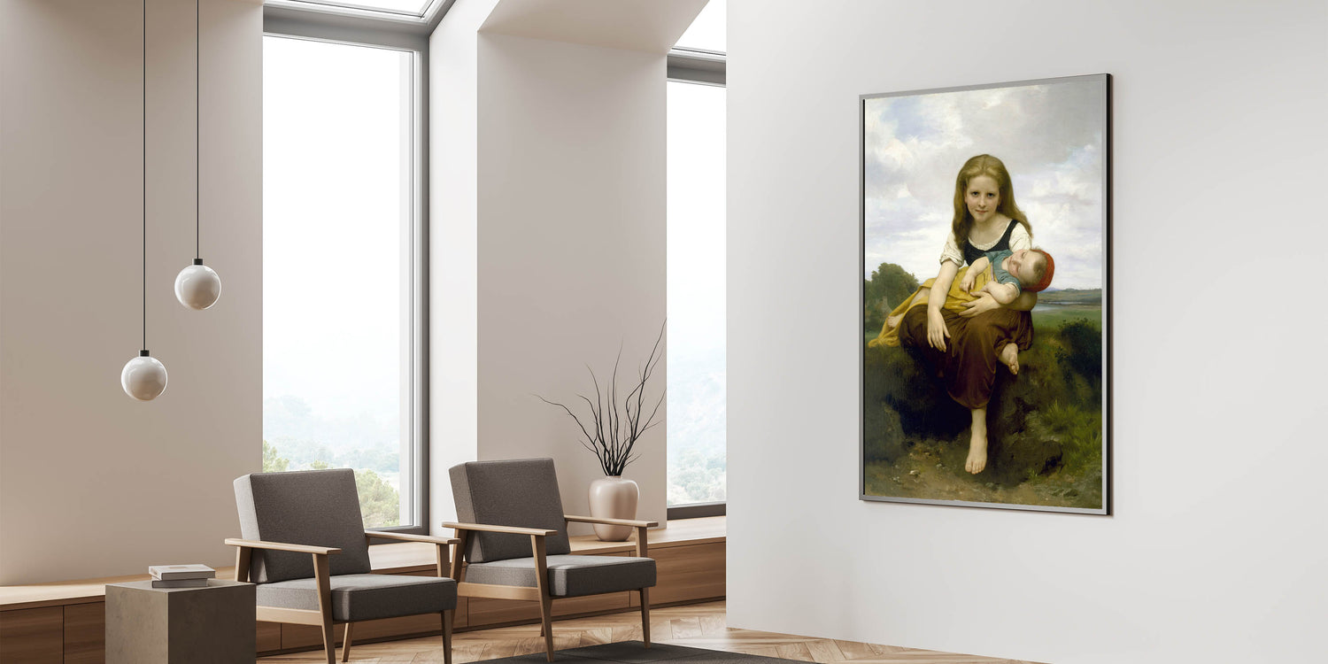 Add a touch of warmth and innocence to your decor with this realism art print by William Bouguereau, featuring a gentle portrait of a young girl holding her baby brother. This artwork beautifully captures the loving bond between siblings, with soft colors and delicate details that evoke a sense of tenderness and familial love. Bouguereau’s skilled brushwork brings life to this serene scene, making it an ideal piece for those who appreciate classical art and timeless beauty.