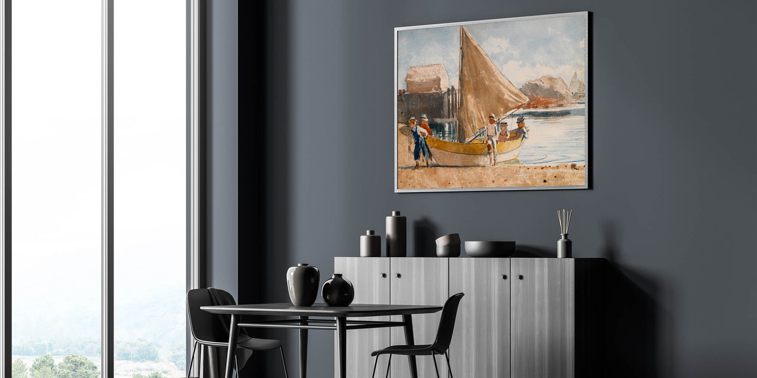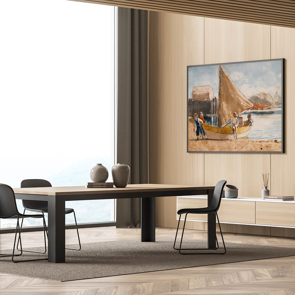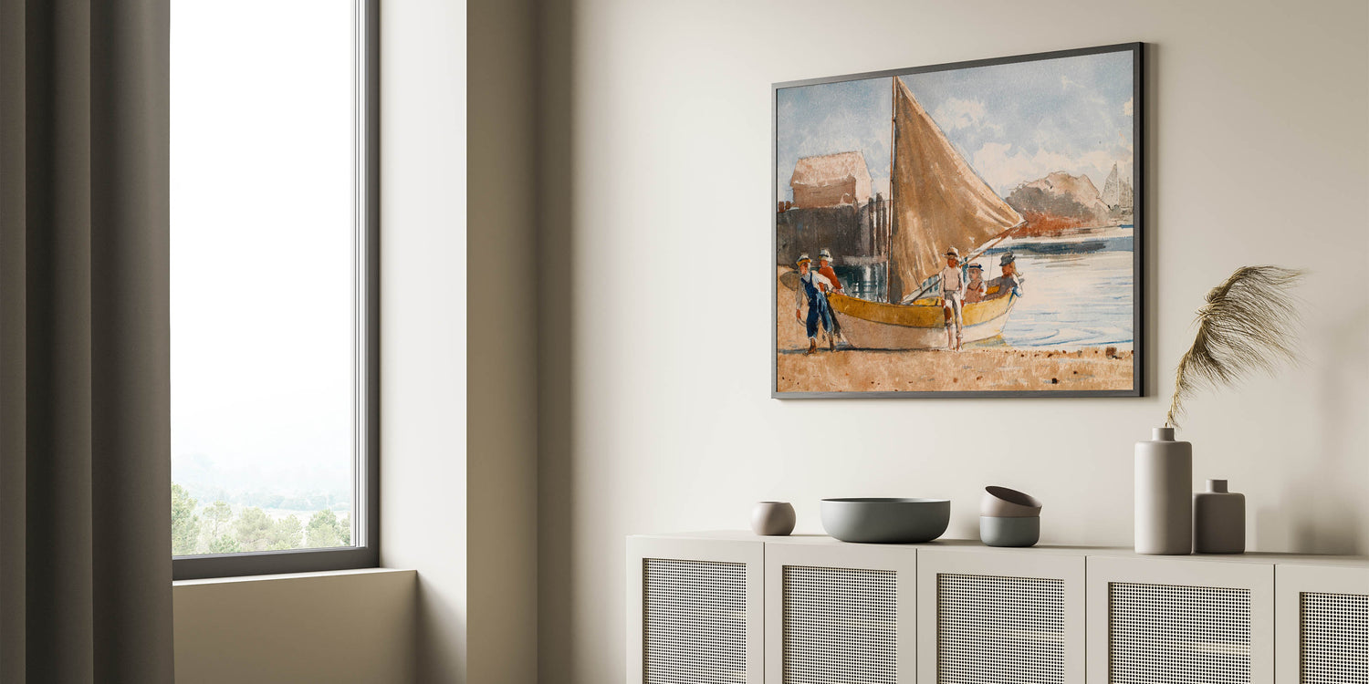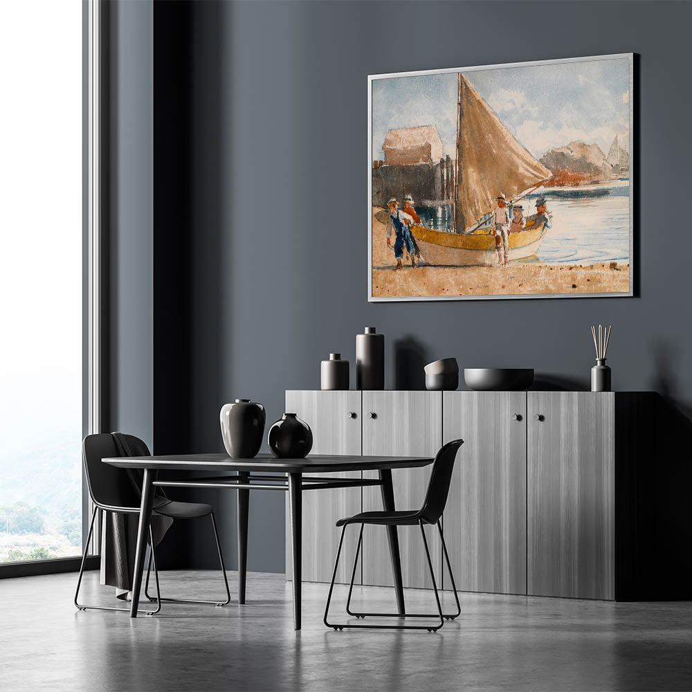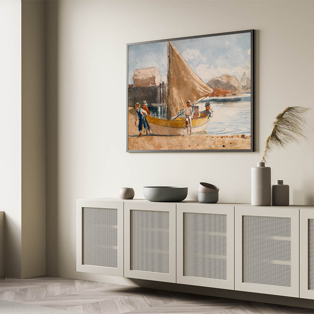 Capture the essence of a leisurely summer day with "Summertime" by Winslow Homer, a delightful realism art print depicting children and adults by the shore, preparing for a boat ride. With soft colors and gentle brushstrokes, Homer beautifully conveys the relaxed atmosphere of coastal life. This artwork brings warmth and nostalgia, making it a wonderful addition to beach-inspired decor or any space that seeks a touch of carefree summer joy.