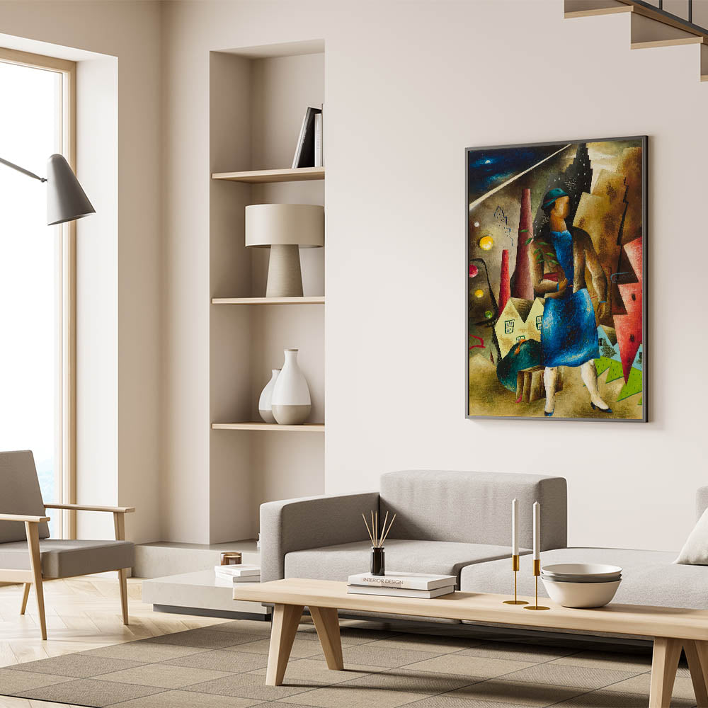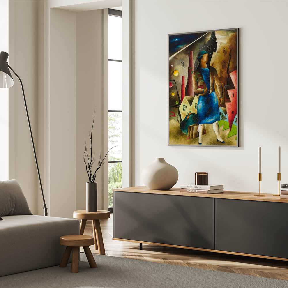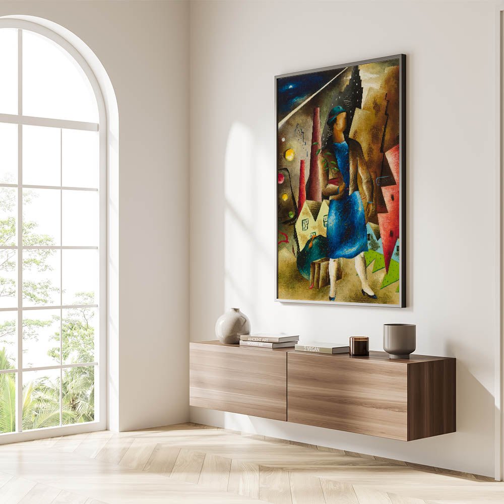 Introduce a bold and evocative statement to your space with this striking realism art print, featuring an abstract portrayal of a woman amidst an urban backdrop. Vibrant colors, geometric structures, and expressive brushstrokes come together to create a unique narrative of resilience and transformation. This detailed art realism piece is perfect for contemporary or eclectic interiors, adding depth and character to any room.
