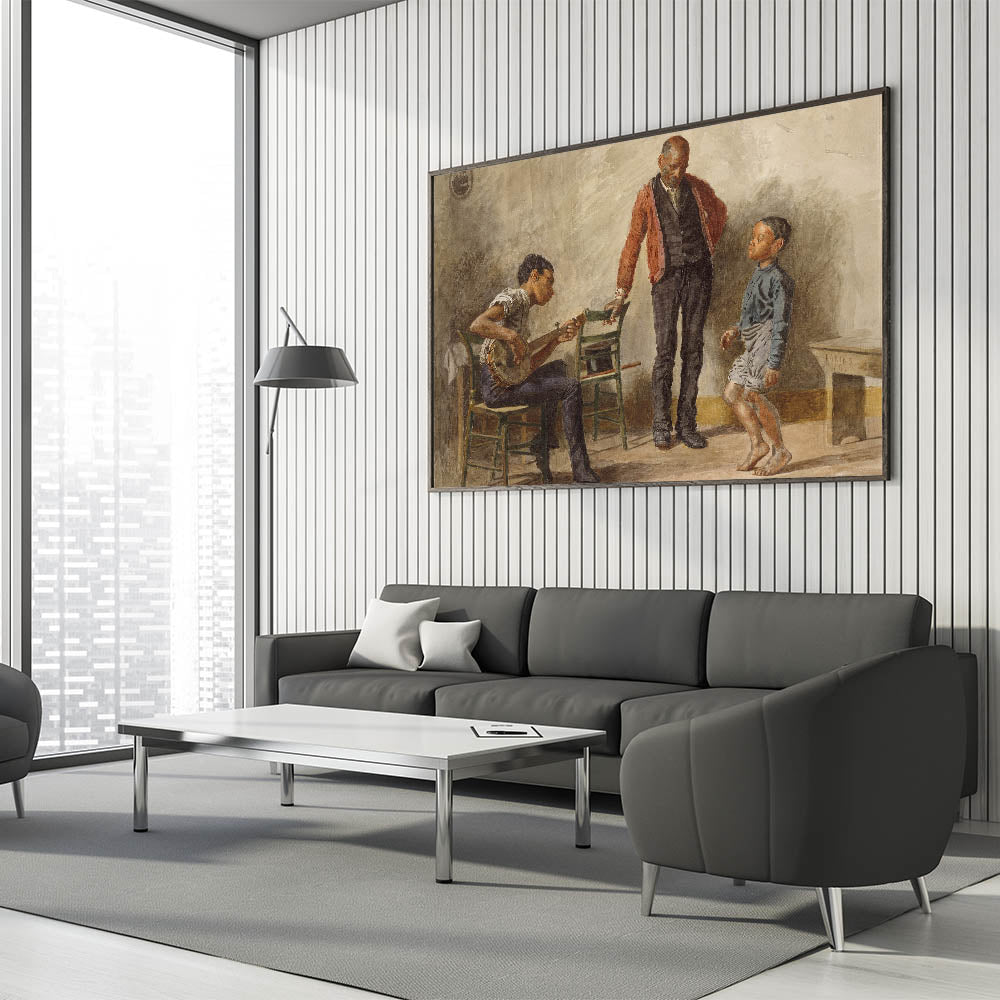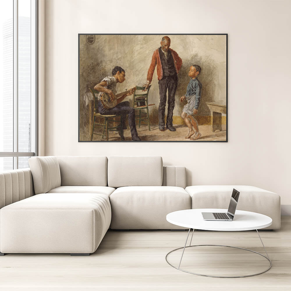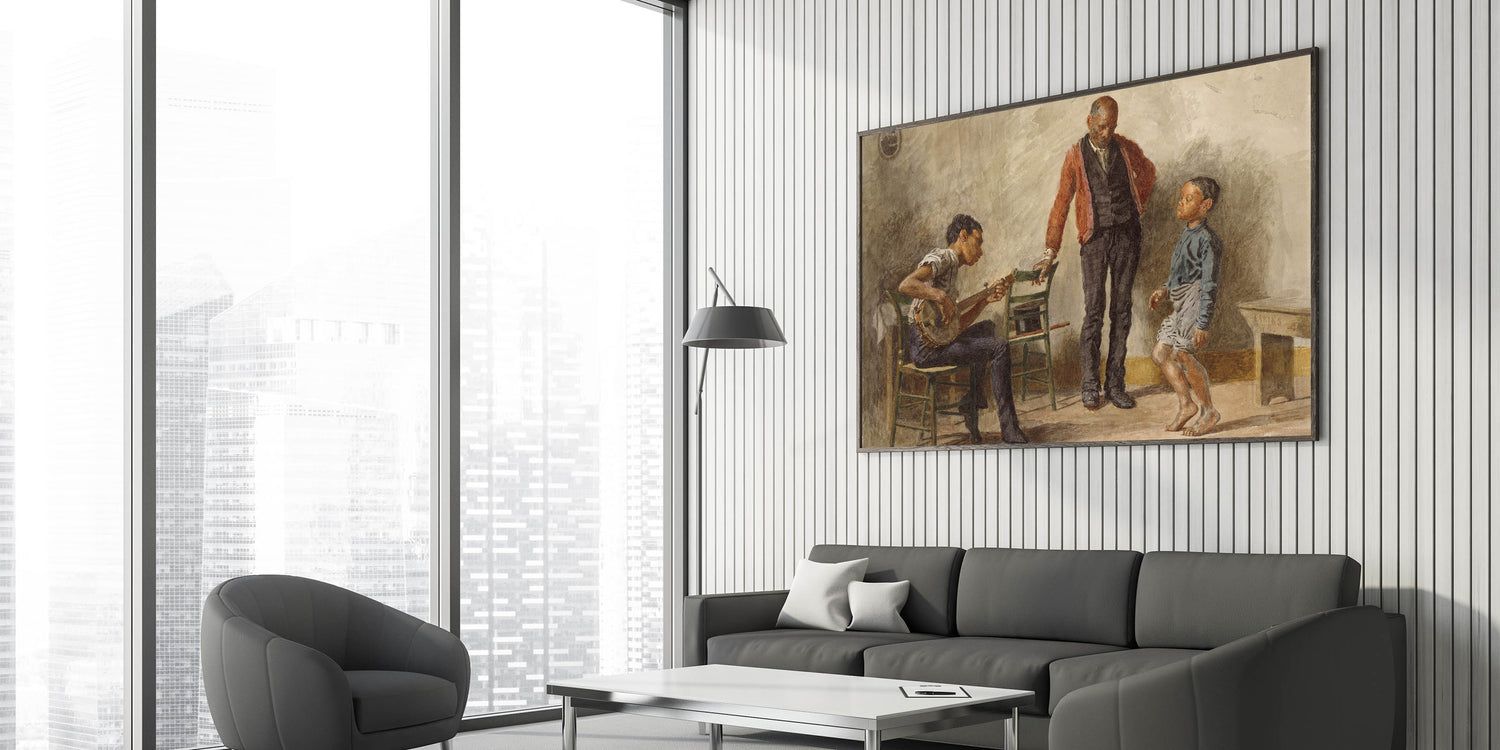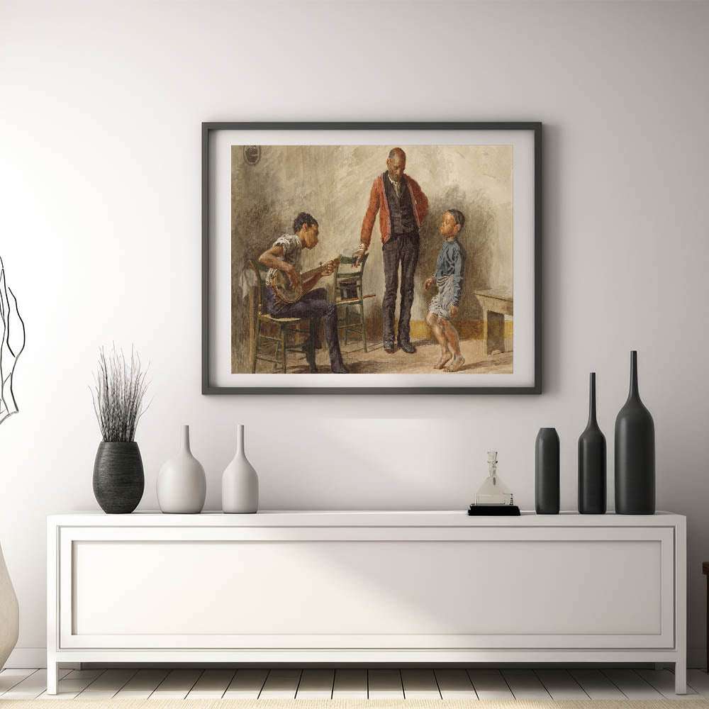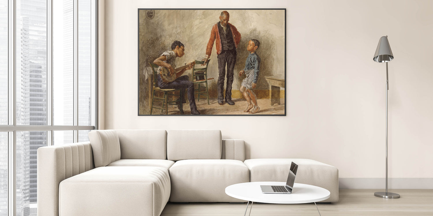 Celebrate the charm of everyday life with "The Dancing Lesson" by Thomas Eakins. This captivating Realism art print portrays an intimate moment between a child, a musician, and an observer, capturing the joy and simplicity of a dance lesson. The detailed expressions and lifelike postures make this piece a perfect addition for anyone who values art that tells a story.