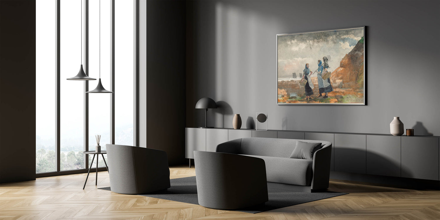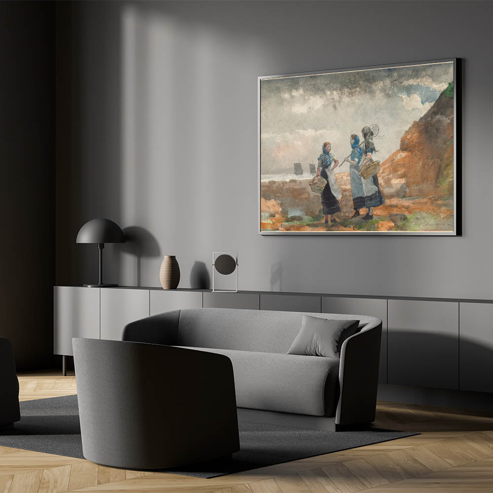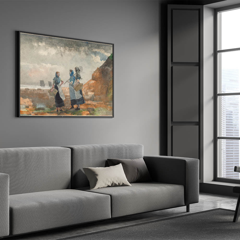 Step into the world of 19th-century coastal life with "Three Fisher Girls, Tynemouth" by Winslow Homer. This 1881 watercolor beautifully captures the resilience and camaraderie of three fisher girls standing along the rugged shores of Tynemouth. With their baskets in hand and determined expressions, they embody the hardworking spirit of the coastal communities. Homer's soft brushwork and use of color bring out the natural beauty of the seaside environment, making this artwork an excellent choice for those who appreciate Realism Art Prints for Home Decor. This piece brings a sense of strength and simplicity to any space, perfect for coastal or rustic decor themes.