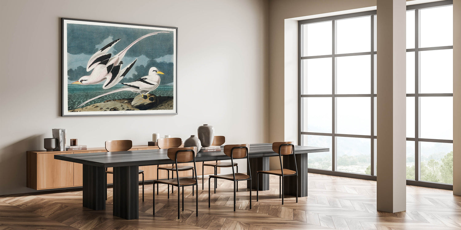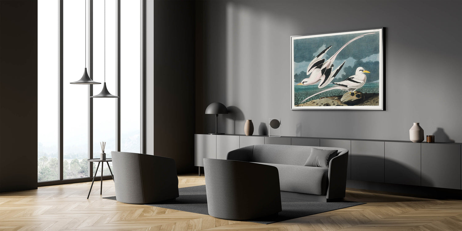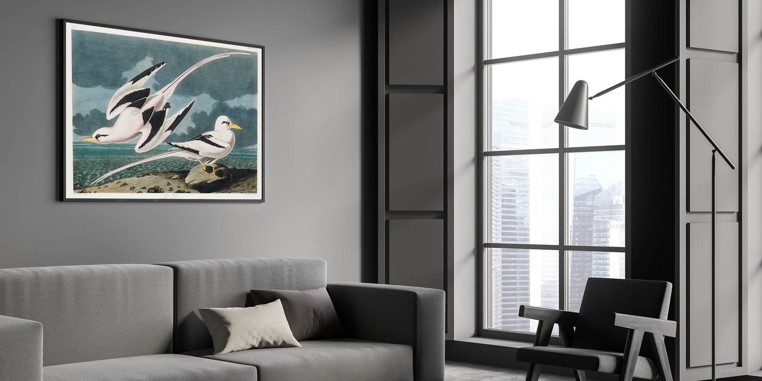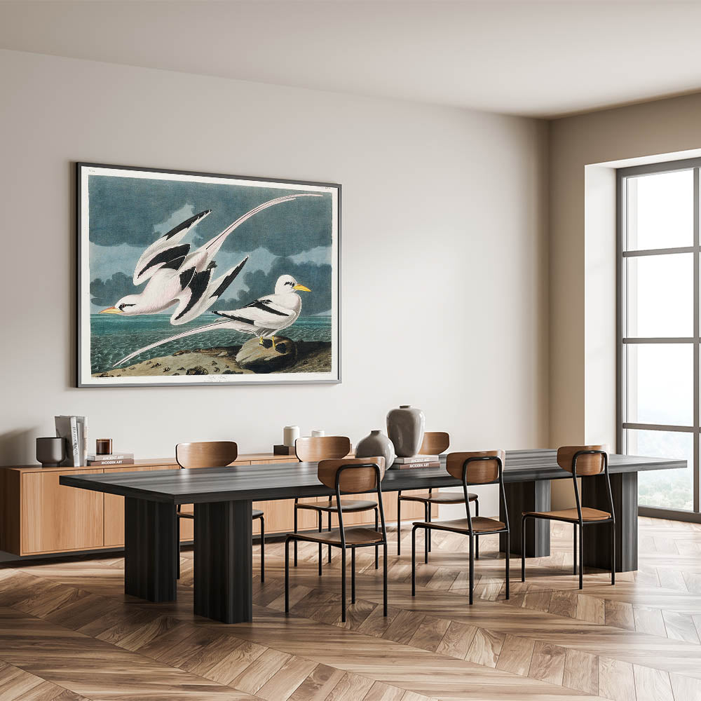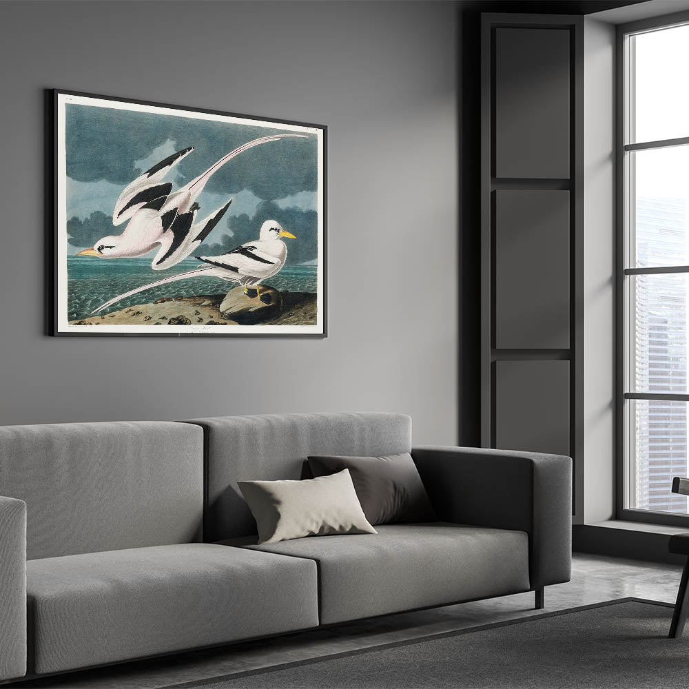 Experience the elegance of nature with "Tropic Bird" from John James Audubon's renowned Birds of America series, completed in 1827. This striking realism art print captures the graceful movement of the Tropic Bird in its natural coastal habitat. With delicate, elongated tail feathers and sharp contrasts of black and white against a stormy sky, Audubon’s mastery of detail and composition brings this tropical bird to life, showcasing both beauty and strength. Ideal for nature enthusiasts and bird lovers, this artwork adds sophistication to any room, making it a perfect addition for spaces seeking a touch of timeless elegance.