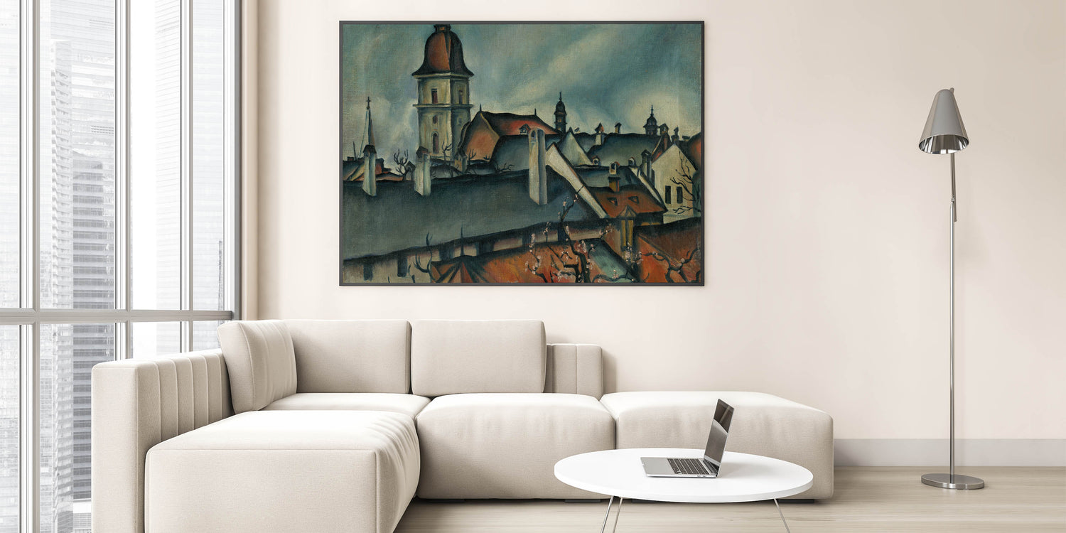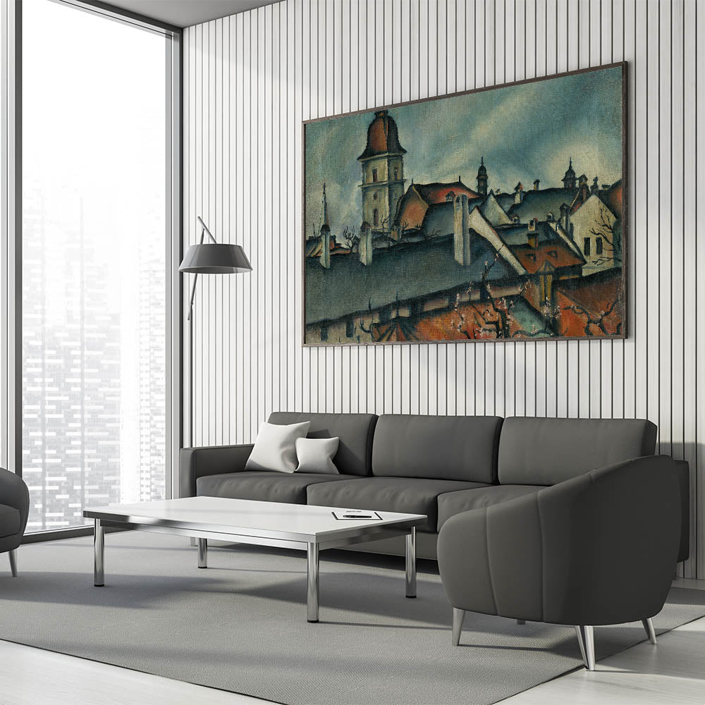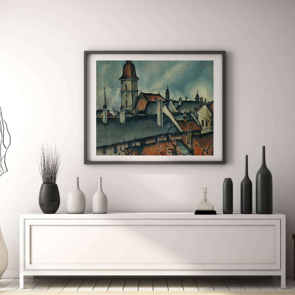 Capture the historic charm of "View of Košice" with this realism art print by Konštantín Bauer. This artwork beautifully portrays the rooftops and architecture of Košice, set against a moody sky that exudes old-world charm. Perfect for those who admire Realism Art Prints for Home Decor, this piece brings a touch of European architectural beauty to any interior.