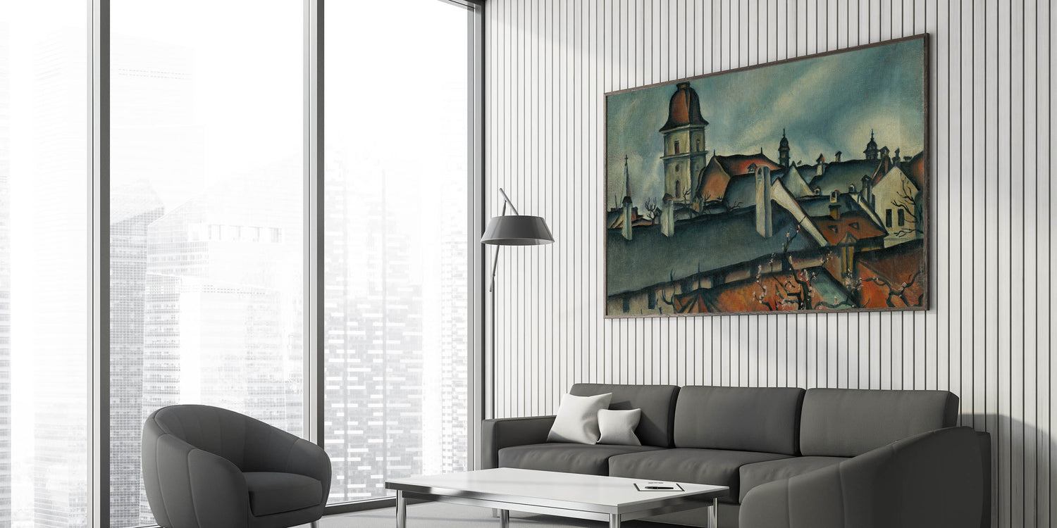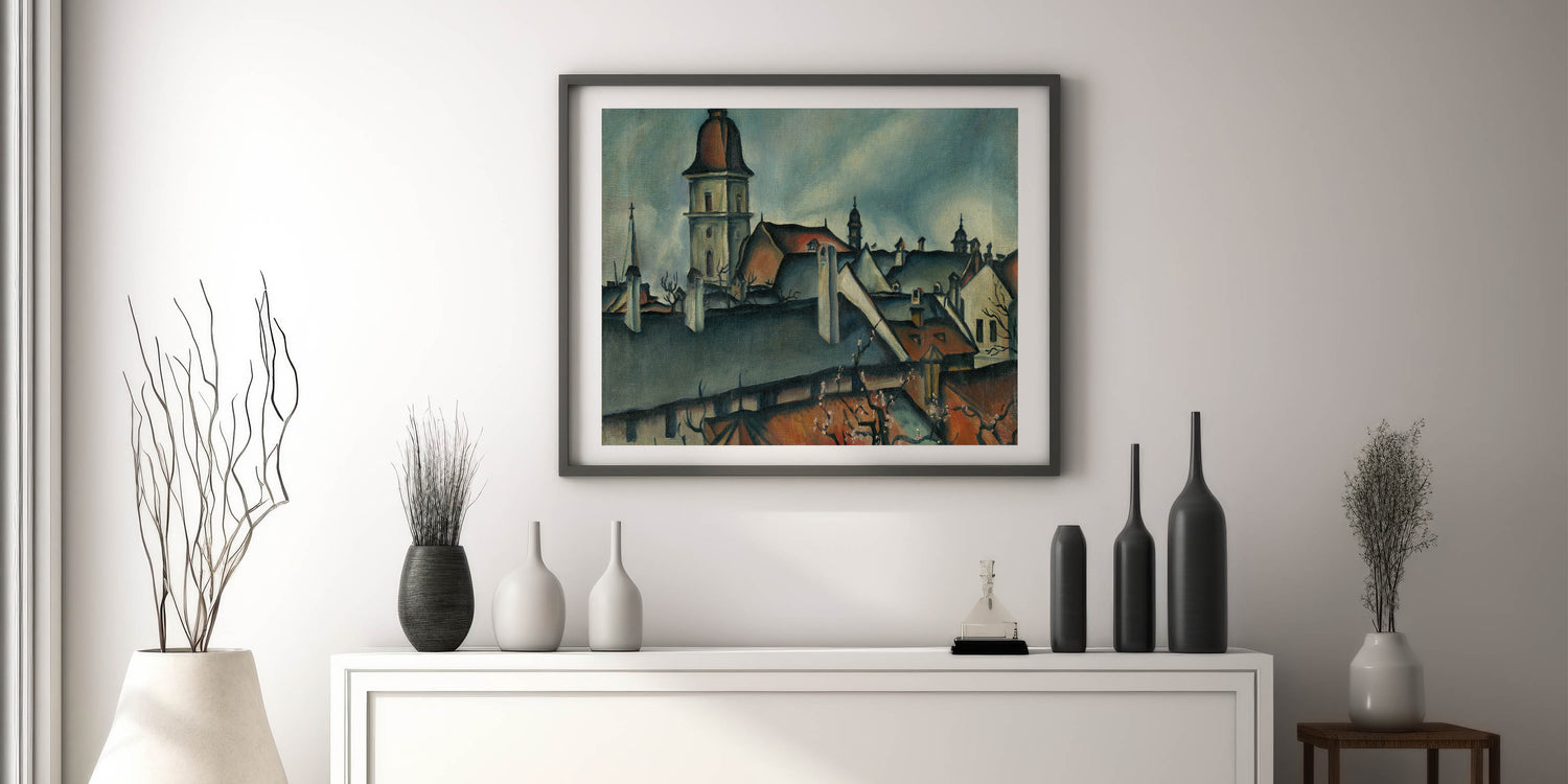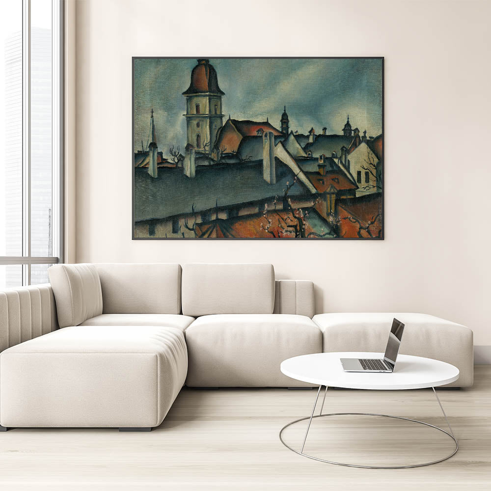 Capture the historic charm of "View of Košice" with this realism art print by Konštantín Bauer. This artwork beautifully portrays the rooftops and architecture of Košice, set against a moody sky that exudes old-world charm. Perfect for those who admire Realism Art Prints for Home Decor, this piece brings a touch of European architectural beauty to any interior.