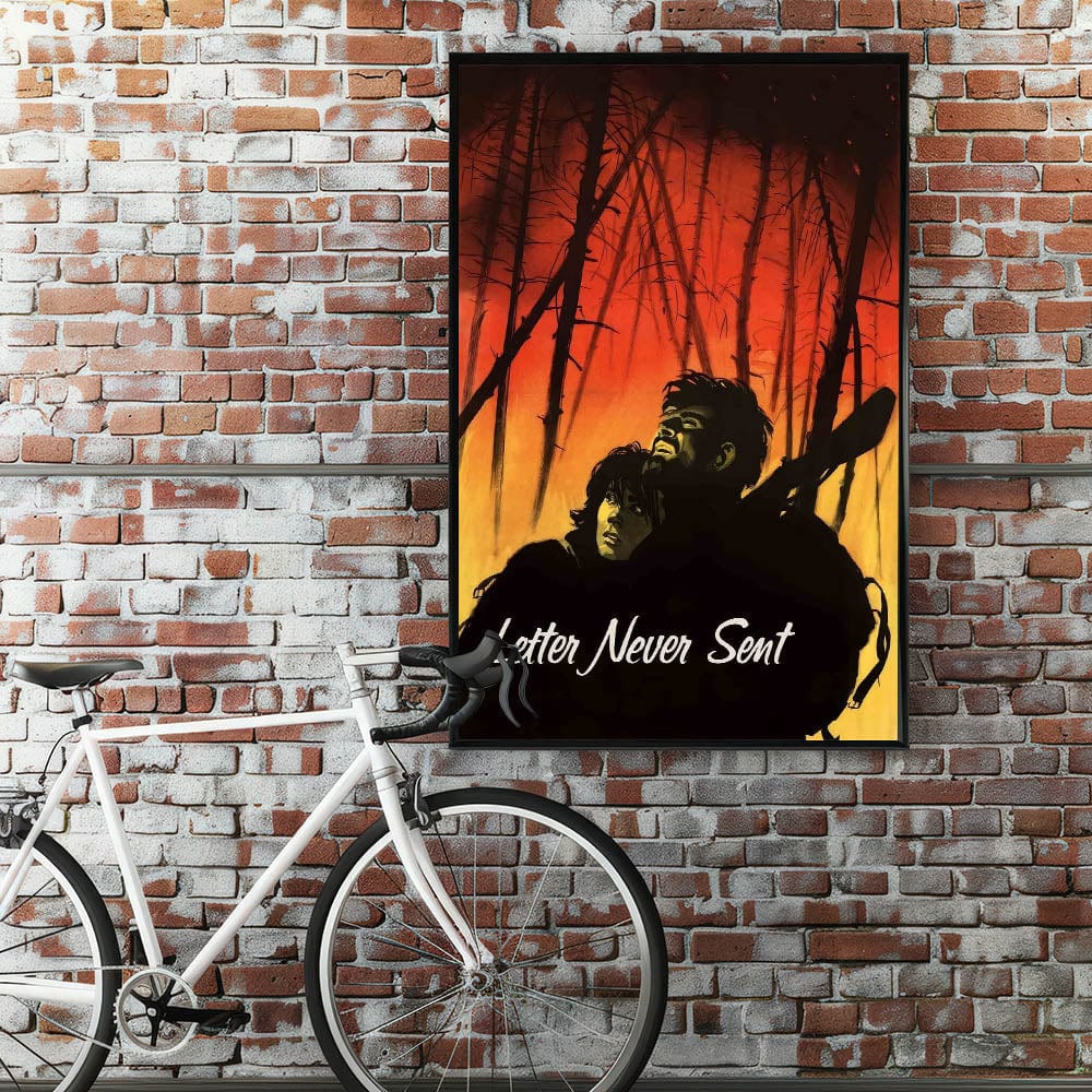 Capture the breathtaking drama of Soviet cinema with this Letter Never Sent vintage movie poster. This classic 60s movie print showcases a visually striking composition with a fiery red and orange backdrop, silhouetted figures, and a dramatic forest setting. The artwork reflects the intense survival story of the film, making it a must-have for lovers of mid-century movie posters.