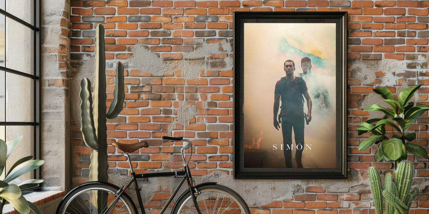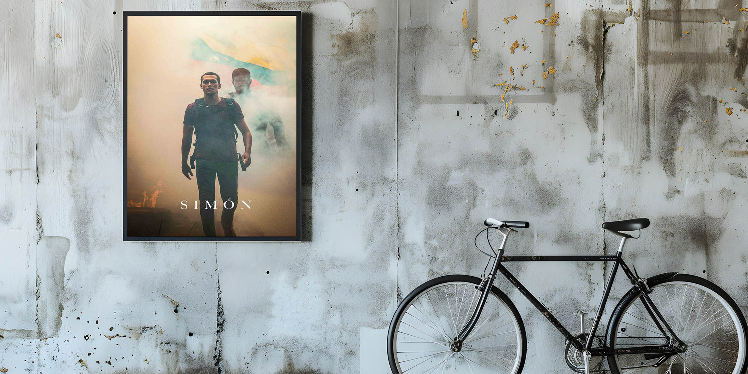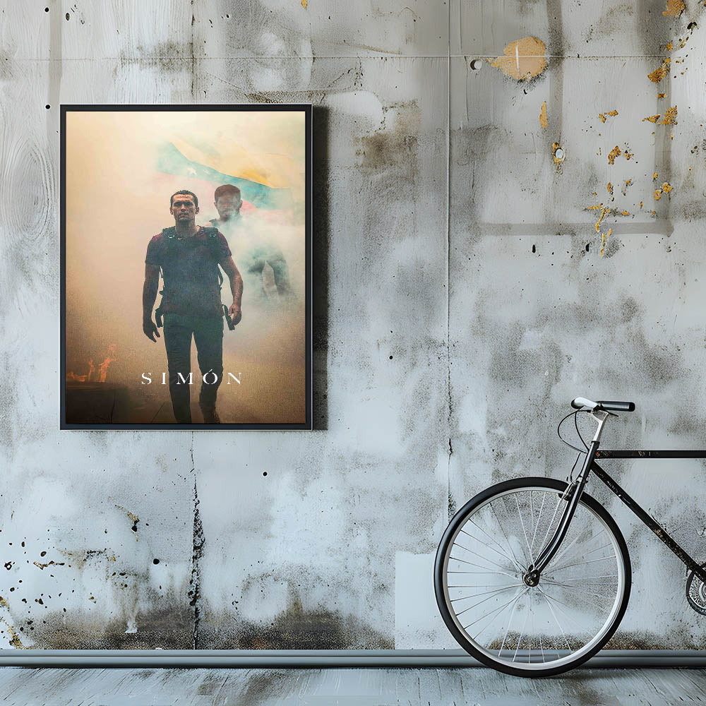 Experience the intensity of Simón with this 2020s vintage movie poster. Featuring a powerful image of the protagonist walking through a smoky landscape with the Venezuelan flag in the background, this poster embodies the strength and resilience of the film’s story. Simón is a gripping drama that portrays the struggles and perseverance of an individual in a turbulent time.