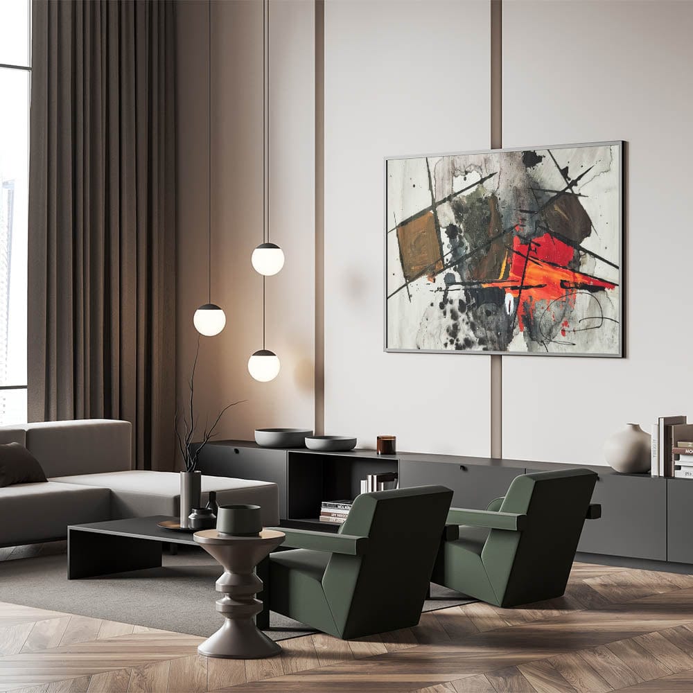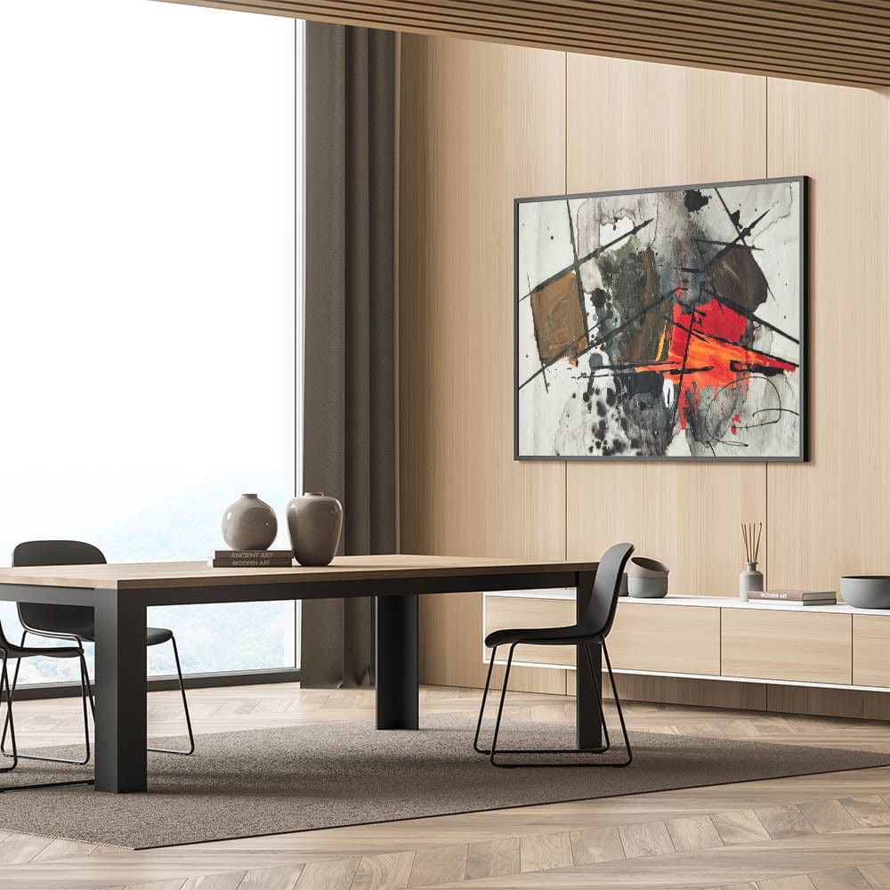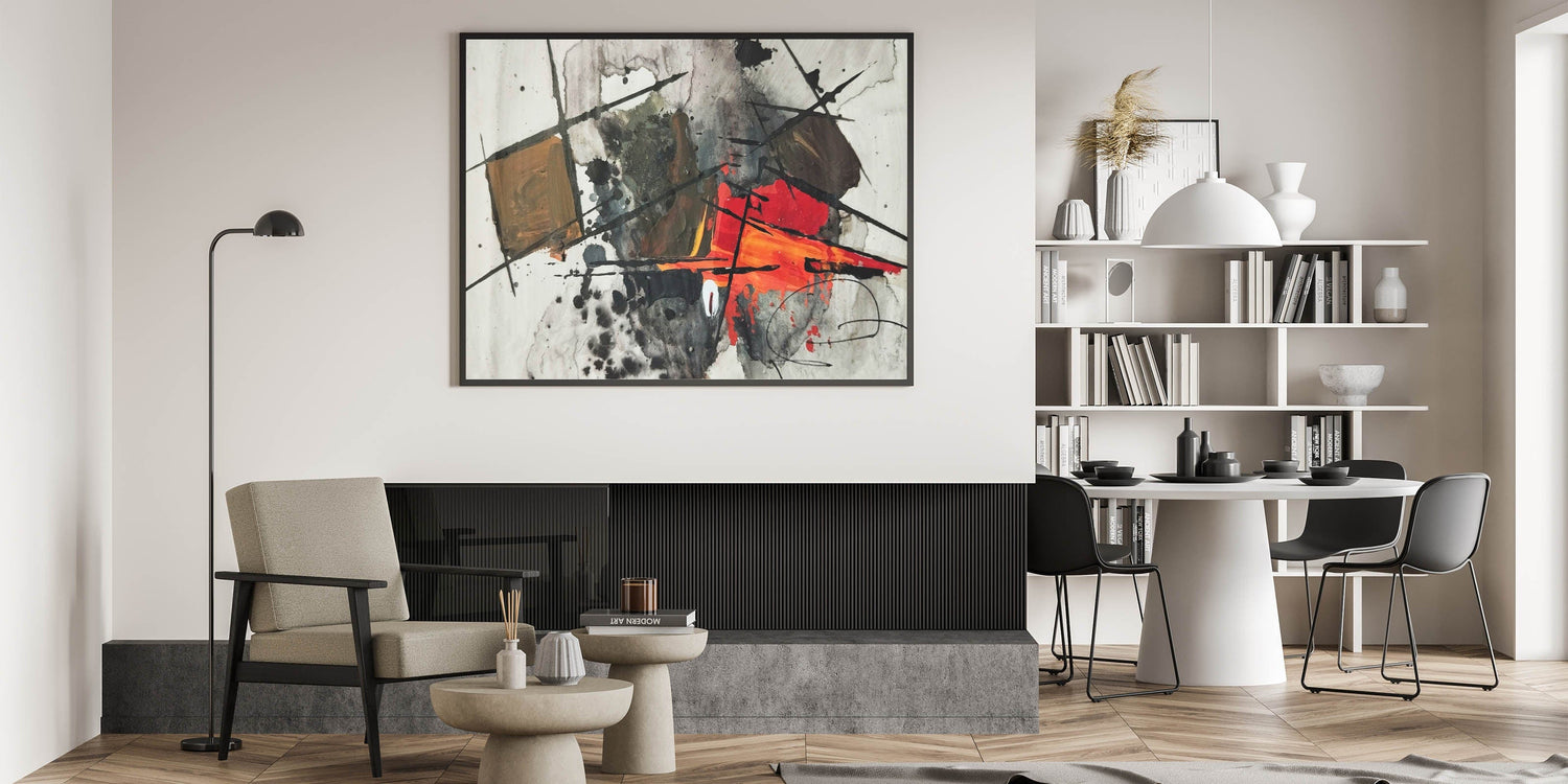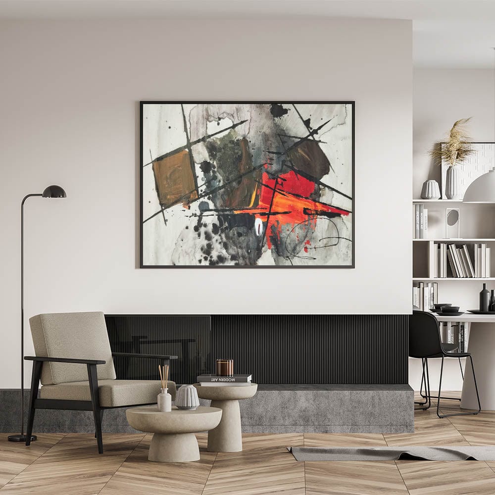 - A dynamic modern art print featuring fiery red, black, and earthy tones