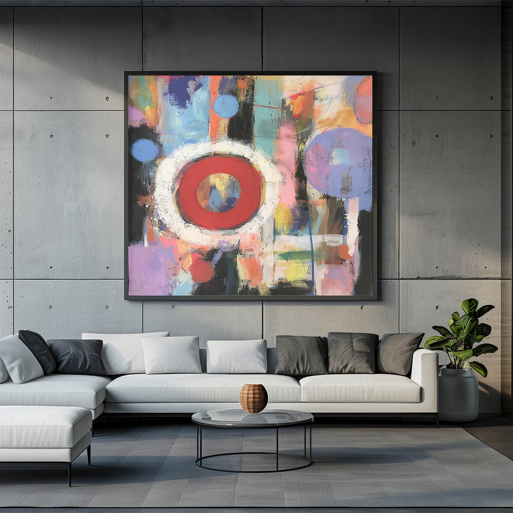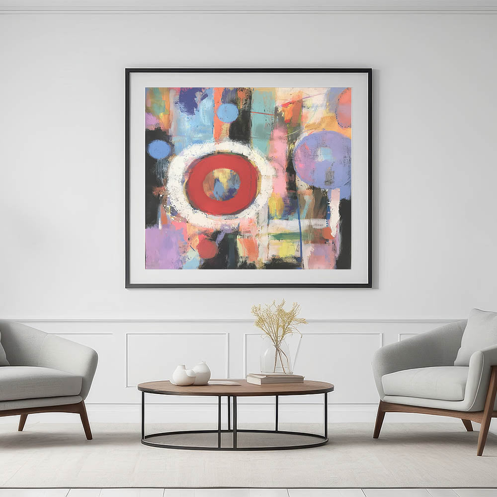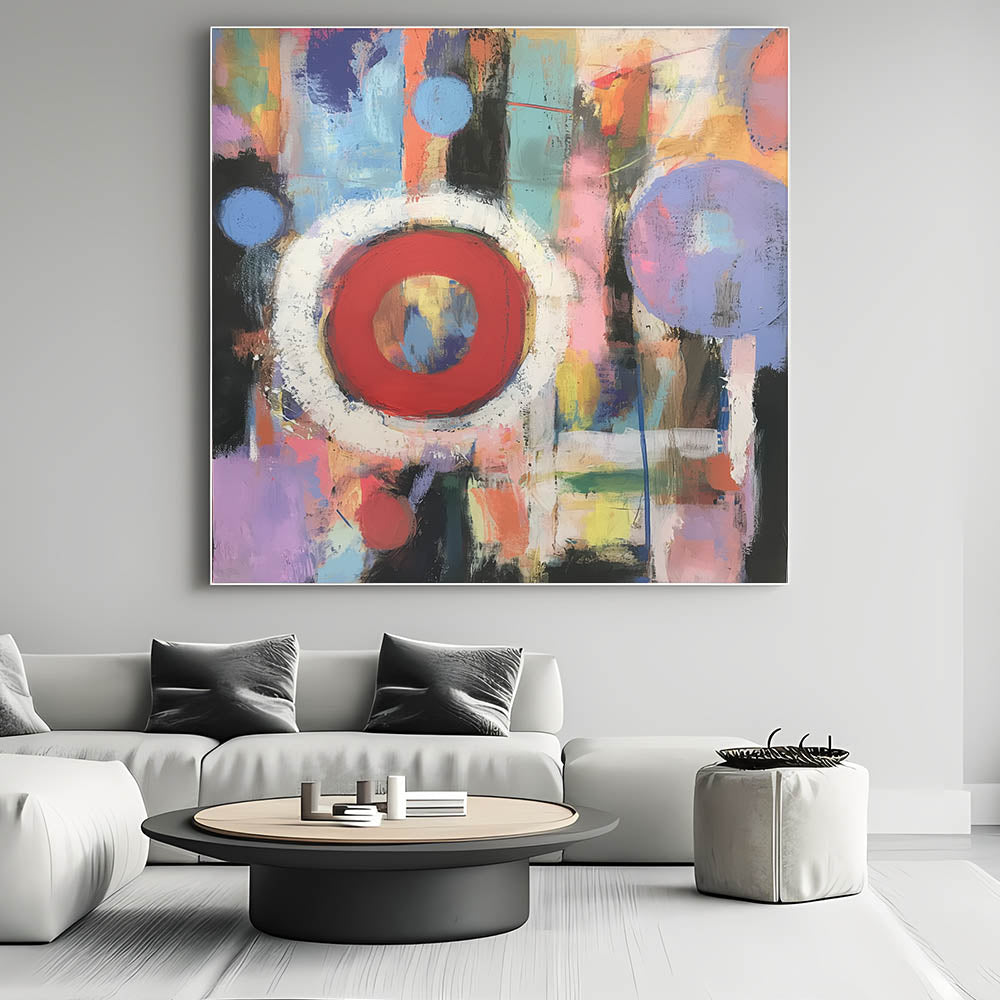 Bring energy and creativity to your space with this Geometric Abstract Wall Art, featuring bold circular designs surrounded by vibrant pastel tones of red, blue, pink, and yellow. The layered composition combines fluid brushstrokes and dynamic shapes to create an engaging piece perfect for eclectic or modern interiors. This artwork adds personality and warmth, making it an ideal choice for living rooms, offices, or creative environments.