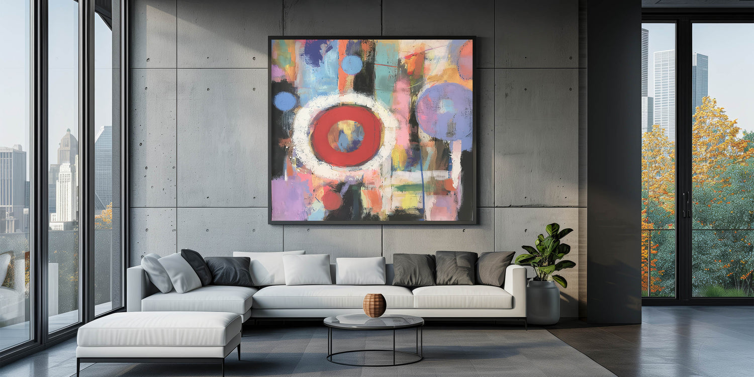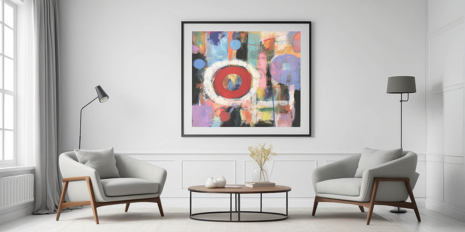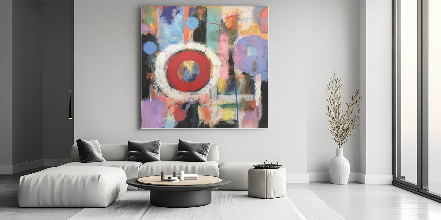 Bring energy and creativity to your space with this Geometric Abstract Wall Art, featuring bold circular designs surrounded by vibrant pastel tones of red, blue, pink, and yellow. The layered composition combines fluid brushstrokes and dynamic shapes to create an engaging piece perfect for eclectic or modern interiors. This artwork adds personality and warmth, making it an ideal choice for living rooms, offices, or creative environments.