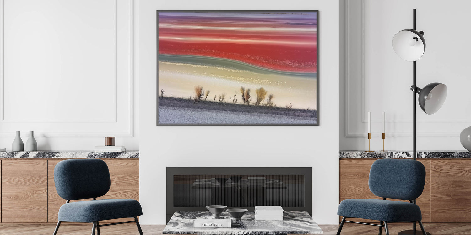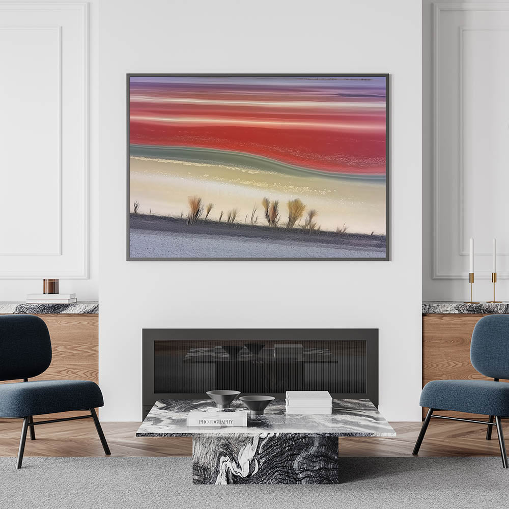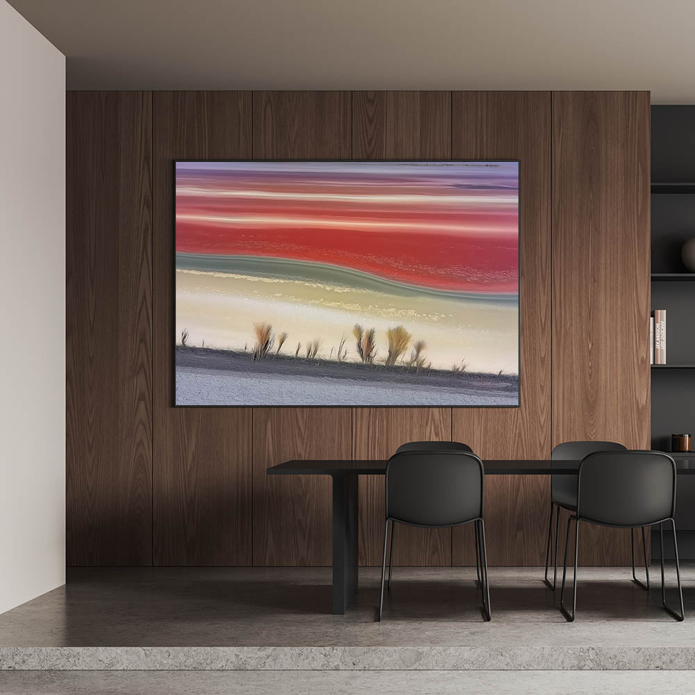 Enhance your workspace with this vibrant abstract office wall art, featuring a mesmerizing blend of red, beige, and muted blue tones. This stunning modern office art showcases a fluid landscape design, making it an ideal choice for corporate wall décor. The artistic combination of warm and cool hues creates a visually striking effect, perfect for business wall art collections.