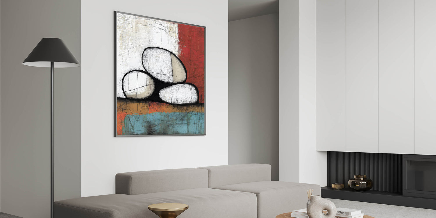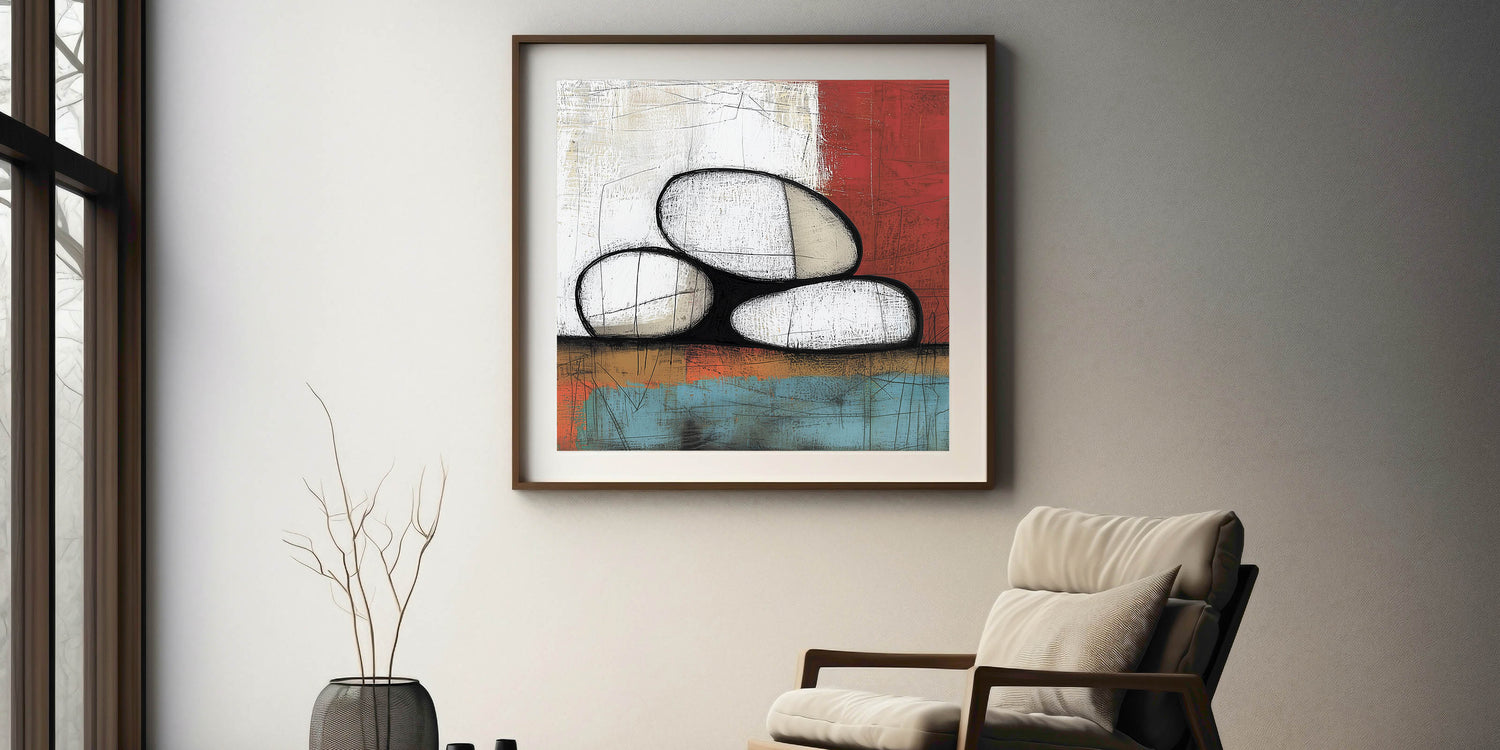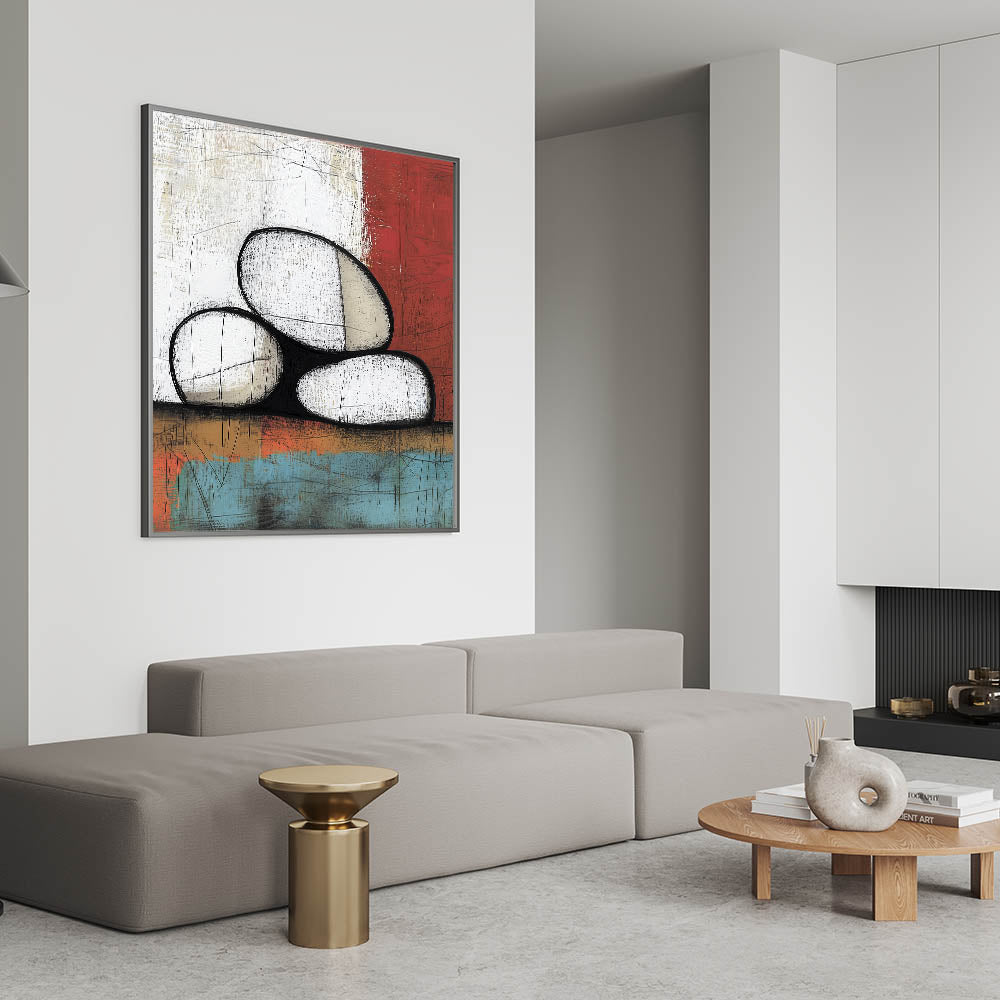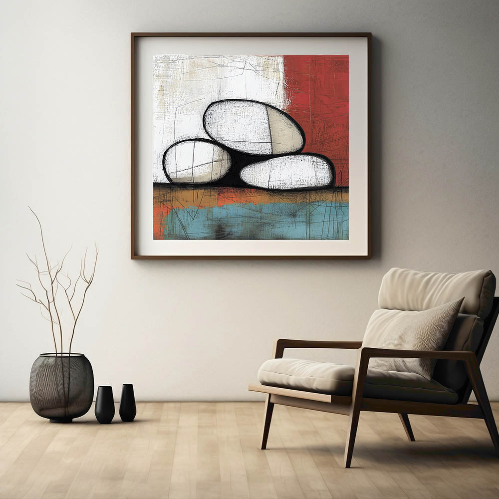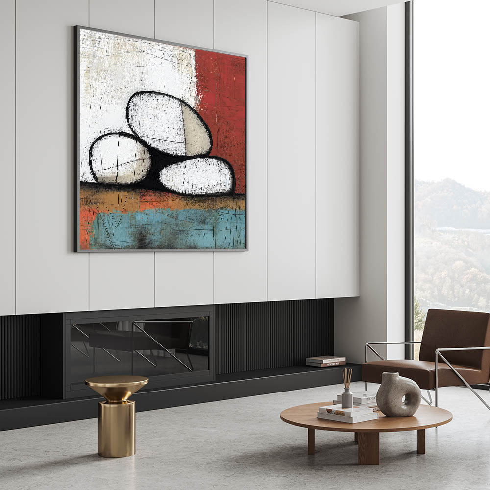 Enhance your space with this modern wall art, featuring a bold abstract representation of stacked stones in beige, black, red, and turquoise hues. The textured details and earthy color palette create a rustic yet contemporary feel, making this living room wall art a versatile choice for various interior styles. Whether displayed as canvas wall art or framed wall art, this piece adds a dynamic and artistic touch to modern living room decor.
