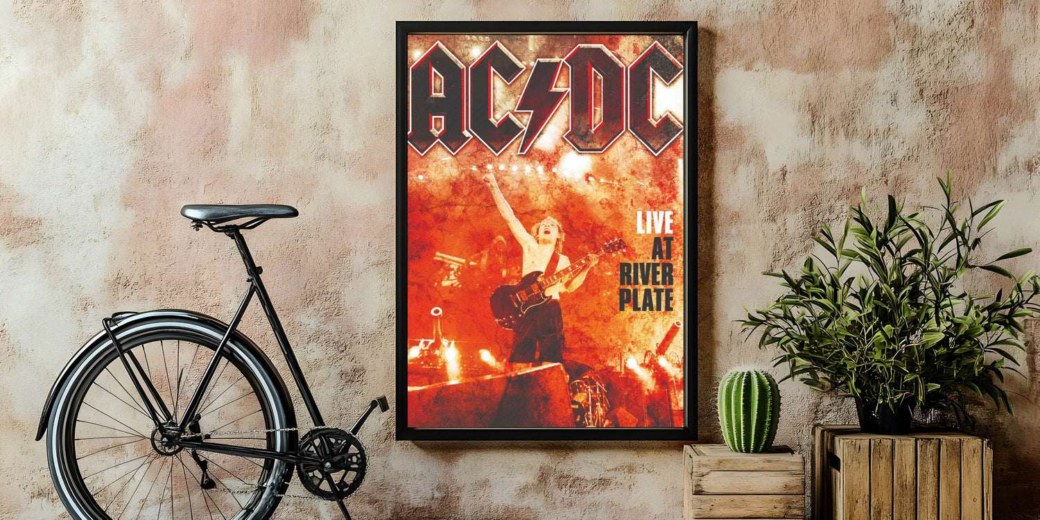 Bring the electrifying energy of AC/DC's legendary "Live at River Plate" concert into your space with this stunning vintage poster. Featuring a dramatic shot of the band’s iconic performance, this print captures the intensity and power of AC/DC live on stage. The fiery red background and striking image of the guitarist with his SG guitar make this piece an unforgettable addition to any music lover's decor.