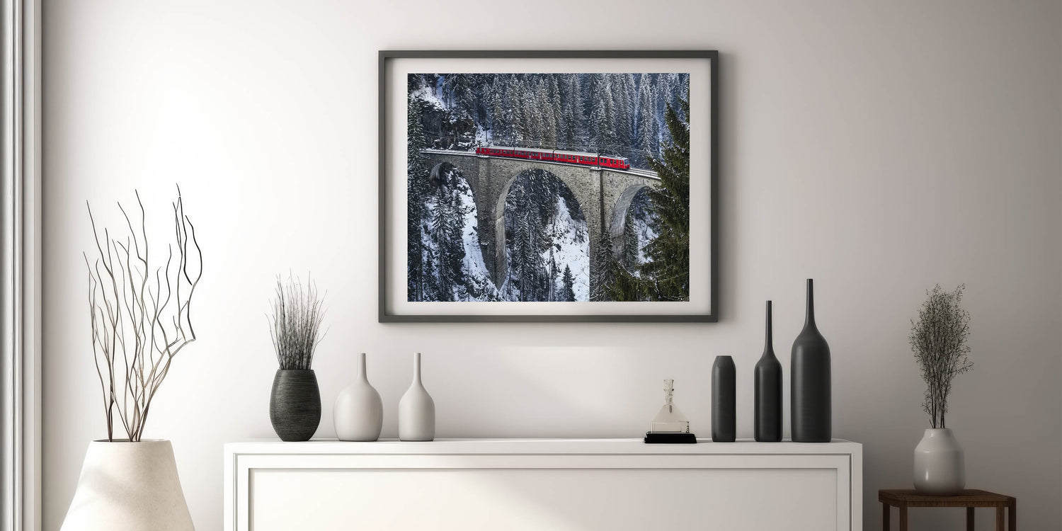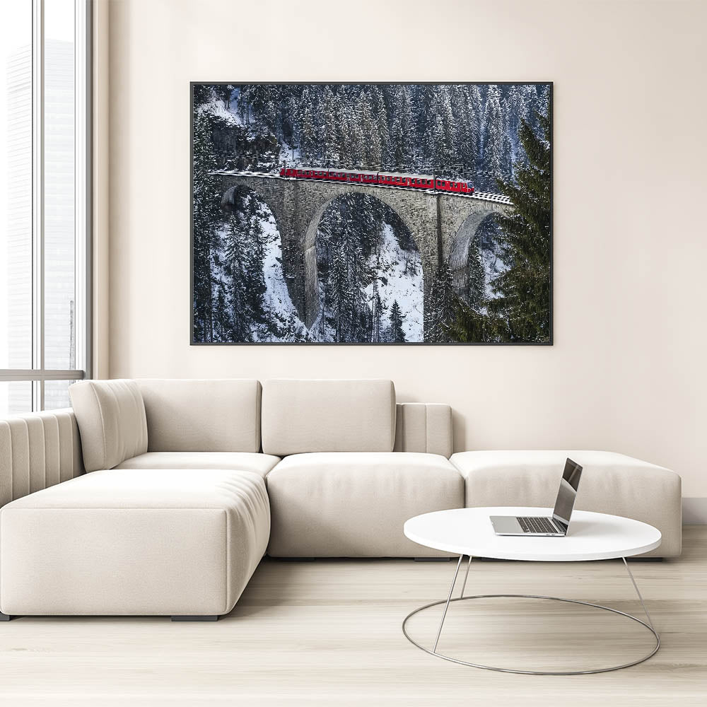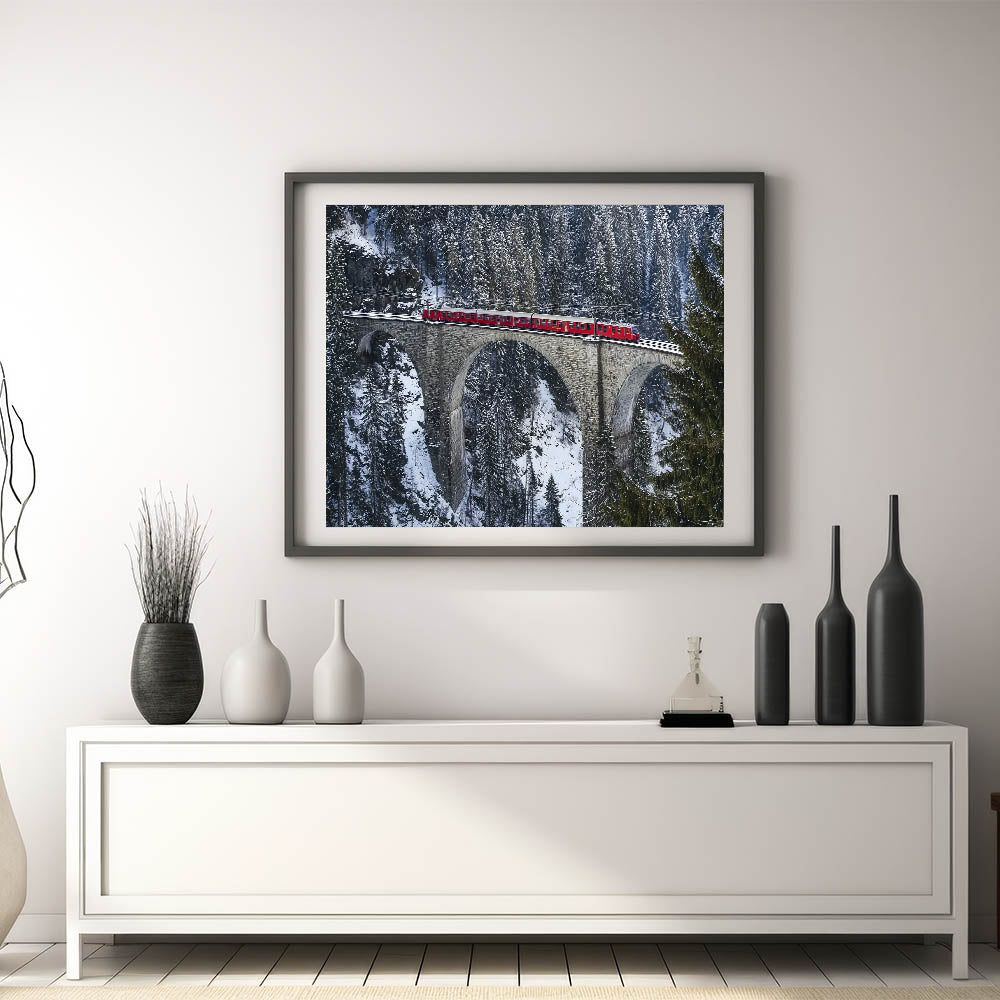 Perfect for travel enthusiasts and lovers of scenic winter photography, this bridge artwork adds a sense of adventure and elegance to any space. Its harmonious blend of natural and architectural beauty makes it an ideal piece for rustic, traditional, or modern interiors. Bring the wonder of alpine railways to your space with this exquisite winter train bridge print.