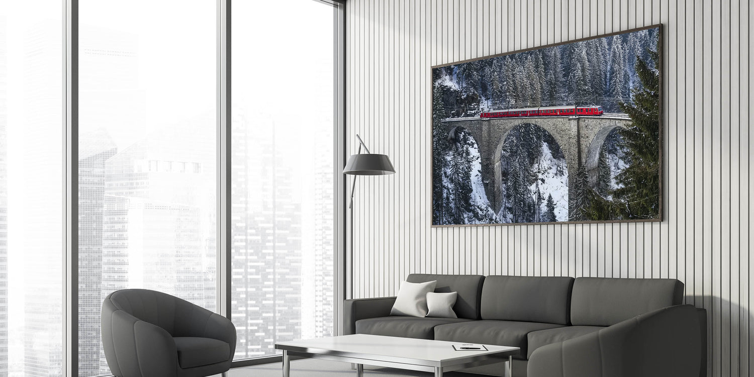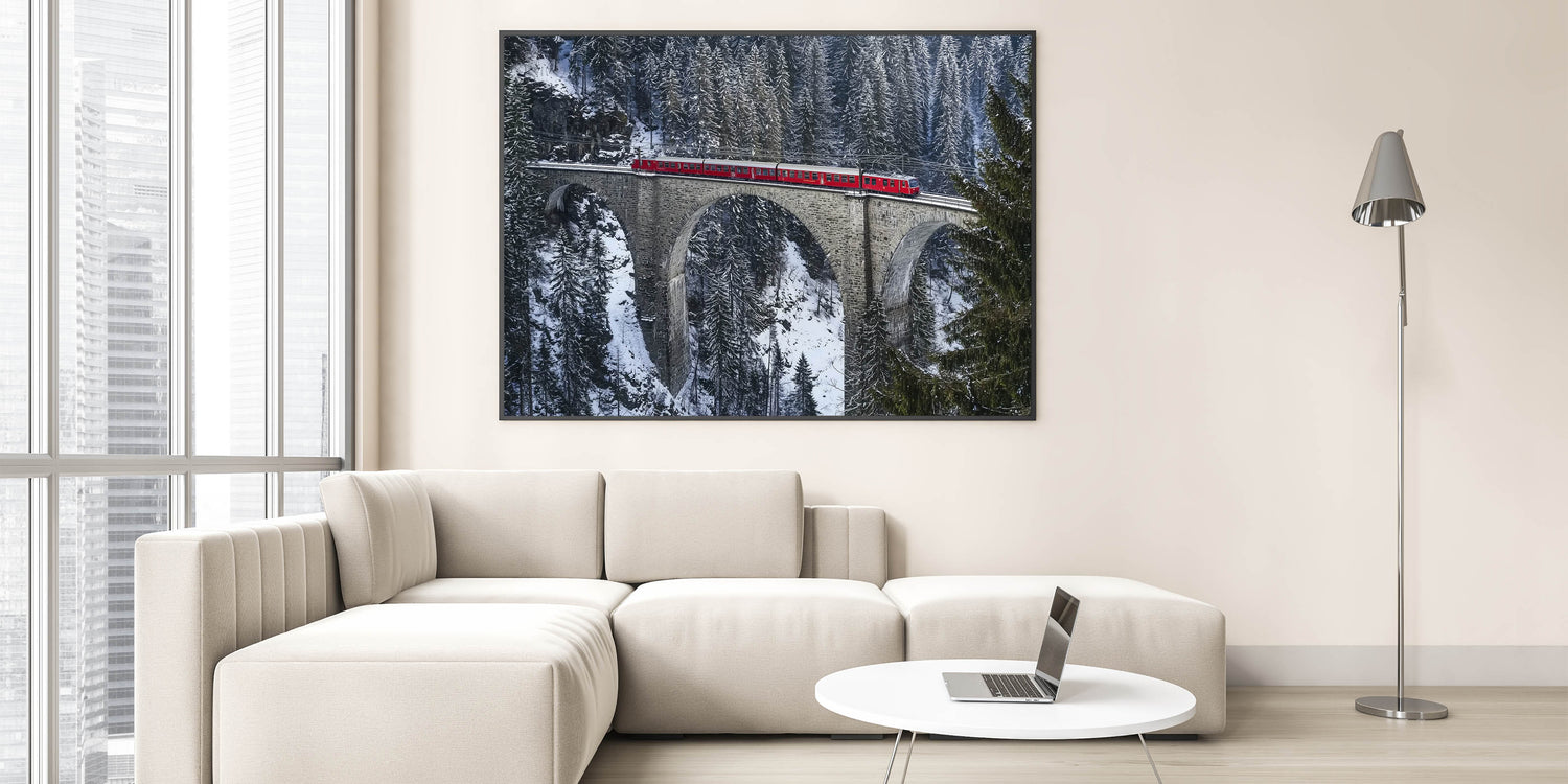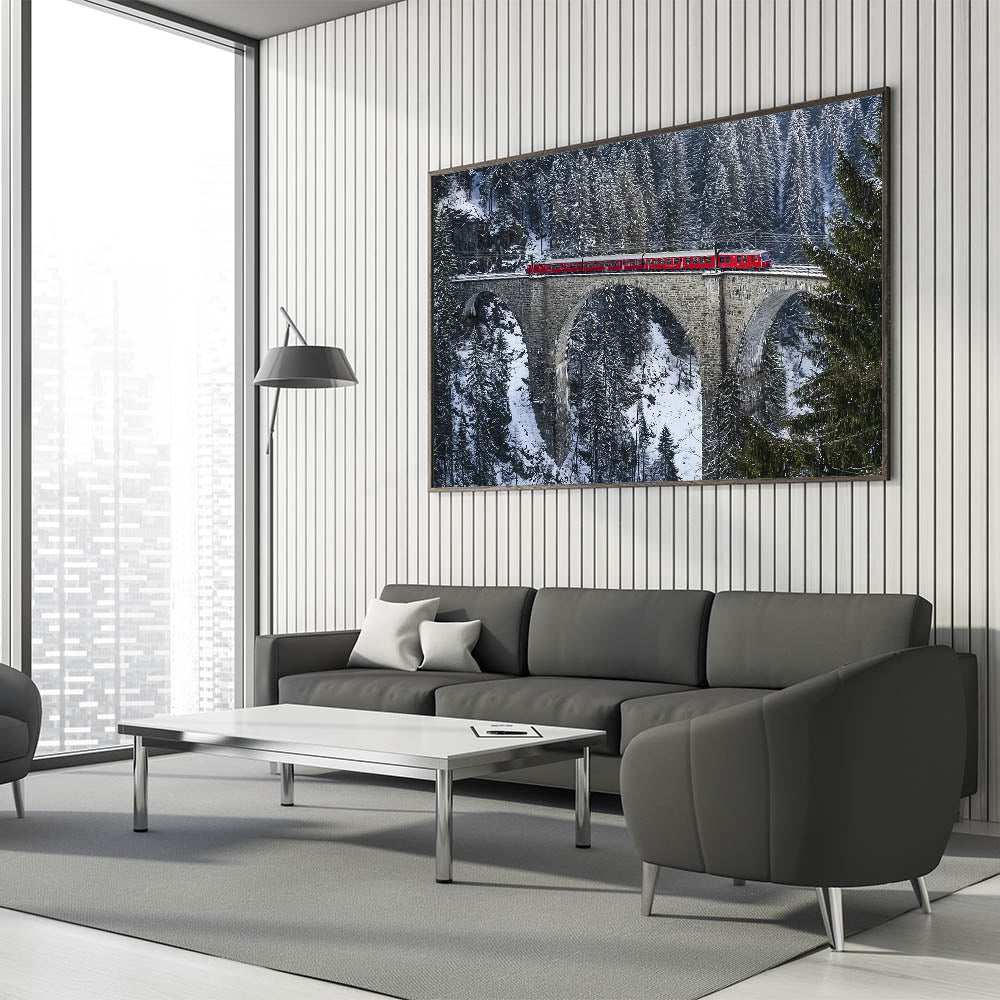Perfect for travel enthusiasts and lovers of scenic winter photography, this bridge artwork adds a sense of adventure and elegance to any space. Its harmonious blend of natural and architectural beauty makes it an ideal piece for rustic, traditional, or modern interiors. Bring the wonder of alpine railways to your space with this exquisite winter train bridge print.